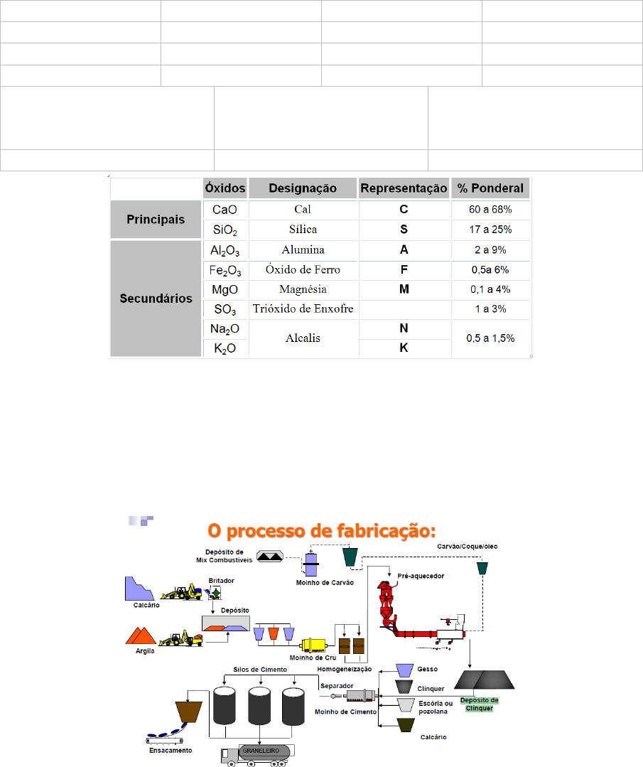 <p>CIMENTO</p><p>O que é cimento?</p><p>O cimento é uma commodity de baixa substitutibilidade. Presente em todo tipo de construção, dá mais</p><p>simples moradia até a mais complexa obra de infraestrutura, do início ao acabamento.</p><p>É o componente básico do concreto, que é o material mais consumido no planeta depois da água.</p><p>É um produto homogêneo, com variedade limitada de tipos e com especificações e processo de</p><p>fabricação semelhantes em todo o mundo.</p><p>Cimento Portland:</p><p>Cimento hidráulico produzido pela moagem de clínqueres constituídos essencialmente por silicatos de</p><p>cálcio hidráulicos e uma pequena quantidade de uma ou mais formas de sulfato de cálcio (ASTM C150 / NBR</p><p>5732).</p><p>O processo de fabricação:</p><p>Via Úmida - A matéria prima é moída e homogeneizada dentro da água.</p><p>Via Seca - A homogeneização se realiza a seco.</p><p>A primeira é a mais antiga e mais eficaz para obter homogeneização de materiais sólidos. Está em desuso pois</p><p>requer maior consumo de energia e está sendo substituída por via seca</p><p>Minério Fórmula Característica Função</p><p>Calcário cálcitico CaCO3 Teor de MgO de 0 a 4% sim</p><p>Calcário magnesiano MgCO3 Teor de MgO de 4 a 18% não</p><p>Calcário dolomítico CaMg(CO3)2 Teor de MgO maior que 18% não</p><p>Argila Al2O3</p><p>Fe2O3</p><p>SiO2</p><p>sim</p><p>Gesso CaSO4 sim</p><p>✓ Extração da matéria-prima</p><p>o Calcário: A principal matéria-prima do cimento é o calcário, que é extraído de pedreiras. Ele fornece o</p><p>carbonato de cálcio necessário para o processo.</p><p>o Argila: A argila é outra matéria-prima essencial, fornecendo silicatos de alumínio.</p><p>o Outros Materiais: Outros componentes, como minério de ferro e sílica, podem ser adicionados para</p><p>ajustar a composição química.</p><p>✓Britagem</p><p>O calcário e a argila são triturados em britadores para reduzir seu tamanho, facilitando o processamento</p><p>posterior. O material é então armazenado temporariamente em depósitos.</p><p>✓Pré-homogeneização e Dosagem</p><p>O material britado é transportado para a fábrica e armazenado em silos verticais ou armazéns horizontais.</p><p>Essa armazenagem pode ser combinada com uma função de pré-homogeneização que consiste em colocar por</p><p>camadas o calcário e a argila.</p><p>As matérias-primas selecionadas são depois dosificadas, tendo em consideração a qualidade do produto a</p><p>obter (clínquer). Essa dosagem é efetuada com base em parâmetros químicos pré-estabelecidos .</p><p>Clínquer - 75-80% de calcário 20-25% de argila.</p><p>✓Moagem do “cru”:</p><p>Granulometria 3% retida peneira 100 (0,150 mm) e 13% 170 (0,088mm)</p><p>A mistura de calcário e argila (e possivelmente outros materiais) é moída finamente em um moinho de cru,</p><p>formando um pó fino conhecido como "farinha crua". Essa moagem é crucial para garantir que os componentes</p><p>sejam misturados de maneira homogênea. Simultaneamente à moagem ocorre um processo de adição de</p><p>outros materiais: areia (SiO2), cinzas de pirite (Fe2O3) e bauxite (Al2O3), de forma a obter as quantidades</p><p>pretendidas dos compostos que constituem o "cru": cálcio, sílica, alumínio e ferro, essenciais na fabricação do</p><p>cimento.</p><p>✓Homogeneização</p><p>A mistura de “cru”, devidamente dosada e com a finura adequada, deve ter a sua homogeneização assegurada</p><p>para permitir uma perfeita combinação dos elementos formadores do Clínquer.</p><p>A homogeneização é executada em silos verticais de grande porte, através de processos pneumáticos e por</p><p>gravidade.</p><p>✓Pré-aquecimento</p><p>A farinha crua é alimentada em uma torre de pré-aquecimento onde é aquecida por gases quentes provenientes</p><p>do forno. Esse pré-aquecimento reduz a quantidade de combustível necessária no forno, tornando o processo</p><p>mais eficiente. será aquecido ao passar pela torre de ciclones, onde é iniciado a fase de pré-aquecimento. Na</p><p>torre dá-se a descarbonatação e inicia-se a pré-calcinação do material.</p><p>MgCO3 (sólido) (340°C) → MgO (sólido) + CO2 (gasoso)</p><p>CaCO3 (sólido) → CaO (sólido) + CO2 (gás)</p><p>2CaO + SiO2 (1200°C) → 2CaO.SiO2 = silicato dicálcico -belita</p><p>2CaO.SiO2 + CaO (1260 a 1450°C) → 3CaO.SiO2 = silicato tricálcico – alita</p><p>NO FORNO - Clínquerização: A mistura de CaO, SiO₂, Al₂O₃ e Fe₂O₃ é aquecida a cerca de 1450°C, formando</p><p>os principais compostos do cimento: C3S, C2S, C3A, e C4AF.</p><p>C3S - Silicato Tricálcico - (3CaO • SiO2); 10% a 20%</p><p>C2S - Silicato Bicálcico (2CaO • SiO2); - 40% a 70%</p><p>C3A - Aluminato Tricálcico (3CaO • Al2O3); - 7% a 15%</p><p>C4AFe - Ferro aluminato Tetracálcico (4CaO • Al2O3 • Fe2O3). - 7% a 15%</p><p>• C3S (silicato tricálcico): Formado pela reação entre CaO e SiO₂. Contribui para a resistência inicial do</p><p>cimento.</p><p>• C2S (silicato dicálcico): Também formado pela reação entre CaO e SiO₂, mas em proporção diferente.</p><p>Contribui para a resistência a longo prazo.</p><p>• C3A (aluminato tricálcico): Formado pela reação de CaO com Al₂O₃. Afeta o tempo de pega e a reatividade</p><p>do cimento.</p><p>• C4AF (ferrato tetracálcico): Formado pela reação de CaO, Al₂O₃ e Fe₂O₃. Dá cor ao clínquer e influencia a</p><p>velocidade de hidratação.</p><p>C2S (Silicato Dicálcico)</p><p>• Resistência: Ganha importância no processo de endurecimento em idades mais avançadas, sendo</p><p>largamente responsável pelo ganho de resistência a um ano ou mais. Contribui pouco para a</p><p>resistência inicial.</p><p>• Calor de Hidratação: Pouco contribui para a liberação de calor durante a hidratação.</p><p>• Tempo de Pega: Hidrata lentamente e, portanto, não influencia o tempo de pega do cimento.</p><p>C3S (S