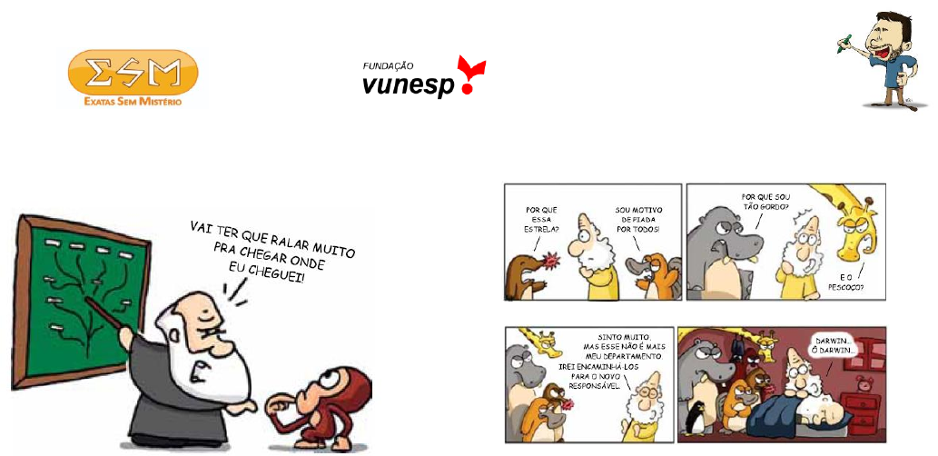 <p>Prof. Gustavo Baviera</p><p>1</p><p>exatassemmisterio.com.br WhatsApp: 12 98853 4263</p><p>Revisão Evolução – Vunesp</p><p>1. (Santa Casa 2019) Na charge, o personagem Darwin mostra</p><p>uma árvore filogenética a um chimpanzé.</p><p>(www.umsabadoqualquer.com)</p><p>A argumentação da personagem na charge é</p><p>a) procedente, pois o genoma dos humanos e dos chimpanzés</p><p>apresentam poucas semelhanças.</p><p>b) improcedente, pois os humanos e os chimpanzés não</p><p>compartilham características de um ancestral comum.</p><p>c) improcedente, pois, se os humanos e os chimpanzés</p><p>coexistem, ambas as espécies são igualmente evoluídas.</p><p>d) procedente, pois os seres humanos são mais adaptados ao</p><p>ambiente natural do que os chimpanzés.</p><p>e) procedente, pois, apesar de serem espécies atualmente</p><p>distintas, o homem evoluiu dos macacos.</p><p>2. (Facisb 2017) Analise a tirinha de Carlos Ruas.</p><p>Darwin explicaria aos animais, a partir de sua teoria, que essas</p><p>formas consideradas estranhas por eles</p><p>a) surgem nos indivíduos como resposta fisiológica aos</p><p>estímulos do meio em que vivem.</p><p>b) seriam o resultado de mutações direcionadas, provocadas</p><p>pelo meio no qual vivem.</p><p>c) derivam da hibridização entre espécies parentais que</p><p>possuíam características similares.</p><p>d) surgiram pelo uso excessivo dessas estruturas, o que</p><p>promoveu seu desenvolvimento.</p><p>e) foram selecionadas a partir de variações naturalmente</p><p>existentes na população.</p><p>3. (Santa Marcelina 2016) Lamarck, Darwin e Wallace foram importantes evolucionistas que contribuíram para esclarecer a</p><p>transformação dos seres vivos ao longo do tempo.</p><p>a) Cite as duas leis que norteavam o princípio evolutivo de Lamarck.</p><p>Lei do uso e do desuso (1 ponto) e lei dos caracteres adquiridos (1 ponto).</p><p>b) O meio ambiente desempenha um papel preponderante na adaptação dos seres vivos. Entretanto, para os evolucionistas</p><p>citados, o meio exerce papéis diferentes. Como o meio atua sobre os seres vivos de acordo com o lamarckismo e de acordo com</p><p>a teoria de Darwin-Wallace, respectivamente?</p><p>Para Lamarck o meio induz modificações (1 ponto), já para o darwinismo o meio seleciona os mais adaptados (1 ponto).</p><p>4. (FMJ 2021) Seres vivos não evoluem isoladamente. A evolução de todos os seres vivos afeta e é afetada pelos organismos a seu</p><p>redor. Em alguns casos, esse processo é antagônico, em outros, ocorre para benefício mútuo. Em ambos é chamado de</p><p>“coevolução”. Quando predadores caçam a presa mais fraca, a mais forte sobrevive para se reproduzir. Dessa maneira, as gazelas</p><p>evoluíram para serem mais atentas aos ataques de guepardos cada vez mais velozes. Assim, os dois animais coevoluíram. Outro</p><p>exemplo está na relação entre plantas e insetos. As plantas desenvolveram flores coloridas e perfumadas, com atrativos como o</p><p>néctar, para atrair insetos polinizadores, e estes desenvolveram formas para transportar os pólens.</p><p>(Nick Battey e Mark Fellowes (Editores). Biologia, 50 conceitos e estruturas fundamentais explicados de forma clara e rápida, 2017. Adaptado.)</p><p>a) Os trechos em itálico no texto expõem argumentos que ilustram qual pensamento evolucionista: lamarckismo, darwinismo ou</p><p>neodarwinismo? Justifique sua resposta com base no pensamento evolucionista escolhido.</p><p>Lamarckismo (1 ponto), pois dá ideia de que a mudança surgiu para atender uma necessidade (1 ponto).</p><p>b) Cite as características encontradas nos beija-flores e nas flores polinizadas por eles que ilustram um processo de coevolução.</p><p>Flores tubulares/flores com cores atrativas (1 ponto) e bico longo/língua longa/visão apurada nos beija-flores (1 ponto)</p><p>5. (Sta Marcelina 2019) Jacaré com chifre? Bicho existia no Acre e pode ser elo perdido entre parentes.</p><p>Como o nome científico indica, o Acresuchus pachytemporalis vivia na região do atual Acre, há 8,5 milhões de anos. Medindo cerca</p><p>de 4 metros de comprimento, possuía inusitados chifres que provavelmente eram usados em disputas por território e por</p><p>parceiras. Em animais com um corpo tão grande, surgem necessidades especiais, como a de ter que lidar com o excesso de calor.</p><p>Conforme os animais crescem, o volume do corpo também cresce, só que numa proporção maior que seu tamanho externo, o que</p><p>significa que, quanto maior o animal, proporcionalmente menor será a sua superfície de troca de calor com o ambiente. Em outras</p><p>palavras, jacarés grandes demais correm o risco de superaquecer, feito um radiador desregulado.</p><p>Prof. Gustavo Baviera</p><p>2</p><p>exatassemmisterio.com.br WhatsApp: 12 98853 4263</p><p>(Reinaldo José Lopes. www.folha.uol.com.br, 14.03.2019. Adaptado.)</p><p>a) Cite uma aquisição evolutiva encontrada nos répteis que tenha garantido a conquista do ambiente terrestre. Qual o mecanismo</p><p>de controle de temperatura encontrado apenas nos mamíferos para evitar o superaquecimento?</p><p>Epitélio estratificado e queratinizado/fecundação interna/ovo amniótico (1 ponto). Os mamíferos realizam a sudorese (1 ponto).</p><p>b) Como o desaparecimento dos chifres dos crocodilos atuais pode ser explicado pela visão lamarckista?</p><p>Pelo desuso os chifres foram atrofiando (1 ponto) e essa característica passou aos descendentes (1 ponto) até o desaparecimento</p><p>da estrutura.</p><p>6. (Famerp 2015) O estudo científico dos processos evolutivos</p><p>é fundamentado em análises criteriosas de características</p><p>observadas em diferentes grupos de seres vivos. A figura ilustra</p><p>os ossos constituintes dos membros anteriores de quatro</p><p>grupos de vertebrados.</p><p>(www.brasilescola.com. Adaptado.)</p><p>As colorações utilizadas nos desenhos dos ossos representam</p><p>estruturas</p><p>(A) diferenciad