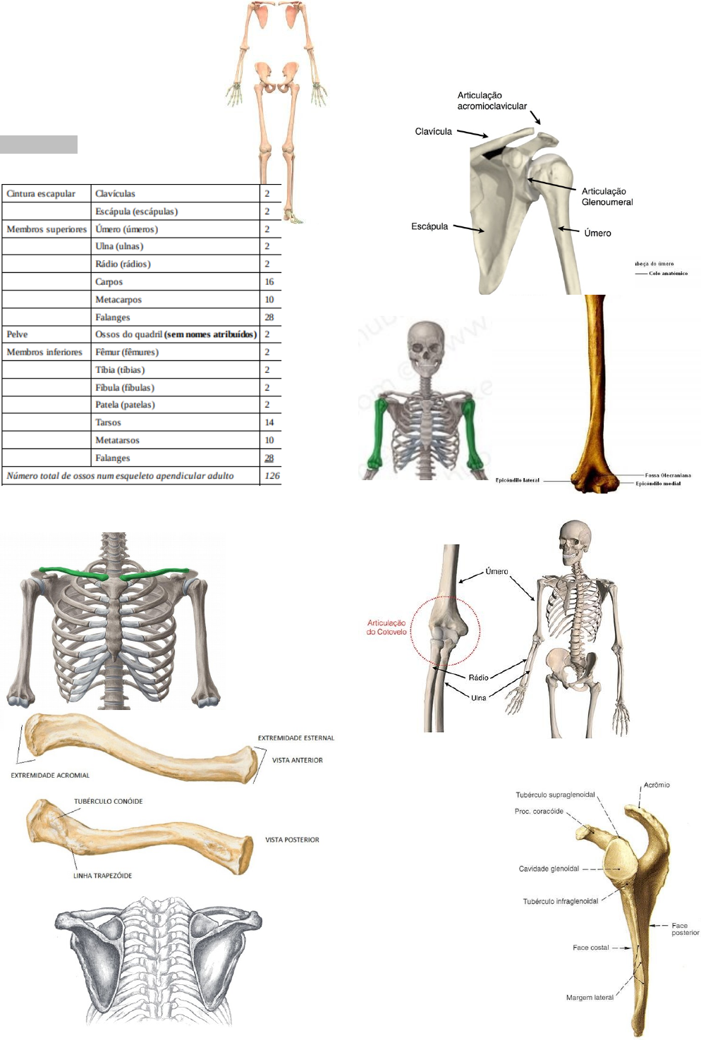 <p>Esqueleto Apendicular</p><p>Consiste em todos os</p><p>ossos dos membros superiores e inferiores (extremidades), ombro e pelve. O esqueleto apendicular, que é preso ao esqueleto axial, em sua forma adulta comporta 126 ossos isolados.</p><p>- Clavículas (2)</p><p>- Escapulas (2)</p><p>- Úmero – braço (2)</p><p>- Rádio e Ulna – Antebraço (2) e (2)</p><p>- Punho e mão</p><p>• 14 falanges</p><p>• 5 metacarpos</p><p>• 8 carpos</p><p>- Pelve (2)</p><p>- Fêmur (2)</p><p>- Patela (2)</p><p>- Tíbia (2)</p><p>- Tornozelo e pé</p><p>• 7 Ossos do Tarso</p><p>• 5 Metatarsos</p><p>• 14 Falanges</p><p>image4.png</p><p>image5.png</p><p>image6.png</p><p>image7.png</p><p>image8.png</p><p>image9.png</p><p>image10.png</p><p>image11.png</p><p>image12.png</p><p>image13.png</p><p>image14.png</p><p>image15.jpeg</p><p>image16.png</p><p>image17.png</p><p>image1.png</p><p>image2.png</p><p>image3.png</p>