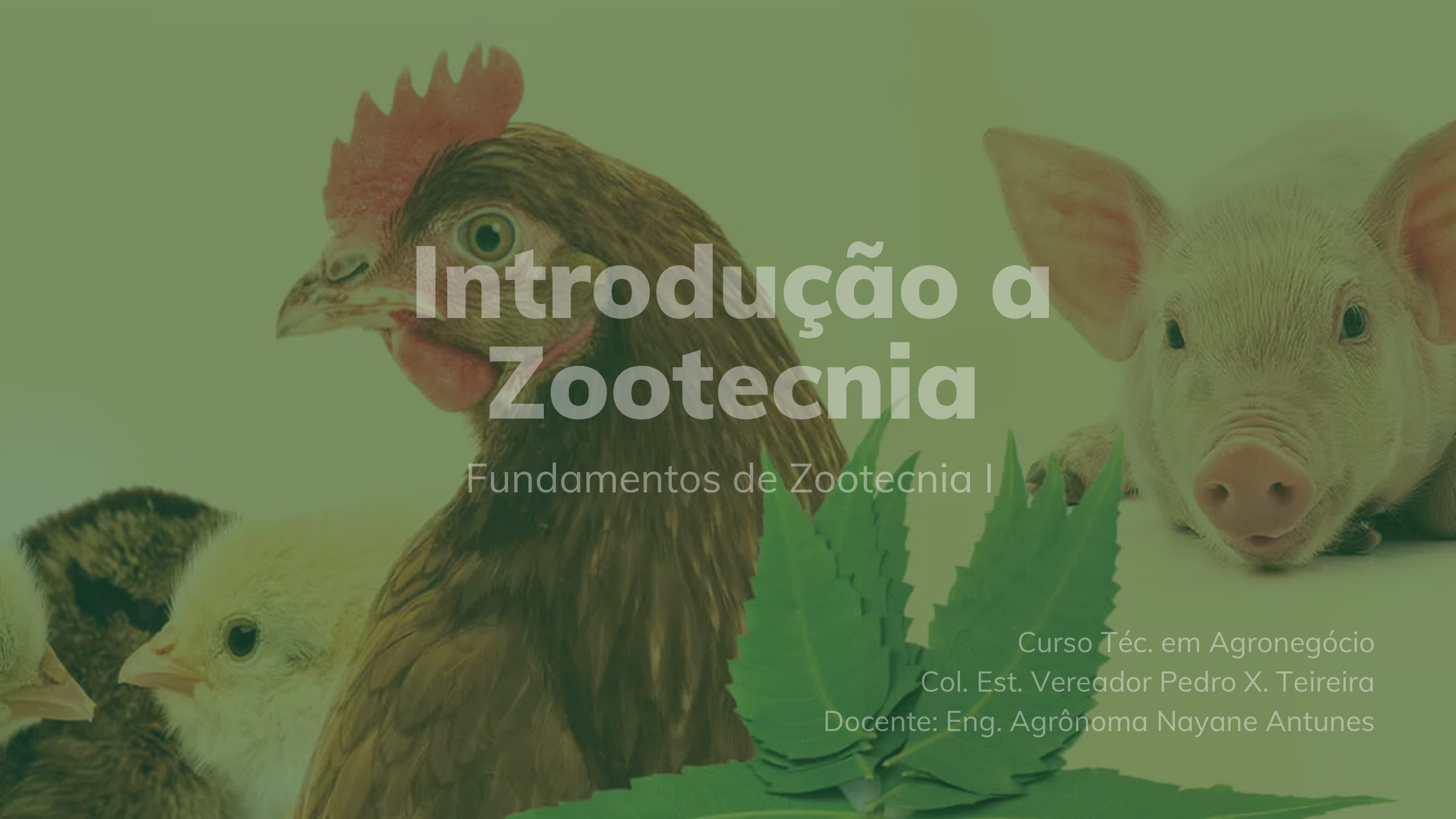 <p>Curso Téc. em AgronegócioCurso Téc. em Agronegócio</p><p>Col. Est. Vereador Pedro X. TeireiraCol. Est. Vereador Pedro X. Teireira</p><p>Docente: Eng. Agrônoma Nayane AntunesDocente: Eng. Agrônoma Nayane Antunes</p><p>Introdução aIntrodução a</p><p>ZootecniaZootecnia</p><p>Fundamentos de Zootecnia IFundamentos de Zootecnia I</p><p>Objetivos da Aula</p><p>Índice de tópicos</p><p>Introduzir a disciplina</p><p>Compreender o Conceito de Zootecnia</p><p>Explorar o Histórico da Domesticação dos Animais</p><p>Unidade 1: Introdução à Zootecnia</p><p>Conceito e importância da zootecnia.</p><p>Histórico da domesticação dos animais.</p><p>Dinâmica da domesticação das principais espécies.</p><p>Unidade 2: Avicultura</p><p>Importância econômica e zootécnica da avicultura.</p><p>Produtos e subprodutos avícolas.</p><p>Estrutura da produção avícola.</p><p>Manejo e criação de frangos de corte: nutrição, bem-estar e</p><p>biossegurança.</p><p>Manejo e criação de poedeiras: práticas de produção e</p><p>biossegurança.</p><p>Conteúdo Programático</p><p>Unidade 3: Suinocultura</p><p>Histórico e evolução do suíno.</p><p>Reprodução e seleção genética de raças suínas.</p><p>Técnicas de manejo e instalações para suínos.</p><p>Gestão de dejetos suínos e sustentabilidade.</p><p>Programas de biossegurança em suinocultura.</p><p>Unidade 4: Planejamento e Sustentabilidade</p><p>Sistemas de produção animal sustentáveis.</p><p>Planejamento da produção avícola e suína.</p><p>Impacto ambiental e gestão sustentável.</p><p>Conteúdo Programático</p><p>História da Relação</p><p>Humano-Animal</p><p>Primeiras Evidências da Relação com Animais</p><p>Ilustrações em Cavernas: As primeiras evidências</p><p>da presença de animais na vida humana estão</p><p>registradas em ilustrações encontradas em</p><p>cavernas. Estas representações artísticas</p><p>mostram a importância dos animais para os</p><p>primeiros seres humanos.</p><p>Importância na Vida Humana: Desde os</p><p>primórdios, os animais desempenharam um papel</p><p>crucial na sobrevivência e na identidade humana.</p><p>Eles eram fontes de alimento, companhia,</p><p>vestimentas e outros produtos essenciais.</p><p>História da Relação</p><p>Humano-Animal</p><p>Atividade Nômade e Onívora</p><p>Modo de Vida: Nos estágios iniciais, os seres</p><p>humanos eram nômades e dependiam da</p><p>caça, pesca e coleta de frutas e raízes para</p><p>sua sobrevivência.</p><p>Evolução das Ferramentas de Caça: Com o</p><p>tempo, os humanos desenvolveram e</p><p>aperfeiçoaram ferramentas de caça, como</p><p>arcos e flechas, lanças e facas, facilitando a</p><p>obtenção de alimentos e recursos.</p><p>História da Relação Humano-</p><p>Animal</p><p>Sedentarização e Agricultura</p><p>Transição para a Sedentarização: Após mais de 1</p><p>milhão de anos de vida nômade, a sedentarização</p><p>começou em várias partes do mundo, levando ao</p><p>desenvolvimento da agricultura e domesticação de</p><p>animais.</p><p>Divisão do Trabalho: A sedentarização também</p><p>trouxe a divisão do trabalho dentro das comunidades.</p><p>Os homens assumiram a responsabilidade pela</p><p>proteção e sustento, enquanto as mulheres cuidavam</p><p>dos filhos e da habitação.</p><p>Desenvolvimento de Ferramentas: O domínio do fogo</p><p>possibilitou a criação de ferramentas de metal, como</p><p>lanças, facas e machados, que aprimoraram a caça e</p><p>a produção de alimentos.</p><p>História da Relação Humano-</p><p>Animal</p><p>Agricultura, Armazenagem e Trocas</p><p>Comerciais</p><p>Produção e Armazenagem: Com a agricultura em</p><p>pleno desenvolvimento, os excedentes agrícolas</p><p>foram armazenados, garantindo alimento durante</p><p>períodos de seca ou inundações. Esse controle</p><p>sobre a produção de alimentos permitiu o</p><p>crescimento das comunidades.</p><p>Especialização e Trocas Comerciais: O aumento da</p><p>produção e a necessidade de trocar produtos com</p><p>outras comunidades levaram ao surgimento de</p><p>trabalhadores especializados e ao desenvolvimento</p><p>de sistemas de comércio.</p><p>História da Relação Humano-</p><p>Animal</p><p>Impactos e Avanços</p><p>Aperfeiçoamento das Técnicas: A melhoria</p><p>contínua das técnicas de cultivo e manejo de</p><p>animais, bem como o surgimento de novas</p><p>ferramentas e métodos, contribuíram para a</p><p>evolução das sociedades e para a relação cada</p><p>vez mais complexa entre seres humanos e</p><p>animais.</p><p>Crescimento das Comunidades: O excedente de</p><p>alimentos e o comércio entre comunidades</p><p>levaram ao crescimento e à complexidade das</p><p>sociedades humanas, estabelecendo uma base</p><p>para o desenvolvimento das civilizações</p><p>modernas.</p><p>O QUE ÉO QUE É</p><p>ZOOTECNIA?ZOOTECNIA?</p><p>Conceito deConceito de</p><p>ZootecniaZootecnia</p><p>A zootecnia é a ciência que se</p><p>dedica ao estudo da criação,</p><p>conservação e produção animal,</p><p>com ênfase nos animais</p><p>considerados domésticos.</p><p>Ela abrange áreas como:</p><p>Nutrição animal,</p><p>Melhoramento genético,</p><p>Manejo de pastagens,</p><p>Reprodução e</p><p>Saúde animal.</p><p>Conceito deConceito de</p><p>ZootecniaZootecnia</p><p>Origem da Palavra:</p><p>O termo "doméstico" vem do latim</p><p>"domus", que significa "casa". Isso</p><p>reflete a ideia de que animais</p><p>domesticados vivem sob o domínio</p><p>humano e dentro de ambientes</p><p>controlados por este.</p><p>Conceito deConceito de</p><p>ZootecniaZootecnia</p><p>Dependência Não Significa</p><p>Domesticação:</p><p>Apenas depender dos humanos não</p><p>qualifica um animal como</p><p>doméstico. Estes animais podem</p><p>viver em ambientes controlados ou</p><p>interagir com humanos, mas não</p><p>foram completamente domesticados</p><p>para se reproduzirem e viverem em</p><p>cativeiro de forma continu