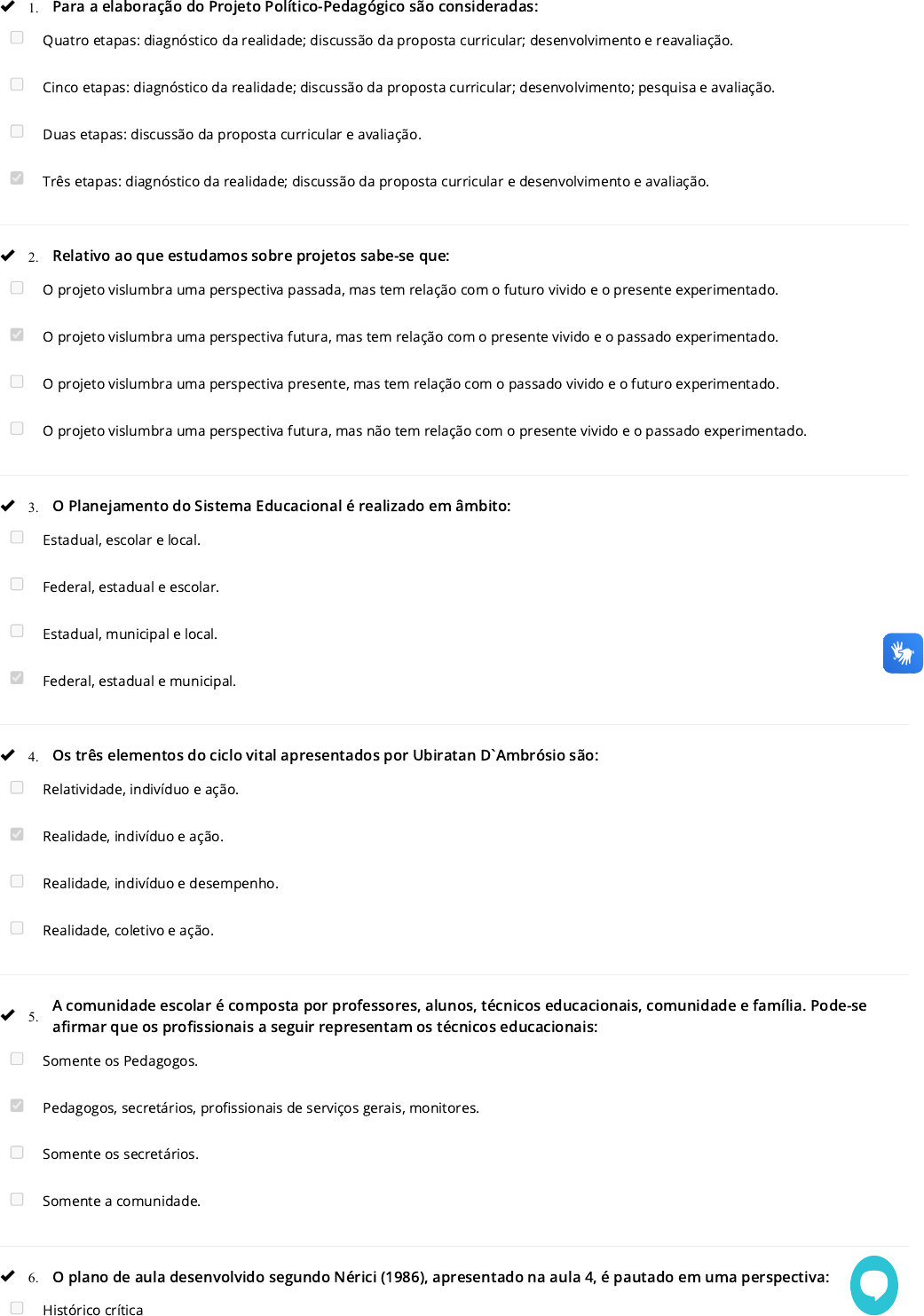 <p>15/05/2024, 11:23 UNINA</p><p>https://cursor.unina.edu.br/Account/Questionario.aspx?token=U3R1ZGVudENsYXNzSWQ9OTcwMTc2JlF1ZXN0aW9ubmFpcmVJZD02NzAyJklz… 2/3</p><p>Para a elaboração do Projeto Político-Pedagógico são consideradas:</p><p>Quatro etapas: diagnóstico da realidade; discussão da proposta curricular; desenvolvimento e reavaliação.</p><p>Cinco etapas: diagnóstico da realidade; discussão da proposta curricular; desenvolvimento; pesquisa e avaliação.</p><p>Duas etapas: discussão da proposta curricular e avaliação.</p><p>Três etapas: diagnóstico da realidade; discussão da proposta curricular e desenvolvimento e avaliação.</p><p>Relativo ao que estudamos sobre projetos sabe-se que:</p><p>O projeto vislumbra uma perspectiva passada, mas tem relação com o futuro vivido e o presente experimentado.</p><p>O projeto vislumbra uma perspectiva futura, mas tem relação com o presente vivido e o passado experimentado.</p><p>O projeto vislumbra uma perspectiva presente, mas tem relação com o passado vivido e o futuro experimentado.</p><p>O projeto vislumbra uma perspectiva futura, mas não tem relação com o presente vivido e o passado experimentado.</p><p>O Planejamento do Sistema Educacional é realizado em âmbito:</p><p>Estadual, escolar e local.</p><p>Federal, estadual e escolar.</p><p>Estadual, municipal e local.</p><p>Federal, estadual e municipal.</p><p>Os três elementos do ciclo vital apresentados por Ubiratan D`Ambrósio são:</p><p>Relatividade, indivíduo e ação.</p><p>Realidade, indivíduo e ação.</p><p>Realidade, indivíduo e desempenho.</p><p>Realidade, coletivo e ação.</p><p>A comunidade escolar é composta por professores, alunos, técnicos educacionais, comunidade e família. Pode-se</p><p>a�rmar que os pro�ssionais a seguir representam os técnicos educacionais:</p><p>Somente os Pedagogos.</p><p>Pedagogos, secretários, pro�ssionais de serviços gerais, monitores.</p><p>Somente os secretários.</p><p>Somente a comunidade.</p><p>O plano de aula desenvolvido segundo Nérici (1986), apresentado na aula 4, é pautado em uma perspectiva:</p><p>Histórico crítica</p><p> 1.</p><p> 2.</p><p> 3.</p><p> 4.</p><p> 5.</p><p> 6.</p><p>15/05/2024, 11:23 UNINA</p><p>https://cursor.unina.edu.br/Account/Questionario.aspx?token=U3R1ZGVudENsYXNzSWQ9OTcwMTc2JlF1ZXN0aW9ubmFpcmVJZD02NzAyJklz… 3/3</p><p>UNINA</p><p>Copyright © 2011 - 2024. Todos direitos reservados.</p><p>Tecnicista.</p><p>Moderna.</p><p>Crítico re�exiva.</p><p>Planejamento em Educação pode ser de três naturezas, a saber:</p><p>Planejamento do Sistema Educacional, Planejamento Escolar e Planejamento do Ensino.</p><p>Planejamento do Sistema de Aprendizagem, Planejamento Escolar e Planejamento do Ensino.</p><p>Planejamento do Sistema de Aprendizagem, Planejamento Escolar e Planejamento Educacional.</p><p>Planejamento do Sistema Educacional, Planejamento Escolar e Planejamento Educacional.</p><p>O PPP só se concretiza como um instrumento democrático, de gestão democrática da escola se estiver garantida a</p><p>participação:</p><p>Somente dos pedagogos na sua construção.</p><p>Da comunidade escolar na sua construção.</p><p>Somente dos professores e alunos na sua construção.</p><p>Somente dos alunos na sua construção.</p><p>Participação, pensar o cenário futuro e a continuidade do processo são elementos do Planejamento Participativo que</p><p>se encontram em Gandin, 2001. Referem-se a continuidade do processo:</p><p>Avaliação e reavaliação.</p><p>Re�exão e monitoramento.</p><p>Monitoramento e avaliação.</p><p>Monitoria e veri�cação.</p><p>Os planos de ensino são também considerados ferramentas de avaliação que podem reorientar o trabalho:</p><p>Do gestor e do secretário da escola</p><p>Do professor e do secretário da escola.</p><p>Do professor e do gestor.</p><p>Do secretário da escola e da comunidade escolar.</p><p> 7.</p><p> 8.</p><p> 9.</p><p> 10.</p>