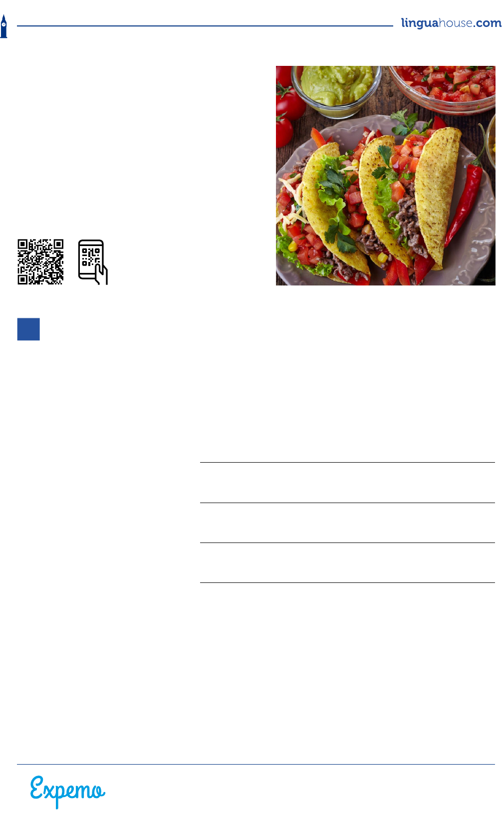 <p>GENERAL ENGLISH · VOCABULARY DEVELOPMENT · PRE-INTERMEDIATE (A2-B1)</p><p>HEAAADERLOGORIGHT</p><p>DESCRIBING</p><p>FOOD</p><p>QrrkoD Scan to review worksheet</p><p>Expemo code:</p><p>1E87-44IL-723F</p><p>1 Types of food</p><p>Study the following food items and put them into the correct categories below:</p><p>apple beef butter cabbage carrot cheese</p><p>chicken crab cucumber garlic ham lamb</p><p>lettuce milk olive onion orange peach</p><p>pork prawns/shrimp salmon tomato tuna yogurt</p><p>1. Meat:</p><p>2. Fruits and vegetables:</p><p>3. Fish and seafood:</p><p>4. Dairy products:</p><p>Work in pairs. Student A, select a word. Student B, tell your partner how often you eat/drink the</p><p>item. Reverse roles and repeat the exercise.</p><p>Use adverbs of frequency (never, hardly ever, rarely, sometimes,often) or time expressions</p><p>(once/twice/three times a week/month/year; every day/week).</p><p>For example: "I hardly ever eat pork." / "I drink milk every day."</p><p>FOOOOTERRIGHT 1/3Learn without forgetting!</p><p>Scan the QR at the top of Page 1 to review the lesson flashcards with Expemo.</p><p>© Linguahouse.com. Photocopiable and licensed for use in Tiago Matos's lessons.</p><p>PRE-INTERMEDIATE (A2-B1)</p><p>DESCRIBING FOOD</p><p>HEAAADERLOGORIGHT</p><p>2 Adjectives for describing food</p><p>Describe the food belowwith the following adjectives. Use more than one adjective to describe each</p><p>picture.</p><p>fattening healthy heavy light</p><p>salty spicy sweet tasty</p><p>1. 2. 3. 4.</p><p>3 Dialogue</p><p>Complete the dialogue with the questions below:</p><p>How often do you eat it? Is it easy to make?</p><p>What does it come with?</p><p>What’s it like? What’s it made of?</p><p>A: A typical dish in my country is "Chicken madras".</p><p>B: 1</p><p>A: It’s made of chicken and curry sauce.</p><p>B: 2</p><p>A: It’s served with rice.</p><p>A: 3.</p><p>B: It’s very spicy. But it’s delicious.</p><p>A: 4.</p><p>B: No, it’s quite difficult.</p><p>A: 5</p><p>B: I eat it once a week.</p><p>Now choose a dish from your country and have a similar dialogue with your partner.</p><p>FOOOOTERLEFT 2/3Learn without forgetting!</p><p>Scan the QR at the top of Page 1 to review the lesson flashcards with Expemo.</p><p>© Linguahouse.com. Photocopiable and licensed for use in Tiago Matos's lessons.</p><p>PRE-INTERMEDIATE (A2-B1)</p><p>DESCRIBING FOOD</p><p>HEAAADERLOGORIGHT</p><p>4 Grammar review - Countable vs. Uncountable</p><p>Which words from Exercise 1 can be countable? Complete the table below.</p><p>Countable (singular - plural) Only uncountable</p><p>apple - apples beef</p><p>Cross out the wrong answers to complete the sentences below.</p><p>1. I don’t drink much/many milk.</p><p>2. I had some/any apples for breakfast this morning.</p><p>3. I’m a vegetarian. I don’t eat -/a beef.</p><p>4. How many/How much oranges do you eat every day?</p><p>5. I usually have a little/a few olives in my salad.</p><p>6. Paul doesn’t eat many/much oranges.</p><p>7. People say that a little/a few yogurt every day is good for you.</p><p>8. I’ve got a/some cheese in my fridge.</p><p>9. Pete puts a lot of/much onions in his salad.</p><p>10. I eat a lot of/much beef every day.</p><p>11. Do you eat many/much beef every day?</p><p>12. Did you eat much/many carrots yesterday?</p><p>Now look at the sentences and complete the rules with uncountable or plural.</p><p>• In positive sentences (+), we use some with plural and uncountable nouns.</p><p>• In negative sentences (-) and questions (?), we use any with plural and uncountable nouns.</p><p>• We use a lot of with uncountable and plural nouns.</p><p>• We use a little with nouns.</p><p>• We use a few with nouns.</p><p>• In questions (?), we use How many with nouns.</p><p>• In questions (?), we use How much with nouns.</p><p>• In negative sentences (-) and questions (?), we use much with nouns.</p><p>FOOOOTERRIGHT 3/3Learn without forgetting!</p><p>Scan the QR at the top of Page 1 to review the lesson flashcards with Expemo.</p><p>© Linguahouse.com. Photocopiable and licensed for use in Tiago Matos's lessons.</p><p>TEACHER MATERIALS · PRE-INTERMEDIATE (A2-B1)</p><p>DESCRIBING FOOD</p><p>HEAAADERLOGORIGHT</p><p>Key</p><p>1. Types of food</p><p>Go through thewords with the students. Model pronunciation, making sure they know how to pronounce ‘lettuce’,</p><p>‘salmon’ and ‘lamb’ in particular. Point out the difference between ‘prawns’ (British English) and ‘shrimp’ (American</p><p>English). Students do the task individually then check in pairs. Prepare students for the pair-work activity by</p><p>reviewing adverbs of frequency and word order. Demonstrate with a strong student and set a time limit for this</p><p>activity.</p><p>Meat: pork, beef, lamb, chicken, ham</p><p>Fruits and vegetables: tomato, cucumber, onion, apple, orange, peach, carrot, melon, garlic, cabbage, lettuce, olive</p><p>Fish and seafood: tuna, salmon, prawns/shrimp, crab</p><p>Dairy products: milk, cheese, butter, yogurt</p><p>2. Adjectives for describing food</p><p>Go through the adjectives and check understanding. Some answers, e.g. ‘tasty’, depend on students’ personal</p><p>preferences. Possible answers:</p><p>1. sweet, heavy, fattening, tasty</p><p>2. healthy, light</p><p>3. spicy, fattening, tasty</p><p>4. salty, light</p><p>3. Dialogue</p><p>Go through the questions first and check understanding.</p><p>1. What’s it made of? 2. What does it come with? 3. What’s it like?</p><p>4. Is it easy to make? 5. How often do you eat it?</p><p>4. Grammar review - Countable vs. Uncountable</p><p>Point out that when we refer to the meat from a particular animal, the word is usually uncountable, e.g. ‘some</p><p>chicken’, even though the word for the animal can be plural (‘some chickens’).</p><p>1. Plural: apple - apples, orange - oranges, carrot - carrots, cucumber - cucumbers, tomato - tomatoes, olive -</p><p>olives, onion - on