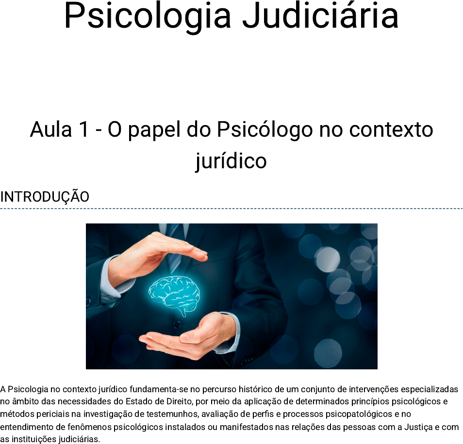 <p>Psicologia Judiciária</p><p>Aula 1 - O papel do Psicólogo no contexto</p><p>jurídico</p><p>INTRODUÇÃO</p><p>A Psicologia no contexto jurídico fundamenta-se no percurso histórico de um conjunto de intervenções especializadas</p><p>no âmbito das necessidades do Estado de Direito, por meio da aplicação de determinados princípios psicológicos e</p><p>métodos periciais na investigação de testemunhos, avaliação de perfis e processos psicopatológicos e no</p><p>entendimento de fenômenos psicológicos instalados ou manifestados nas relações das pessoas com a Justiça e com</p><p>as instituições judiciárias.</p><p>Dar relevância a esses dados históricos é importante para desenvolvermos uma reflexão sobre a prática profissional da</p><p>Psicologia junto às instituições do Direito e sobre as mudanças que têm ocorrido, principalmente, após 1980, indicando</p><p>novas perspectivas para o decorrer do século XXI.</p><p>Destaca-se a necessidade de conhecer determinadas terminologias da área jurídica e a importância de um trabalho</p><p>interdisciplinar, junto a advogados, juízes, promotores, assistentes sociais e sociólogos. Esse é o grande desafio da</p><p>psicologia jurídica: não ficar limitada aos conhecimentos advindos da ciência psicológica e trocar conhecimentos com</p><p>ciências afins, buscando redimensionar a compreensão do agir humano, considerando os aspectos legais, afetivos e</p><p>comportamentais.</p><p>Nesta aula, estudaremos a inserção do psicólogo no contexto jurídico. A Psicologia é de grande relevância ao</p><p>ordenamento jurídico brasileiro, pois visa obter maior compreensão do comportamento do ser humano, para melhorar</p><p>a solução dos litígios no contexto jurídico. Apresentaremos a história da inserção da Psicologia junto ao Direito, de</p><p>uma forma geral e contextualizada no Brasil. Serão abordadas as atribuições do psicólogo nesta área, determinadas</p><p>pelo Conselho Federal de Psicologia e que não mais estão restritas à avaliação psicológica.</p><p>OBJETIVOS</p><p>Compreender a história da inserção da Psicologia junto ao Direito.</p><p>Conhecer o percurso da Psicologia jurídica no Brasil.</p><p>Identificar as atribuições do psicólogo jurídico, determinadas pelo Conselho Federal de Psicologia.</p><p>PRIMÓRDIOS DA PSICOLOGIA JURÍDICA</p><p>Vamos relembrar um pouco de História. Da Idade Média (glossário) ao século XVIII vão sendo construídos os ideais</p><p>liberais da sociedade burguesa, que vão constituir os princípios do Direito Moderno - homem, sujeito da razão, livre e</p><p>igual aos demais.</p><p>O processo de fragmentação desse mundo, processo específico das sociedades ocidentais - constrói novas</p><p>explicações para o mundo que vão superar os significados dados pela religião. Surge o mundo moderno que quebra a</p><p>tradição que se fundamenta na religião e nas posições estáveis. O mundo é dinâmico, é um mundo em movimento. O</p><p>homem é, agora, um ser moral, independente, autônomo, senhor do livre-arbítrio. Ele é um sujeito jurídico, portador da</p><p>razão, que estabelece suas relações com os outros a partir de contratos sociais. A visão de mundo tem como eixo</p><p>central o individualismo. (glossário)</p><p>O Homem Vitruviano - Leonardo da Vinci - Acervo da Galeria Accademia - Veneza.</p><p>Fonte: Maisei Raman / Shutterstock, Denis Cristo / Shutterstock e MarijaPiliponyte / Shutterstock</p><p>Fonte:</p><p>A obra de Leonardo da Vinci “Homem Vitruviano”, é considerada um símbolo do humanismo pois valoriza o homem em</p><p>primeiro lugar, e isso é uma característica muito importante do humanismo, e também retrata como o homem é puro.</p><p>O indivíduo-cidadão é sujeito da razão. Livre-arbítrio e razão se interligam. No entanto, a afirmação da igualdade, que é</p><p>parte da natureza humana redescoberta, produz a necessidade de pensar as diferenças. Mesmo que a igualdade</p><p>jurídica esteja garantida, a diferença entre os indivíduos reside na sua interioridade. Portanto, temos dois</p><p>entendimentos da natureza humana. Um, como razão, que afirma a igualdade entre os homens, possibilitando a vida</p><p>em sociedade; outro, aponta uma desigualdade que está fora da sociedade, é biológica.</p><p>Sentavio / Shutterstock, etraveler / Shutterstock e Michele Paccione / Shutterstock</p><p>Com a primazia do conhecimento biológico, busca-se explicar aquilo que está além da sociedade, possibilitando até</p><p>explicar os comportamentos humanos. Nesta época, aparecem estudos importantes como a Frenologia (glossário) de</p><p>Gall e a Antropologia Criminal de Cesare Lombroso (glossário), afirmando que a criminalidade era um fenômeno</p><p>hereditário.</p><p>A Psiquiatria, estudo sobre a loucura, com Pinel (glossário) (foto), no século XVIII, ganha um espírito iluminista que, ao</p><p>longo do século XIX, agrega o seu conhecimento às teorias da degenerescência, que ligam a loucura individual à</p><p>degeneração racial.</p><p>Fonte: Wikipedia</p><p>Atenção</p><p>, A esse conceito de degeneração junta-se a explicação dos distúrbios morais, que explicam os atos desviantes da norma social.</p><p>Há uma disputa entre os saberes médico e jurídico, segundo Foucault (1996). Há uma psiquiatrização do crime porque obtém-se</p><p>a verdade jurídica a partir do exame do criminoso, de suas motivações e intenções. Esse exame toma o lugar do testemunho do</p><p>criminoso, que passa a ser secundário ao conhecimento especializado. Surgem, também, diferentes maneiras para organizar a</p><p>individualidade humana, como o exame, a medida, a análise e a classificação.</p><p>Nesse contexto científico, surgem algumas ciências, entre elas, a Psicologia, que apresenta fronteiras entre a Filosofia</p><p>e a Biologia.</p><p>Tetiana Savaryn / Shutterstock</p><p>Para ler mais sobre a trajetória científica 