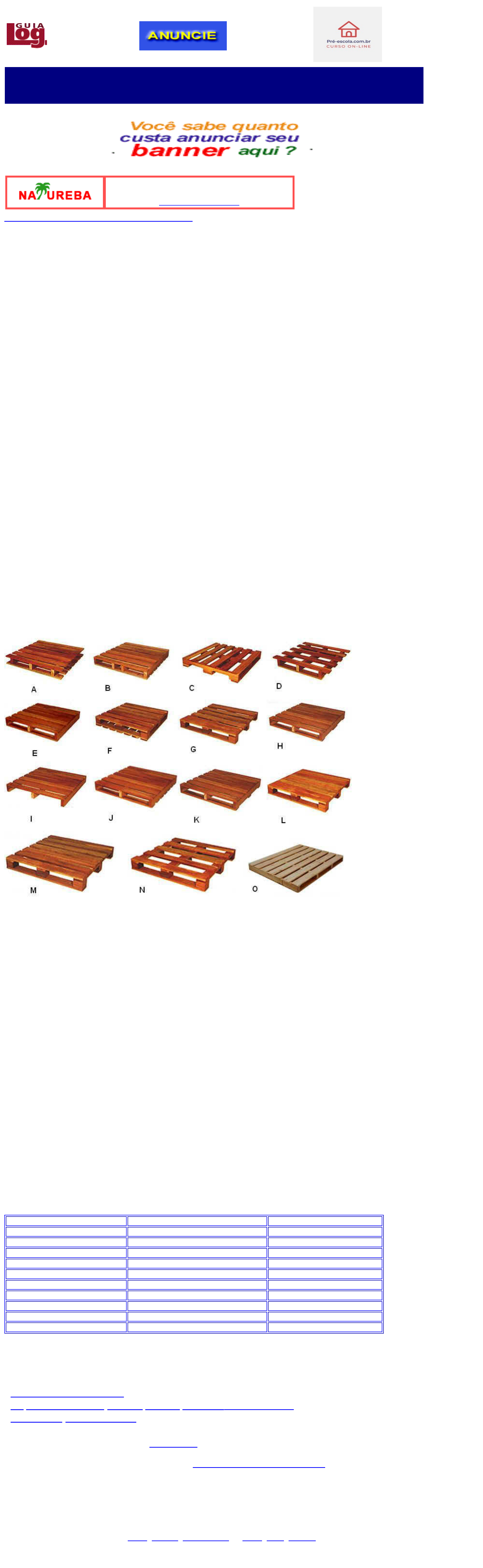 <p>MARCOS VERLANGIERI</p><p>Consultor em Logística</p><p>Especialista em projetos de PDM - Padrão de Descrição de Materiais / Gestão de Materiais</p><p>REEDUCAÇÃO ALIMENTAR</p><p>CURSO ON-LINE</p><p>www.natureba.com.br</p><p>Assista um trecho do curso de PDM / PDS do IMAM</p><p>PALETES</p><p>PALETES DE MADEIRA</p><p>O Guia Log destaca mais informações sobre Paletes, a fim de facilitar o entendimento de todos.</p><p>Peso - O peso irá variar dependendo do tipo de madeira. Em média fica em torno de 30 kg.</p><p>Tipos de Madeira - As mais usadas são Peroba-rosa, Eucalipto e Pinus.</p><p>A seguir colocamos as principais informações necessárias para conhecer mais, antes de definir qual</p><p>o tipo de palete de madeira que deve adquirir para a sua empresa.</p><p>nr. de entradas - São as entradas para os garfos da empilhadeira ou do carro hidráulico.</p><p>sem vãos - É quando não tem vãos entre as tábuas da superfície do palete.</p><p>com vãos - É quando tem vãos entre as tábuas da superfície do palete.</p><p>vãos grandes - É quando tem vãos mais espaçados entre as tábuas da superfície do palete.</p><p>madeira abaulada - É quando são utilizadas tábuas sem quinas para não ter risco de rasgar a</p><p>embalagem do produto.</p><p>longarinas - Vigas de madeira que servem de apoio para colocar as tábuas que comporão a</p><p>superfície do palete.</p><p>abas laterais - É quando as tábuas passam das longarinas das pontas, visando ter uma sobra para</p><p>içamento por cabos.</p><p>com reforço - É quando no meio do palete e por baixo, tem uma tábua mais larga para reforçar a</p><p>estrutura, devido ao peso do produto a ser paletizado. Ela é colocada em sentido contrário as tábuas</p><p>da superfície; mesmo sentido das longarinas.</p><p>dupla face - É o palete com tábuas em cima e embaixo, pode ser reversível ou não.</p><p>reversível - É o palete que tem a mesma configuração em cima e embaixo, ou seja, o mesmo</p><p>número e tamanho de tábuas em cima e embaixo.</p><p>calço - É colocado na longarina, entre as tábuas para que o palete não fique com nenhuma diferença</p><p>de apoio na face inferior, para não enganchar ou ferir alguma caixa ou embalagem do palete inferior</p><p>ou para correr em esteiras automatizadas.</p><p>Abaixo os tipos padronizados de paletes de madeira :</p><p>A - 2 entradas, dupla face reversível, aba lateral para içamento por cabos, uso com empilhadeira.</p><p>B - 2 entradas, dupla face reversível, quatro longarinas e uso com empilhadeira.</p><p>C - 4 entradas, longarina com corte, uso com empilhadeira e carro hidráulico.</p><p>D - 2 entradas, aba lateral para içamento por cabos, uso com empilhadeira e carro hidráulico.</p><p>E - 2 entradas, uso com empilhadeira e carro hidráulico, com calço.</p><p>F - 4 entradas, dupla face reversível, uso com empilhadeira.</p><p>G - 4 entradas, uso com empilhadeira e carro hidráulico.</p><p>H - 2 entradas,uso com empilhadeira e carro hidráulico.</p><p>I - 2 entradas, uso com empilhadeira e carro hidráulico, sem peças na face inferior.</p><p>J - 2 entradas, uso com empilhadeira e carro hidráulico, com calço.</p><p>K - 2 entradas, uso com empilhadeira e carro hidráulico.</p><p>L - 4 entradas, uso com empilhadeira e carro hidráulico, face superior sem vão entre as peças.</p><p>M - 4 entradas, uso com empilhadeira e carro hidráulico.</p><p>N - 4 entradas, uso com empilhadeira e carro hidráulico, face superior com vão grande.</p><p>O - Mostra o exemplo de Palete com madeiras abauladas (sem quina). Próprio para sacarias, pois</p><p>evita o rasgamento.</p><p>Existem ainda outros tipos de materiais para a confecção de Paletes como Borracha, Metálicos,</p><p>Papelão, Plástico.</p><p>Medidas de Paletes</p><p>Local Medida Padrão</p><p>América do Sul 1.000 x 1.200 mm -</p><p>América do Norte 1.219 x 1.016 mm (48x40´) -</p><p>América do Norte 1.054,2 x 1.054,2 mm (42x42´) -</p><p>Brasil 1.000 x 1.200 mm * PBR1</p><p>Brasil 1.050 x 1.250 mm * PBR2</p><p>Ásia 1.100 x 1.100 mm JIS</p><p>África 1.000 x 1.200 mm -</p><p>Europa 1.200 x 800 mm Europallet</p><p>Europa 1.000 x 1.200 mm Europallet</p><p>Europa 1.140 x 1.140 mm Europallet</p><p>* esta é padronizada, mas existem várias medidas no mercado, de acordo com a utilização desejada</p><p>pelo cliente.</p><p>Artigos no Guia Log sobre paletes :</p><p>- Palete: Como escolher?</p><p>- A questão da utilização dos paletes plásticos vs. de madeira</p><p>- Administração dos Paletes</p><p>Associação ligada a paletes : ABRAPAL - Associação Brasileira de Fabricantes de Paletes (Brasil)</p><p>Fornecedores - No canal de conteúdo "Acha Fácil Fornecedores Log" poderão ser encontrados os</p><p>fornecedores já cadastrados no Guia Log.</p><p>Esta página é parte integrante do www.guiadelogistica.com.br ou www.guialog.com.br .</p><p>E</p><p>M</p><p>B</p><p>F G</p><p>J</p><p>N</p><p>D</p><p>H</p><p>L</p><p>http://www.pre-escola.com.br/</p><p>https://www.guialog.com.br/vitrineconsultoria.htm</p><p>https://www.guialog.com.br/anunciarB.htm</p><p>http://www.natureba.com.br/</p><p>http://www.natureba.com.br/</p><p>https://www.youtube.com/watch?v=zlA4hpjrWFk</p><p>https://www.guialog.com.br/ARTIGO37.htm</p><p>https://www.guialog.com.br/ARTIGO99.htm</p><p>https://www.guialog.com.br/Y640.htm</p><p>http://www.abrapal.org/</p><p>https://www.guialog.com.br/achafacil.htm</p><p>http://www.guiadelogistica.com.br/</p><p>http://www.guialog.com.br/</p>