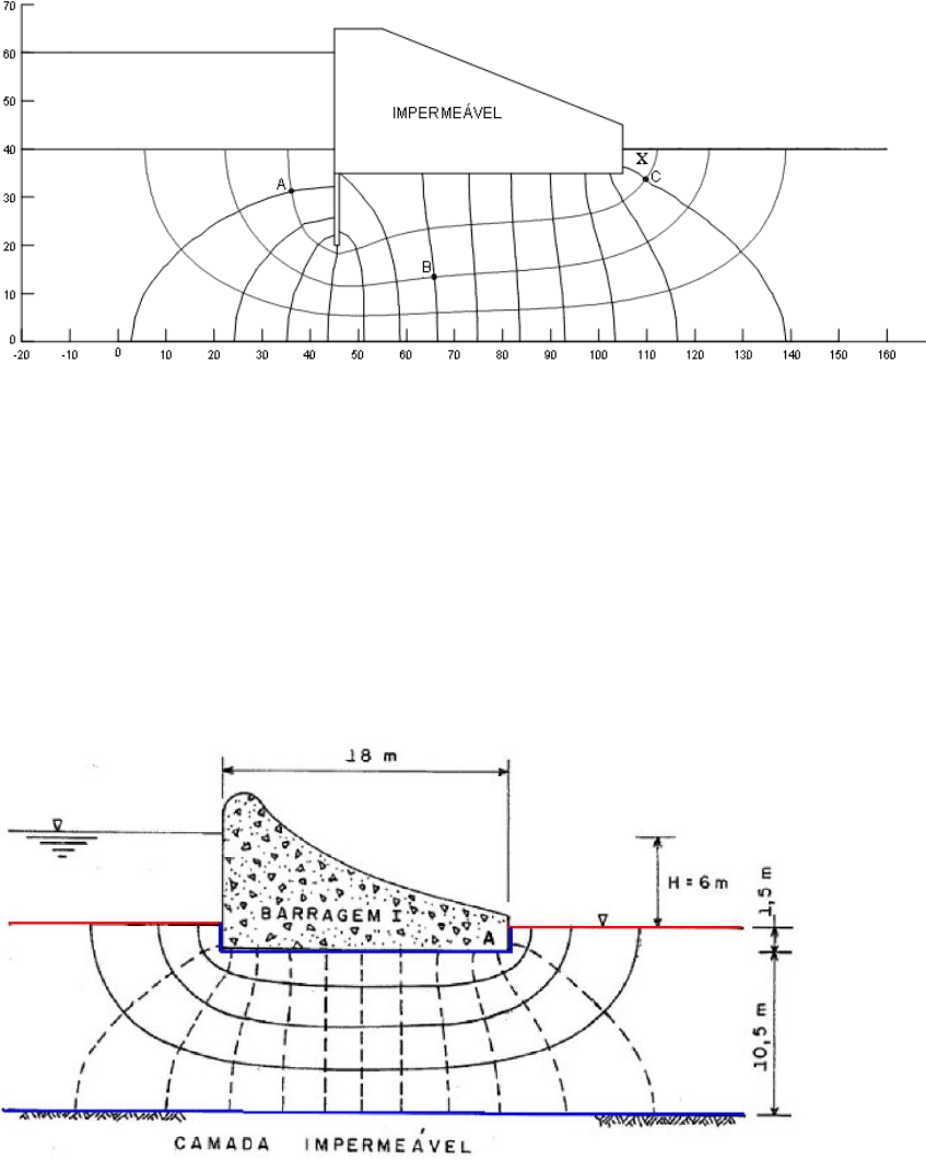 <p>Exercícios Fluxo Bidimensional</p><p>1- O que representa uma rede de fluxo bidimensional?</p><p>2- Quais os critérios a serem seguidos durante a elaboração de uma rede de fluxo? Quais</p><p>as principais dificuldades encontradas durante o traçado de uma rede de fluxo?</p><p>3- Para a rede de fluxo abaixo, calcular:</p><p>a) As poro-pressões nos pontos A, B e C;</p><p>b) A vazão que percola o sistema, sendo k = 2,5 x 10</p><p>-8</p><p>m/s;</p><p>c) Verificar a ocorrência de ruptura hidráulica no elemento X.</p><p>4- Na figura abaixo, apresenta-se a seção transversal de uma barragem e a rede de fluxo</p><p>no maciço de fundação. O terreno de fundação é um arenito com coeficiente de</p><p>permeabilidade K =2,5 x 10</p><p>-3</p><p>m/s. Determine:</p><p>a) A vazão que atravessa por dia o maciço de fundação da barragem.</p><p>b) Calcule a pressão neutra no ponto A.</p><p>c) Avalie a segurança quanto a ruptura hidráulica por liquefação do solo de fundação</p><p>5- Para a rede de fluxo na fundação da barragem de concreto calcular as pressões, a</p><p>vazão e o gradiente de saída, sabendo que a permeabilidade é 3 x 10</p><p>-9</p><p>m/s.</p><p>6- A figura abaixo mostra uma rede de fluxo, solução gráfica do problema de fluxo</p><p>permanente 2D, ao redor de uma barragem de concreto em uma camada de solo</p><p>isotrópico e homogêneo.</p><p>Sabendo que a condutividade hidráulica é 3,9 x 10</p><p>-3</p><p>cm/s, determine as poropressões</p><p>nos pontos A e B, a vazão no ponto A e a vazão total da barragem. Avalie também a</p><p>segurança da barragem quanto a ruptura hidráulica.</p><p>OBS. O ponto B se situa a uma altura de 3,3 metros em relação a carga montante.</p><p>7- Na figura abaixo é apresentada a rede de fluxo no solo de fundação de uma barragem</p><p>impermeável cujo fator de segurança recomendado é de 3,0. Determine:</p><p>a) Poropressões nos pontos A e B, considerando peso específico da água igual a 10</p><p>kN/m3.</p><p>b) Vazão que percola através do solo de fundação da barragem sabendo que o</p><p>coeficiente de permeabilidade é 3,5 x 10-4 cm/s.</p><p>c) Verifique a possibilidade de ruptura hidráulica.</p><p>9- Na figura abaixo é apresentada a rede de fluxo no solo de fundação de uma barreira</p><p>impermeável cujo fator de segurança recomendado para a obra é de 2,5. Determine:</p><p>a) Poropressões nos pontos A e B, considerando peso específico da água igual a 10</p><p>kN/m</p><p>3</p><p>.</p><p>b) Vazão que percola através do solo de fundação da barragem sabendo que o</p><p>coeficiente de permeabilidade é 3,7 x 10</p><p>-3</p><p>cm/s.</p><p>c) Verifique a possibilidade de ruptura hidráulica.</p>