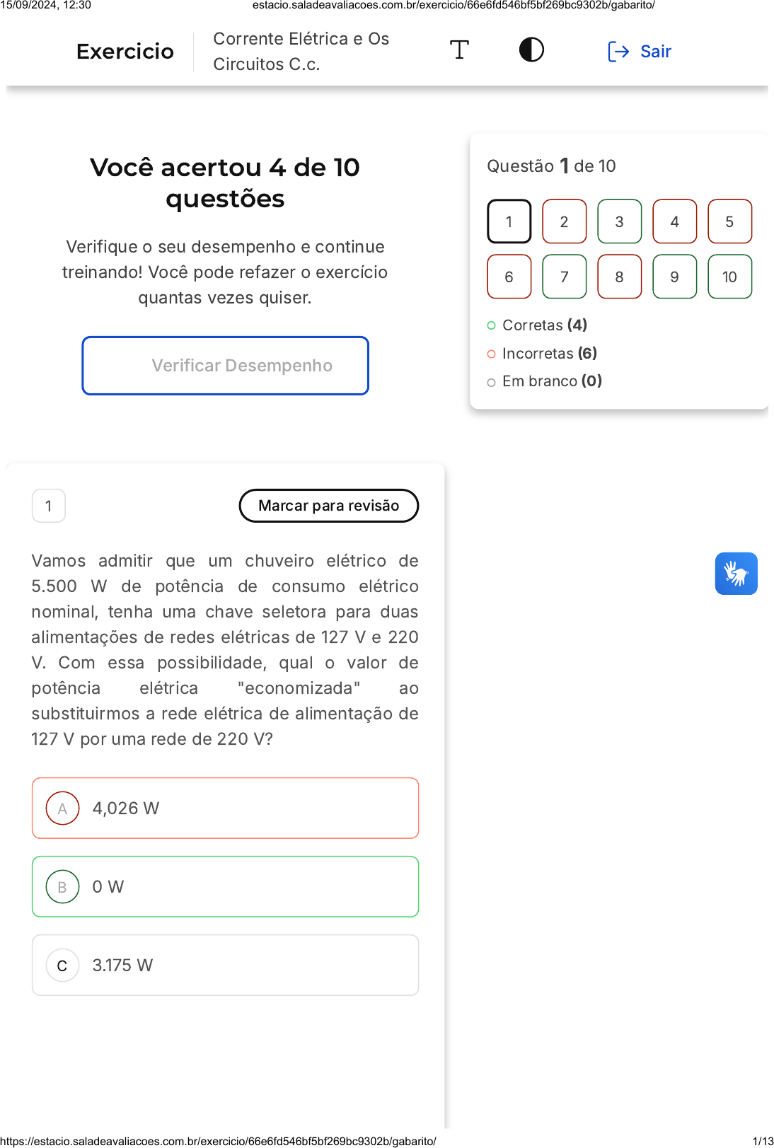 <p>Você acertou 4 de 10</p><p>questões</p><p>Verifique o seu desempenho e continue</p><p>treinando! Você pode refazer o exercício</p><p>quantas vezes quiser.</p><p>Verificar Desempenho</p><p>A</p><p>B</p><p>C</p><p>1 Marcar para revisão</p><p>Vamos admitir que um chuveiro elétrico de</p><p>5.500 W de potência de consumo elétrico</p><p>nominal, tenha uma chave seletora para duas</p><p>alimentações de redes elétricas de 127 V e 220</p><p>V. Com essa possibilidade, qual o valor de</p><p>potência elétrica "economizada" ao</p><p>substituirmos a rede elétrica de alimentação de</p><p>127 V por uma rede de 220 V?</p><p>4,026 W</p><p>0 W</p><p>3.175 W</p><p>Questão 1 de 10</p><p>Corretas �4�</p><p>Incorretas �6�</p><p>Em branco �0�</p><p>1 2 3 4 5</p><p>6 7 8 9 10</p><p>Exercicio</p><p>Corrente Elétrica e Os</p><p>Circuitos C.c.</p><p>Sair</p><p>15/09/2024, 12:30 estacio.saladeavaliacoes.com.br/exercicio/66e6fd546bf5bf269bc9302b/gabarito/</p><p>https://estacio.saladeavaliacoes.com.br/exercicio/66e6fd546bf5bf269bc9302b/gabarito/ 1/13</p><p>D</p><p>E</p><p>9.526 W</p><p>2.325 W</p><p>Resposta incorreta</p><p>Opa! A alternativa correta é a letra</p><p>B. Confira o gabarito comentado!</p><p>Gabarito Comentado</p><p>A potência elétrica de um aparelho é uma</p><p>característica intrínseca do mesmo, ou</p><p>seja, não varia com a tensão da rede</p><p>elétrica. Portanto, ao mudar a rede elétrica</p><p>de alimentação de 127 V para 220 V, a</p><p>potência do chuveiro permanecerá a</p><p>mesma, ou seja, 5.500 W. Assim, não há</p><p>economia de potência elétrica nessa</p><p>substituição, o que nos leva à alternativa</p><p>correta: 0 W.</p><p>2 Marcar para revisão</p><p>Um circuito elétrico simples, possui uma f.e.m.</p><p>ideal (resistência interna zero) de 8 V e um</p><p>resistor ôhmico de 4Ω. Sua corrente elétrica,</p><p>com esse resistor elétrico de 4Ω, é de I � 2 A. A</p><p>potência consumida por esse resistor é P �</p><p>16 W. Mas se substituirmos o resistor de 4Ω por</p><p>outro resistor com 8Ω, qual será a potência de</p><p>consumo do novo resistor elétrico de 8Ω?</p><p>15/09/2024, 12:30 estacio.saladeavaliacoes.com.br/exercicio/66e6fd546bf5bf269bc9302b/gabarito/</p><p>https://estacio.saladeavaliacoes.com.br/exercicio/66e6fd546bf5bf269bc9302b/gabarito/ 2/13</p><p>A</p><p>B</p><p>C</p><p>D</p><p>E</p><p>P � 16 W</p><p>P � 0 W</p><p>P � 8 W</p><p>P � 10 W</p><p>P � 4 W</p><p>Resposta incorreta</p><p>Opa! A alternativa correta é a letra</p><p>C. Confira o gabarito comentado!</p><p>Gabarito Comentado</p><p>P � 8 W</p><p>3 Marcar para revisão</p><p>Considere que trés resistores retangulares säo</p><p>construidos do mesmo material com</p><p>resistividade p. O resistor 1 tem área de seção</p><p>reta \�A\� e comprimento \�L\�, o resistor 2 tem</p><p>área de seção reta \�2 A\� e comprimento \�L\�,</p><p>e o resistor 3 tem área de seçảo reta \�A / 2\� e</p><p>comprimento \�L / 2\�. Cada um dos resistores</p><p>foi submetido a mesma diferença de potencial</p><p>entre suas extremidades, assim, pode-se</p><p>afirmar sobre os módulos \�J_i=(i=1,2,3�\) das</p><p>densidades de corrente que fluem ao longo</p><p>deles e sobre suas resistências \�R_t\� que:</p><p>15/09/2024, 12:30 estacio.saladeavaliacoes.com.br/exercicio/66e6fd546bf5bf269bc9302b/gabarito/</p><p>https://estacio.saladeavaliacoes.com.br/exercicio/66e6fd546bf5bf269bc9302b/gabarito/ 3/13</p><p>A</p><p>B</p><p>C</p><p>D</p><p>E</p><p>J = J = J e R = R = R1 2 3 1 2 3</p><p>J = J = J /2 e R = R = R1 2 3 1 2 3</p><p>J = J = J /2 e R = 2R = R1 2 3 1 2 3</p><p>J = J /4 � J e R = 2R = R1 2 3 1 2 3</p><p>J = J = 2J e 2R = 4R = R1 2 3 1 2 3</p><p>Resposta correta</p><p>Parabéns, você selecionou a</p><p>alternativa correta. Confira o</p><p>gabarito comentado!</p><p>Gabarito Comentado</p><p>Resistência é dada por:</p><p>$$</p><p>R�\frac{\rho L}�A�</p><p>$$</p><p>Válida para condutores com área de seção</p><p>reta \�A\� constante.</p><p>Resistor 1: área de seção reta \�A\� e</p><p>comprimento \�L\�.</p><p>$$</p><p>\begin{gathered}</p><p>R_1�\frac{\rho L}�A��R \\</p><p>R�R_1</p><p>\end{gathered}</p><p>$$</p><p>Resistor 2: área de seção reta \�2 A\� e</p><p>comprimento \�L\�.</p><p>$$</p><p>\begin{gathered}</p><p>R_2�\frac{\rho L}�2 A��\frac{R��2} \\</p><p>R�2 R_2</p><p>15/09/2024, 12:30 estacio.saladeavaliacoes.com.br/exercicio/66e6fd546bf5bf269bc9302b/gabarito/</p><p>https://estacio.saladeavaliacoes.com.br/exercicio/66e6fd546bf5bf269bc9302b/gabarito/ 4/13</p><p>\end{gathered}</p><p>$$</p><p>Resistor 3: área de seçäo reta \(\mathrm{A�</p><p>/ 2\) e comprimento \(\mathrm{L� / 2\)</p><p>$$</p><p>\begin{gathered}</p><p>R_3�\frac{\rho L / 2��A / 2��R \\</p><p>R�R_3</p><p>\end{gathered}</p><p>$$</p><p>Logo: \�R_1�2 R_2�R_3\)</p><p>Calculando a densidade de corrente.</p><p>Sabemos que:</p><p>$$</p><p>\begin{aligned}</p><p>& J�\frac{l}{A} \\</p><p>& J�\frac{V��R A}</p><p>\end{aligned}</p><p>$$</p><p>$$</p><p>\underline{\mathrm{e}} l=V / R_f \log 0�</p><p>$$</p><p>$$</p><p>J�\frac{V��R A}</p><p>$$</p><p>Resistor 1: área de seçäo reta \�A\� e</p><p>comprimento \�L\�.</p><p>$$</p><p>\begin{gathered}</p><p>J_1�\frac{V��R_1 A_1� \\</p><p>J_1�\frac{V��R A}�J \\</p><p>J_1�J</p><p>\end{gathered}</p><p>$$</p><p>Resistor 2: área de seçäo reta \�2 A\� e</p><p>comprimento \�L\�.</p><p>$$</p><p>\begin{gathered}</p><p>J_2�\frac{V��R_2 A_2� \\</p><p>J_2�\frac{V��\left(\frac{R��2}\right) 2</p><p>A��\frac{V��R A} \\</p><p>J_2�J</p><p>\end{gathered}</p><p>15/09/2024, 12:30 estacio.saladeavaliacoes.com.br/exercicio/66e6fd546bf5bf269bc9302b/gabarito/</p><p>https://estacio.saladeavaliacoes.com.br/exercicio/66e6fd546bf5bf269bc9302b/gabarito/ 5/13</p><p>A</p><p>B</p><p>C</p><p>$$</p><p>Resistor 3:
