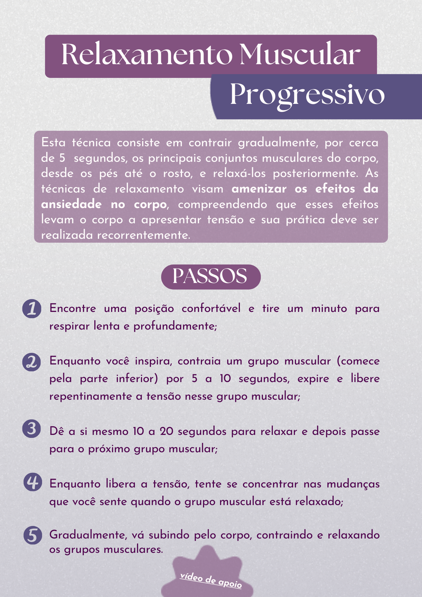 <p>Relaxamento Muscular Progressivo Esta técnica consiste em contrair gradualmente, por cerca de 5 segundos, os principais conjuntos musculares do corpo, desde os pés até o rosto, e posteriormente. As técnicas de relaxamento visam amenizar os efeitos da ansiedade no corpo, compreendendo que esses efeitos levam O corpo a apresentar tensão e sua prática deve ser realizada recorrentemente PASSOS 1 Encontre uma posição confortável e tire um minuto para respirar lenta e profundamente; 2 Enquanto você inspira, contraia um grupo muscular (comece pela parte inferior) por 5 a 10 segundos, expire e libere repentinamente a tensão nesse grupo muscular; 3 Dê a si mesmo 10 a 20 segundos para relaxar e depois passe para o próximo grupo muscular; 4 Enquanto libera a tensão, tente se concentrar nas mudanças que você sente quando o grupo muscular está relaxado; 5 Gradualmente, vá subindo pelo corpo, contraindo e relaxando os grupos musculares. video de apoio</p>