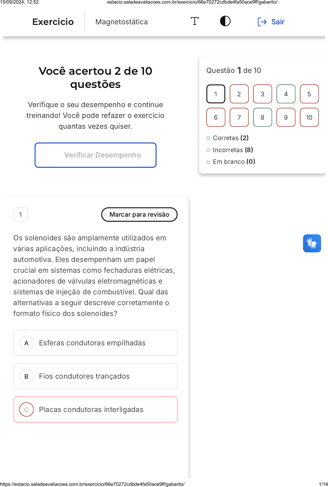 <p>Você acertou 2 de 10</p><p>questões</p><p>Verifique o seu desempenho e continue</p><p>treinando! Você pode refazer o exercício</p><p>quantas vezes quiser.</p><p>Verificar Desempenho</p><p>A</p><p>B</p><p>C</p><p>1 Marcar para revisão</p><p>Os solenoides são amplamente utilizados em</p><p>várias aplicações, incluindo a indústria</p><p>automotiva. Eles desempenham um papel</p><p>crucial em sistemas como fechaduras elétricas,</p><p>acionadores de válvulas eletromagnéticas e</p><p>sistemas de injeção de combustível. Qual das</p><p>alternativas a seguir descreve corretamente o</p><p>formato físico dos solenoides?</p><p>Esferas condutoras empilhadas</p><p>Fios condutores trançados</p><p>Placas condutoras interligadas</p><p>Questão 1 de 10</p><p>Corretas �2�</p><p>Incorretas �8�</p><p>Em branco �0�</p><p>1 2 3 4 5</p><p>6 7 8 9 10</p><p>Exercicio Magnetostática Sair</p><p>15/09/2024, 12:52 estacio.saladeavaliacoes.com.br/exercicio/66e70272cdbde4fa50ace9ff/gabarito/</p><p>https://estacio.saladeavaliacoes.com.br/exercicio/66e70272cdbde4fa50ace9ff/gabarito/ 1/14</p><p>D</p><p>E</p><p>Anéis condutores entrelaçados</p><p>Espiras condutoras em formato</p><p>helicoidal</p><p>Resposta incorreta</p><p>Opa! A alternativa correta é a letra</p><p>E. Confira o gabarito comentado!</p><p>Gabarito Comentado</p><p>Os solenoides são compostos por espiras</p><p>condutoras dispostas em formato</p><p>helicoidal. Essa configuração permite que a</p><p>corrente elétrica flua ao longo do</p><p>solenoide, gerando um campo magnético</p><p>concentrado e eficiente.</p><p>2 Marcar para revisão</p><p>Seja um feixe de partículas positivas, de cargas</p><p>individuais q=1,6 �10 C, que se movem com</p><p>velocidade em módulo , e</p><p>que adentram uma região de campo magnético</p><p>uniforme . A velocidade das</p><p>partículas está no plano xz e forma um ângulo</p><p>de 30 com a direção positiva de z. Calcule o</p><p>vetor força magnética que atuará sobre cada</p><p>partícula no exato instante que entrar em</p><p>contato com esse campo magnético.</p><p>�19</p><p>|→v| = 3, 0 × 105m/s</p><p>→B = 2, 0Tk̂</p><p>o</p><p>15/09/2024, 12:52 estacio.saladeavaliacoes.com.br/exercicio/66e70272cdbde4fa50ace9ff/gabarito/</p><p>https://estacio.saladeavaliacoes.com.br/exercicio/66e70272cdbde4fa50ace9ff/gabarito/ 2/14</p><p>A</p><p>B</p><p>C</p><p>D</p><p>E</p><p>→F = 4, 8 × 10−14N ĵ</p><p>→F = −4, 8 × 10−14N ĵ</p><p>→F = 8, 3 × 10−14Nk̂</p><p>→F = −8, 3 × 10−14Nk̂</p><p>→F = −4, 8 × 10−14N î</p><p>Resposta incorreta</p><p>Opa! A alternativa correta é a letra</p><p>B. Confira o gabarito comentado!</p><p>Gabarito Comentado</p><p>A força magnética que atua sobre uma</p><p>partícula carregada em movimento é dada</p><p>pela expressão , onde é a</p><p>velocidade da partícula, é o campo</p><p>magnético e é a carga da partícula. Neste</p><p>caso, a velocidade da partícula está no</p><p>plano xz e forma um ângulo de 30 graus</p><p>com a direção positiva de z. O campo</p><p>magnético é uniforme e aponta na direção</p><p>k. Ao realizar o produto vetorial entre a</p><p>velocidade e o campo magnético, obtemos</p><p>que a força magnética atua na direção</p><p>negativa de j, ou seja,</p><p>.</p><p>→F = q(→v × →B) →v</p><p>→B</p><p>q</p><p>→F = −4, 8 × 10−14N ĵ</p><p>3 Marcar para revisão</p><p>15/09/2024, 12:52 estacio.saladeavaliacoes.com.br/exercicio/66e70272cdbde4fa50ace9ff/gabarito/</p><p>https://estacio.saladeavaliacoes.com.br/exercicio/66e70272cdbde4fa50ace9ff/gabarito/ 3/14</p><p>A</p><p>B</p><p>C</p><p>D</p><p>E</p><p>Na teoria eletrodinâmica clássica, o campo</p><p>magnetostático é estudado em relação à sua</p><p>integral de fluxo fechada e sua relação com as</p><p>cargas magnéticas. Ao contrário das cargas</p><p>elétricas, não existem cargas magnéticas</p><p>pontuais na teoria eletrodinâmica clássica.</p><p>Portanto, surge a questão sobre o valor da</p><p>integral de Gauss do campo magnetostático.</p><p>Qual é o resultado da integral de Gauss do</p><p>campo magnetostático em uma superfície</p><p>fechada?</p><p>Zero</p><p>Positivo</p><p>Negativo</p><p>Indeterminado</p><p>Infinito</p><p>Resposta incorreta</p><p>Opa! A alternativa correta é a letra</p><p>A. Confira o gabarito comentado!</p><p>Gabarito Comentado</p><p>Na teoria eletrodinâmica clássica, não</p><p>existem cargas magnéticas pontuais, ou</p><p>seja, monopolos magnéticos. Portanto, a</p><p>integral de Gauss do campo</p><p>magnetostático em uma superfície fechada</p><p>será sempre zero. Essa resposta exata nos</p><p>mostra que não há fontes magnéticas</p><p>15/09/2024, 12:52 estacio.saladeavaliacoes.com.br/exercicio/66e70272cdbde4fa50ace9ff/gabarito/</p><p>https://estacio.saladeavaliacoes.com.br/exercicio/66e70272cdbde4fa50ace9ff/gabarito/ 4/14</p><p>isoladas e independentes no campo</p><p>magnetostático.</p><p>4 Marcar para revisão</p><p>Um próton move-se na horizontal, livre de</p><p>qualquer tipo de força, à velocidade da luz,</p><p>quando entra em um campo magnético</p><p>orientado de baixo para cima, e então começa a</p><p>realizar uma curva, de baixo para cima. Durante</p><p>a sua curva, o próton alcança um ponto em que</p><p>passa a experimentar também um campo</p><p>elétrico orientado de cima para baixo, e por</p><p>conta disto, volta a se mover em linha reta, da</p><p>esquerda para a direita, como ilustra a figura</p><p>abaixo, onde a trajetória do próton é a linha</p><p>azul:</p><p>15/09/2024, 12:52 estacio.saladeavaliacoes.com.br/exercicio/66e70272cdbde4fa50ace9ff/gabarito/</p><p>https://estacio.saladeavaliacoes.com.br/exercicio/66e70272cdbde4fa50ace9ff/gabarito/ 5/14</p><p>A</p><p>B</p><p>C</p><p>D</p><p>E</p><p>Na terceira etapa do trajeto, onde o próton</p><p>retorna a se mover em linha reta, atua sobre ele:</p><p>a força de Lorentz</p><p>a força magnética somente</p><p>a força