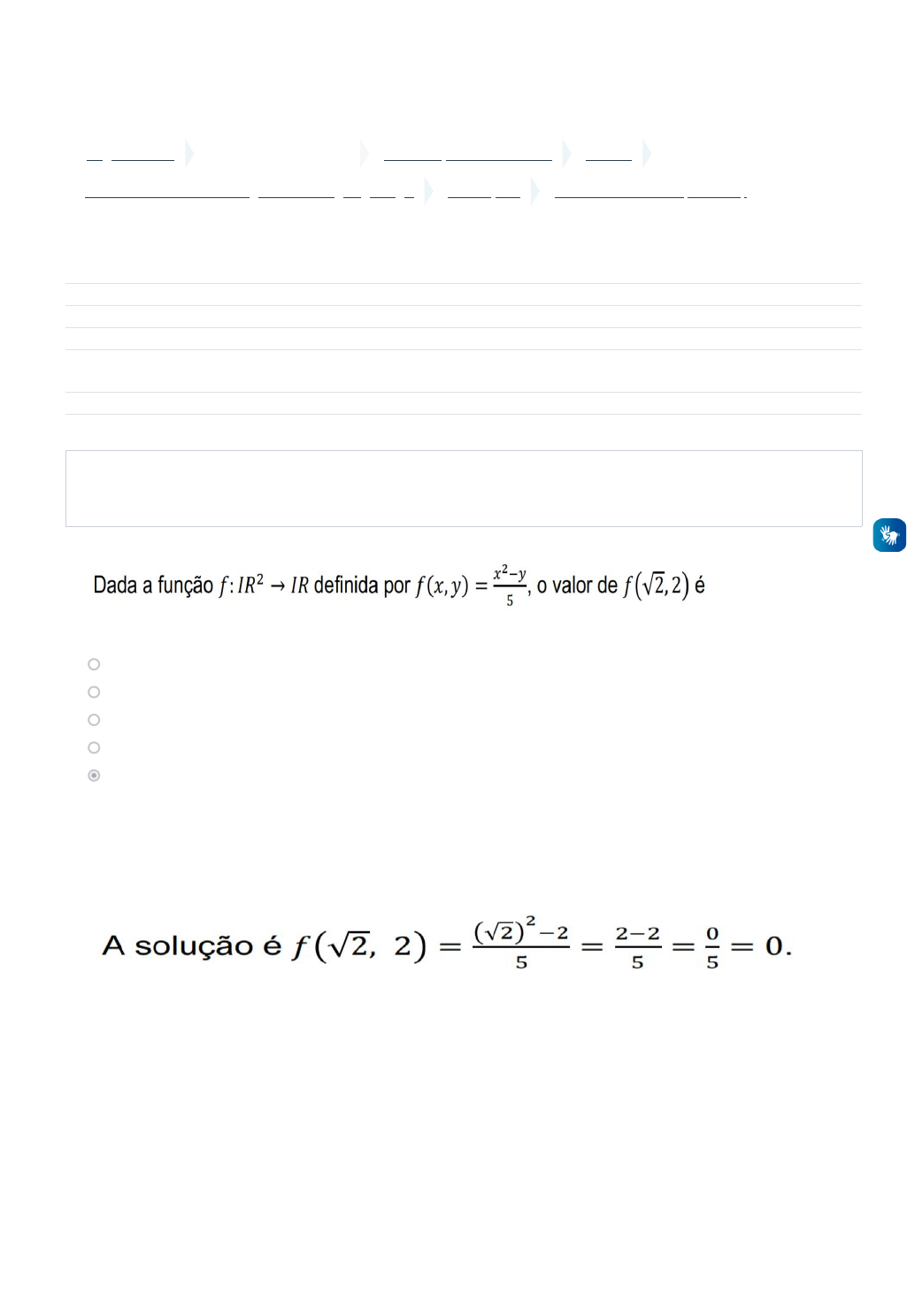 <p>...</p><p>Página inicial Disciplinas e Espaços GRADUAÇÃO A DISTÂNCIA 2022-3</p><p>Cálculo Diferencial e Integral III - 2022_03_EAD_A Avaliações P1 -- Prova On-line (Acessar)</p><p>IInniicciiaaddoo eemm sábado, 10 set 2022, 14:52</p><p>EEssttaaddoo Finalizada</p><p>CCoonncclluuííddaa eemm sábado, 10 set 2022, 15:22</p><p>TTeemmppoo</p><p>eemmpprreeggaaddoo</p><p>30 minutos 17 segundos</p><p>NNoottaass 6,00/8,00</p><p>AAvvaalliiaarr 77,,5500 de um máximo de 10,00(7755%)</p><p>Questão 11</p><p>Correto</p><p>Atingiu 1,00 de 1,00</p><p>Escolha uma opção:</p><p>0,4</p><p>1,6</p><p>Impossível</p><p>0,8</p><p>0 </p><p>Sua resposta está correta.</p><p>Nessa questão o aluno deverá ser capaz de calcular o valor de uma função de duas variáveis num ponto dado.</p><p>A resposta correta é: 0</p><p>P1 -- Prova On-line (Acessar) https://ava.candidomendes.edu.br/moodle/mod/quiz/review.php?attempt=242137&cmid=330776</p><p>1 of 6 13/09/2022 10:11</p><p>https://ava.candidomendes.edu.br/moodle/</p><p>https://ava.candidomendes.edu.br/moodle/</p><p>https://ava.candidomendes.edu.br/moodle/course/index.php?categoryid=8</p><p>https://ava.candidomendes.edu.br/moodle/course/index.php?categoryid=8</p><p>https://ava.candidomendes.edu.br/moodle/course/index.php?categoryid=122</p><p>https://ava.candidomendes.edu.br/moodle/course/index.php?categoryid=122</p><p>https://ava.candidomendes.edu.br/moodle/course/view.php?id=10501</p><p>https://ava.candidomendes.edu.br/moodle/course/view.php?id=10501</p><p>https://ava.candidomendes.edu.br/moodle/course/view.php?id=10501§ion=4</p><p>https://ava.candidomendes.edu.br/moodle/course/view.php?id=10501§ion=4</p><p>https://ava.candidomendes.edu.br/moodle/mod/quiz/view.php?id=330776</p><p>https://ava.candidomendes.edu.br/moodle/mod/quiz/view.php?id=330776</p><p>Questão 22</p><p>Correto</p><p>Atingiu 1,00 de 1,00</p><p>Escolha uma opção:</p><p></p><p>Sua resposta está correta.</p><p>A resposta correta é:</p><p>P1 -- Prova On-line (Acessar) https://ava.candidomendes.edu.br/moodle/mod/quiz/review.php?attempt=242137&cmid=330776</p><p>2 of 6 13/09/2022 10:11</p><p>Questão 33</p><p>Incorreto</p><p>Atingiu 0,00 de 1,00</p><p>Questão 44</p><p>Correto</p><p>Atingiu 1,00 de 1,00</p><p>Escolha uma opção:</p><p>- 138</p><p>69</p><p>138</p><p>- 46</p><p>46 </p><p>Sua resposta está incorreta.</p><p>A resposta correta é: 69</p><p>Assinale o item que contém a afirmação CORRETA.</p><p>Escolha uma opção:</p><p>a.</p><p></p><p>b.</p><p>c. \( \)</p><p>d. (</p><p>e.</p><p>( , π, e) ∈ IRˆ33–√</p><p>(2, 5; −1, 0) ∈ IRˆ4</p><p>(−3, 2, 7) ∈ IRˆ2</p><p>(−2, 3, 5) ∈ IRˆ2</p><p>(0, 0) ∈ IR</p><p>Sua resposta está correta.</p><p>A resposta correta é: ( , π, e) ∈ IRˆ33–√</p><p>P1 -- Prova On-line (Acessar) https://ava.candidomendes.edu.br/moodle/mod/quiz/review.php?attempt=242137&cmid=330776</p><p>3 of 6 13/09/2022 10:11</p><p>Questão 55</p><p>Correto</p><p>Atingiu 1,00 de 1,00</p><p>A figura abaixo, representa um mapa de contorno de uma função de produção de Cobb – Douglas e o ponto S</p><p>(L ,K ) pertence à curva de nível correspondente ao P =140.</p><p>A alternativa que contém informações corretas sobre as coordenadas do ponto S é:</p><p>Escolha uma opção:</p><p></p><p>2 2 2</p><p>Sua resposta está correta.</p><p>Essa questão aplica a definição de curva de nível.</p><p>O pontoS (L ,K ) é tal que .</p><p>A resposta correta é:</p><p>2 2</p><p>P1 -- Prova On-line (Acessar) https://ava.candidomendes.edu.br/moodle/mod/quiz/review.php?attempt=242137&cmid=330776</p><p>4 of 6 13/09/2022 10:11</p><p>Questão 66</p><p>Correto</p><p>Atingiu 1,00 de 1,00</p><p>Questão 77</p><p>Correto</p><p>Atingiu 1,00 de 1,00</p><p>Escolha uma opção:</p><p>Há dois valores diferentes de x. </p><p>Os valores de x não são opostos.</p><p>Os valores de x são maiores que 1.</p><p>Os valores de x são ambos negativos.</p><p>Os valores de x são positivos.</p><p>Sua resposta está correta.</p><p>Logo há dois valores diferentes de x.</p><p>A resposta correta é: Há dois valores diferentes de x.</p><p>Escolha uma opção:</p><p>4 </p><p>1</p><p>0</p><p>14−−√</p><p>15−−√</p><p>Sua resposta está correta.</p><p>A resposta correta é: 4</p><p>P1 -- Prova On-line (Acessar) https://ava.candidomendes.edu.br/moodle/mod/quiz/review.php?attempt=242137&cmid=330776</p><p>5 of 6 13/09/2022 10:11</p><p>P1 -- Prova On-line (Acessar) https://ava.candidomendes.edu.br/moodle/mod/quiz/review.php?attempt=242137&cmid=330776</p><p>6 of 6 13/09/2022 10:11</p>