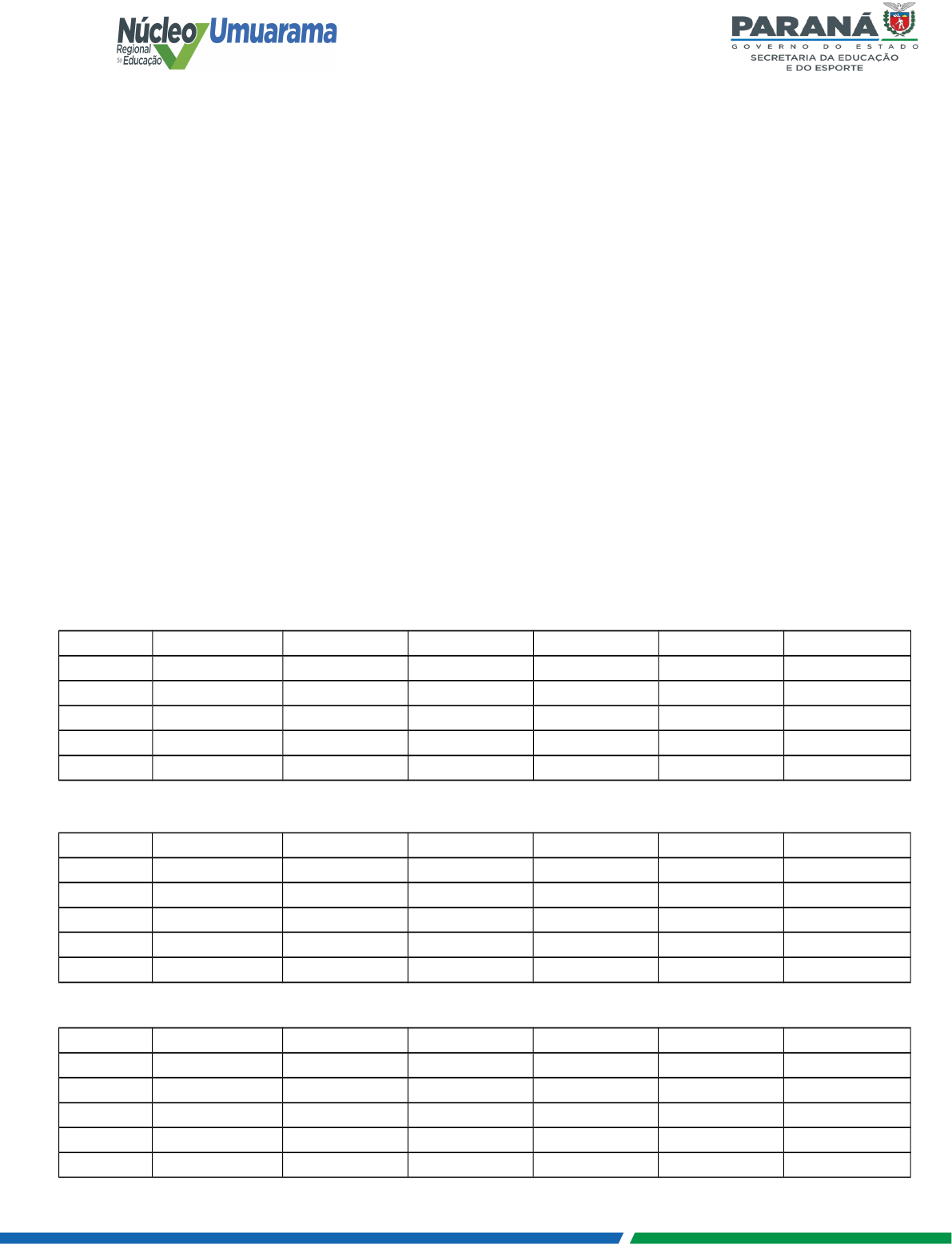 <p>GOVERNO DO ESTADO DO PARANÁ</p><p>SECRETARIA DE ESTADO DA EDUCAÇÃO E DO ESPORTE</p><p>NÚCLEO REGIONAL DE EDUCAÇÃO DE UMUARAMA</p><p>Avenida Maringá, 5035 - Zona III, Umuarama - PR, 87502-080 – 44 3621-8600</p><p>MAPA DE AULAS</p><p>MUNICÍPIO: Pérola</p><p>Dia: 06/09/2024 – SEXTA-FEIRA Horário: 11:00 hs</p><p>Local: COL. EST. NESTOR VICTOR - Pérola</p><p>RESPONSÁVEL: MARIA ZÉLIA</p><p>Tel. 36361672 Cel. 998294568</p><p>ESTABELECIMENTO: COLÉGIO ESTADUAL NESTOR VICTOR – EFMP.</p><p>Disciplina: - HISTÓRIA ; - ÁREAS AFINS: Filosofia ou Geografia ou</p><p>Sociologia</p><p>Quant. de Aulas: 19 HA: 06 Total - Carga Horária: 25</p><p>( ) Aulas Definitivas( X ) Aulas de Substituição</p><p>Ensino Fundamental (X) Ensino Médio ( X) EJA( ) Profissionalizante ( )</p><p>Período de Afastamento: 14 dias</p><p>Titular das aulas: Ivania Baesso Guizilini</p><p>MANHÃ</p><p>TARDE</p><p>Aulas Horário: SEGUNDA TERÇA QUARTA QUINTA SEXTA</p><p>1 ª Aula 13:00 -13:50 7ºC 7ºF</p><p>2 ª Aula 13:50 -14:40 8ºD 7ºE</p><p>3 ª Aula 14:40 -15:30 6ºA 8ºD</p><p>4 ª Aula 15:45 -16:35 6ºB 6ºC</p><p>5 ª Aula 16:35 - 17:25 8ºD 7ºD</p><p>NOITE</p><p>Aulas Horário: SEGUNDA TERÇA QUARTA QUINTA SEXTA</p><p>1 ª Aula 18:50 -19:40</p><p>2 ª Aula 19:40 -20:30 3ºB</p><p>3 ª Aula 20:40 -21:30 2ºC</p><p>4 ª Aula 21:30 -22:20 3ºB</p><p>5 ª Aula 22:20 - 23:10 2ºC</p><p>Aulas Horário: SEGUNDA TERÇA QUARTA QUINTA SEXTA</p><p>1 ª Aula 07:30 - 08:10</p><p>2 ª Aula 08:10 - 09:10</p><p>3 ª Aula 09:10 - 10:00 8ºA</p><p>4 ª Aula 10:15 - 11:05 7ºA 7ºB</p><p>5 ª Aula 11:05 - 11:55 8ºA 8ºA</p><p>MUNICÍPIO: Pérola</p><p>Local: COL. EST. NESTOR VICTOR - Pérola</p><p>RESPONSÁVEL: MARIA ZÉLIA</p><p>Tel. 36361672 Cel. 998294568</p>