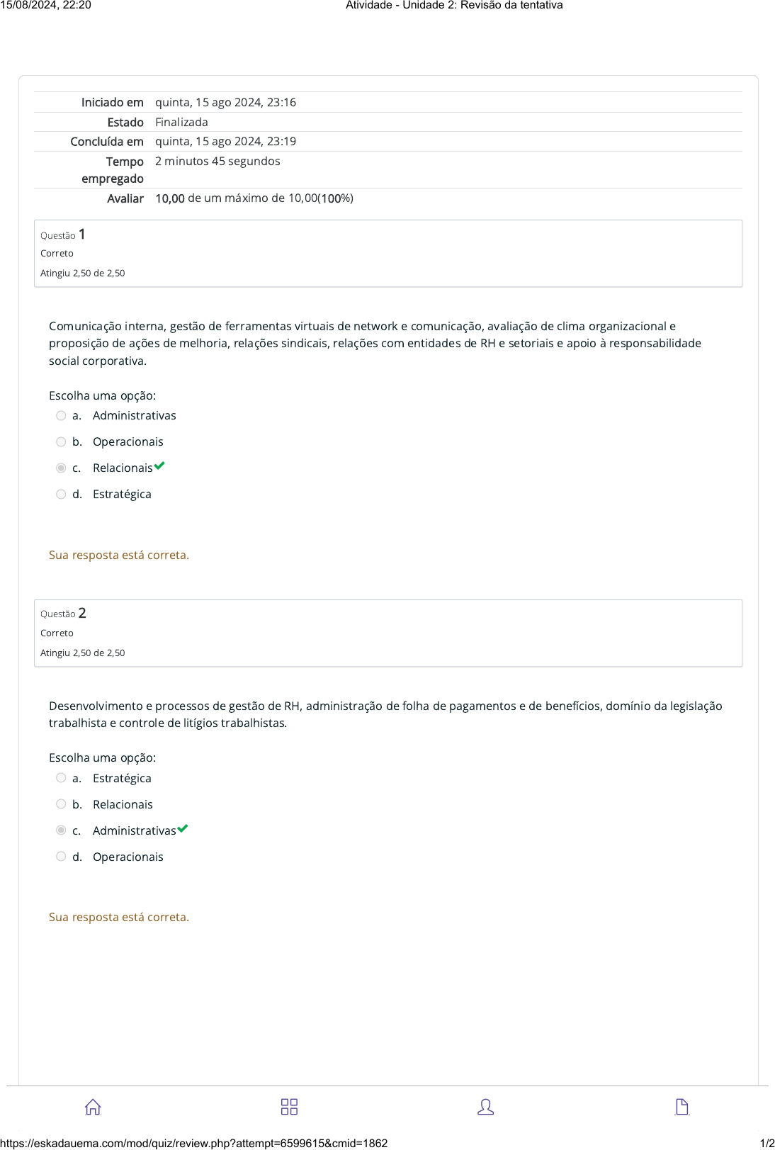 <p>Iniciado em quinta, 15 ago 2024, 23:16</p><p>Estado Finalizada</p><p>Concluída em quinta, 15 ago 2024, 23:19</p><p>Tempo</p><p>empregado</p><p>2 minutos 45 segundos</p><p>Avaliar 10,00 de um máximo de 10,00(100%)</p><p>Questão 1</p><p>Correto</p><p>Atingiu 2,50 de 2,50</p><p>Questão 2</p><p>Correto</p><p>Atingiu 2,50 de 2,50</p><p>Comunicação interna, gestão de ferramentas virtuais de network e comunicação, avaliação de clima organizacional e</p><p>proposição de ações de melhoria, relações sindicais, relações com entidades de RH e setoriais e apoio à responsabilidade</p><p>social corporativa.</p><p>Escolha uma opção:</p><p>a. Administrativas</p><p>b. Operacionais</p><p>c. Relacionais</p><p>d. Estratégica</p><p>Sua resposta está correta.</p><p>Desenvolvimento e processos de gestão de RH, administração de folha de pagamentos e de benefícios, domínio da legislação</p><p>trabalhista e controle de litígios trabalhistas.</p><p>Escolha uma opção:</p><p>a. Estratégica</p><p>b. Relacionais</p><p>c. Administrativas</p><p>d. Operacionais</p><p>Sua resposta está correta.</p><p> </p><p>15/08/2024, 22:20 Atividade - Unidade 2: Revisão da tentativa</p><p>https://eskadauema.com/mod/quiz/review.php?attempt=6599615&cmid=1862 1/2</p><p>https://eskadauema.com/my</p><p>https://eskadauema.com/my</p><p>https://eskadauema.com/index.php?redirect=0</p><p>https://eskadauema.com/index.php?redirect=0</p><p>https://eskadauema.com/user/edit.php?id=</p><p>https://eskadauema.com/user/edit.php?id=</p><p>https://eskadauema.com/theme/olm/certificates.php</p><p>https://eskadauema.com/theme/olm/certificates.php</p><p>Questão 3</p><p>Correto</p><p>Atingiu 2,50 de 2,50</p><p>Questão 4</p><p>Correto</p><p>Atingiu 2,50 de 2,50</p><p>Termos de uso</p><p>Política de privacidade</p><p>Recrutamento e seleção, plano de carreira, compensação e benefícios, programas de desenvolvimento de pessoal, sistemas</p><p>de avaliação de desempenho, programas motivacionais, saúde e segurança ambiental e apoio aos executivos em suas</p><p>funções como reais gestores de gente.</p><p>Escolha uma opção:</p><p>a. Administrativas</p><p>b. Relacionais</p><p>c. Estratégica</p><p>d. Operacionais</p><p>Sua resposta está correta.</p><p>Políticas de RH, entendimento do negócio, plano estratégico de recursos humanos, orientação a gestores para que cumpram</p><p>o papel de gestão de seu pessoal, gestão de banco de talentos e apoio como agente de mudanças.</p><p>Escolha uma opção:</p><p>a. Administrativas</p><p>b. Relacionais</p><p>c. Operacionais</p><p>d. Estratégica</p><p>Sua resposta está correta.</p><p> </p><p>15/08/2024, 22:20 Atividade - Unidade 2: Revisão da tentativa</p><p>https://eskadauema.com/mod/quiz/review.php?attempt=6599615&cmid=1862 2/2</p><p>https://eskadauema.com/admin/tool/policy/view.php?policyid=1&versionid=3</p><p>https://eskadauema.com/admin/tool/policy/view.php?policyid=2&versionid=2</p><p>https://eskadauema.com/my</p><p>https://eskadauema.com/my</p><p>https://eskadauema.com/index.php?redirect=0</p><p>https://eskadauema.com/index.php?redirect=0</p><p>https://eskadauema.com/user/edit.php?id=</p><p>https://eskadauema.com/user/edit.php?id=</p><p>https://eskadauema.com/theme/olm/certificates.php</p><p>https://eskadauema.com/theme/olm/certificates.php</p>