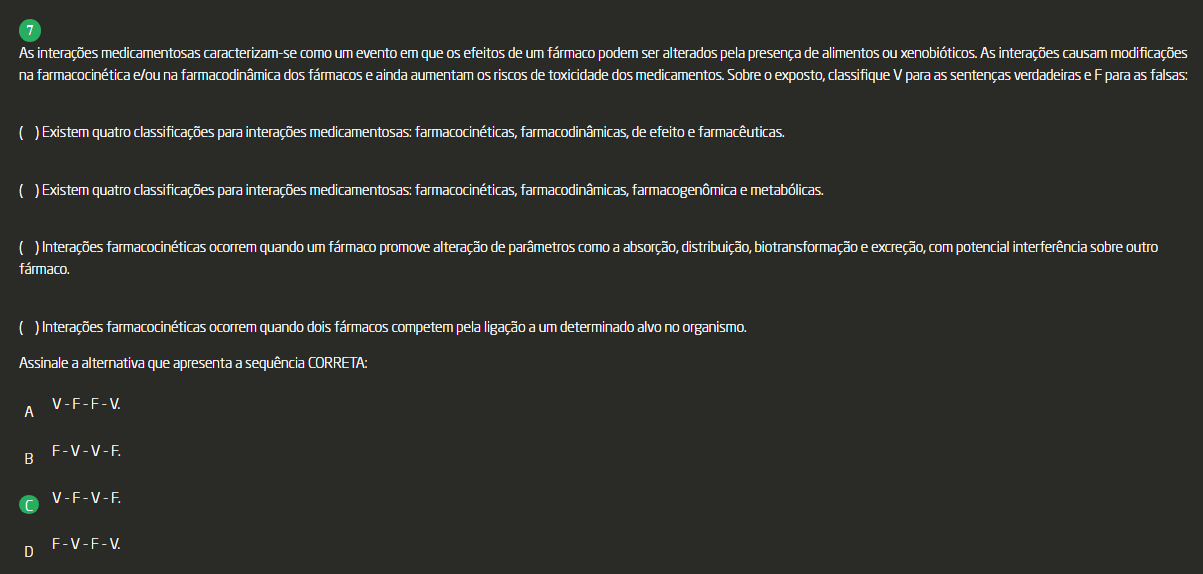 <p>7 As interações medicamentosas caracterizam-se como um evento em que efeitos de um fármaco podem ser alterados pela presença de alimentos ou As interações causam modificações na farmacocinética e/ou na farmacodinâmica dos fármacos e ainda aumentam os riscos de toxicidade dos medicamentos. Sobre exposto, classifique V para as sentenças verdadeiras e F para as falsas ( ) Existem quatro classificações para interações farmacocinéticas, farmacodinâmicas, de efeito e ( ) Existem quatro classificações para interações farmacocinéticas, farmacodinâmicas, farmacogenômica e metabólicas. ( ) Interações farmacocinéticas ocorrem quando um fármaco promove alteração de parâmetros como a absorção, distribuição, biotransformação e excreção, com potencial interferência sobre outro fármaco. ( ) Interações farmacocinéticas ocorrem quando dois fármacos competem pela ligação a um determinado alvo no organismo. Assinale a alternativa que apresenta a CORRETA: A B V-F-V-F F-V-F-V D</p>