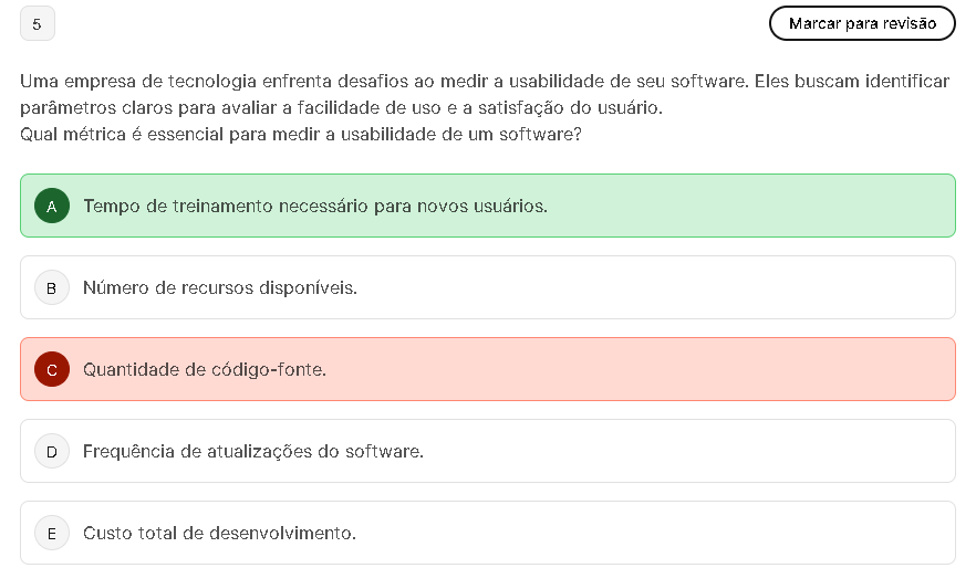 <p>5 Marcar para revisão Uma empresa de tecnologia enfrenta desafios ao medir a usabilidade de seu software. Eles buscam identificar parâmetros claros para avaliar a facilidade de uso e a satisfação do usuário. Qual métrica é essencial para medir a usabilidade de um software? A Tempo de treinamento necessário para novos usuários. B Número de recursos disponíveis. C Quantidade de código-fonte. D Frequência de atualizações do software. E Custo total de desenvolvimento.</p>