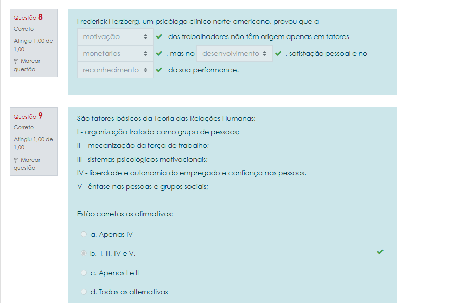 <p>Questão 8 Frederick Herzberg, um clínico norte-americano, provou que a Correto Atingiu 1.00 de motivação dos trabalhadores não têm origem apenas em fatores 1.00 monetários mas no desenvolvimento satisfação pessoal e no P Marcar questão reconhecimento da sua performance. Questão 9 São fatores básicos da Teoria das Relações Humanas: Correto - organização tratada como grupo de pessoas; Atingiu 1,00 de 1.00 - mecanização da força de trabalho; P Marcar III - sistemas psicológicos questão IV - liberdade e autonomia do empregado e confiança nas pessoas. V - ênfase nas pessoas e grupos sociais; Estão corretas as afirmativas: a. Apenas IV b. III. IV e V. Apenas I e II d. Todas as alternativas</p>
