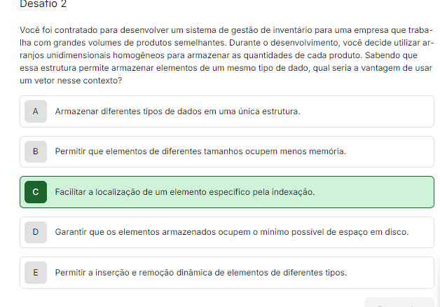 <p>Desafio 2 Você foi contratado para desenvolver um sistema de gestão de inventário para uma empresa que traba- com grandes volumes de produtos Durante desenvolvimento, você decide utilizar ar- ranjos unidimensionais homogêneos para armazenar as quantidades de cada produto. Sabendo que essa estrutura permite armazenar elementos de um mesmo tipo de dado, qual seria a vantagem de usar um vetor nesse contexto? A Armazenar diferentes tipos de dados em uma B Permitir que elementos de diferentes tamanhos ocupem menos C Facilitar a localização de um elemento específico pela indexação. D Garantir que os elementos armazenados ocupem mínimo possível de espaço em disco. E Permitir a inserção e remoção dinâmica de elementos de diferentes tipos.</p>