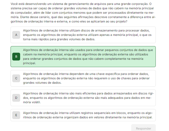<p>Você está desenvolvendo um sistema de gerenciamento de arquivos para uma grande corporação. sistema precisa ser capaz de ordenar grandes volumes de dados que não cabem na memória principal do computador, além de lidar com conjuntos menores que podem ser processados diretamente na me- Diante desse cenário, qual das seguintes afirmações descreve corretamente a diferença entre al- goritmos de ordenação interna e externa, e como eles se aplicariam ao seu projeto? Algoritmos de ordenação interna utilizam discos de armazenamento para processar dados, A enquanto os algoritmos de ordenação externa utilizam apenas a principal, o que os torna mais rápidos para grandes volumes de dados. Algoritmos de ordenação interna são usados para ordenar pequenos conjuntos de dados que cabem na memória principal, enquanto os algoritmos de ordenação externa são utilizados para ordenar grandes conjuntos de dados que não cabem completamente na memória principal. Algoritmos de ordenação interna dependem de uma chave específica para ordenar dados, C enquanto os algoritmos de ordenação externa não requerem O uso de chaves para ordenar grandes volumes de dados. Algoritmos de ordenação interna são mais eficientes para dados armazenados em discos rigi- D dos, enquanto os algoritmos de ordenação externa são mais adequados para dados em me- Algoritmos de ordenação interna utilizam registros sequenciais em blocos, enquanto os algo- E ritmos de ordenação externa organizam dados em vetores diretamente na memória Responder</p>