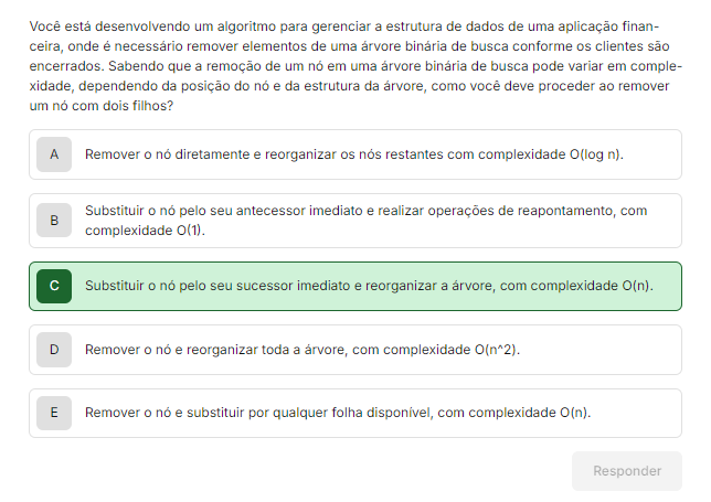 <p>Você está desenvolvendo um algoritmo para gerenciar a estrutura de dados de uma aplicação finan- ceira, onde é necessário remover elementos de uma binária de busca conforme os clientes são Sabendo que a remoção de um em uma de busca pode em comple- xidade, dependendo da posição do nó e da estrutura da como você deve proceder ao remover um nó com dois filhos? A Remover O nó diretamente e reorganizar os restantes com complexidade O(log n). Substituir nó pelo seu antecessor imediato e realizar operações de reapontamento, com B complexidade O(1). C Substituir nó pelo seu sucessor imediato e reorganizar a com complexidade O(n). D Remover nó e reorganizar toda a com complexidade O(n^2). E Remover nó e substituir por qualquer folha disponível, com complexidade O(n). Responder</p>