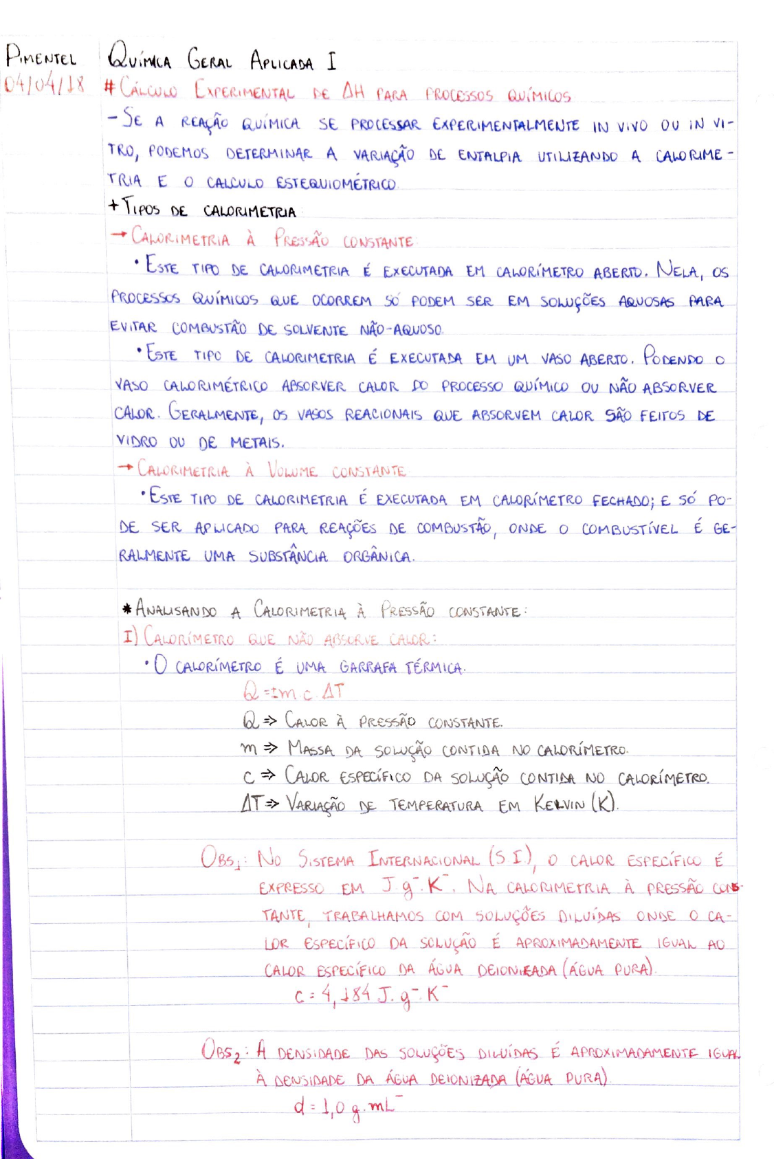 <p>PIMENTEL GERAL APLICADA I 04/04/18 # CALCULO EXPERIMENTAL DE AH PARA PROCESSOS - A SE PROCESSAR EXPERIMENTALMENTE IN VIVO ou IN TRO, PODEMOS DETERMINAR A DE ENTALPIA UTILIZANDO A TRIA E CALCULO + TIPOS DE CALORIMETRIA CALORIMETRIA CONSTANTE ESTE TIPO DE CALORIMETRIA É EXECUTADA EM ABERTO. NELA, OS PROCESSOS QUE OCORREM PODEM SER EM SOLUÇÕES AQUOSAS PARA EVITAR COMBUSTÃO DE SOLVENTE ESTE TIPO DE CALORIMETRIA É EXECUTADA EM UM VASO ABERTO. PODENDO VASO ABSORVER CALOR DO PROCESSO QUÍMICO ou NÃO ABSORVER GERALMENTE, VASOS REACIONAIS QUE ABSORVEM CALOR SÃO FEITOS DE VIDRO DE METAIS. CALORIMETRIA VOLUME CONSTANTE TIPO DE CALORIMETRIA É EXECUTADA EM FECHADO; E PO- DE SER APLICADO PARA REAÇÕES DE ONDE COMBUSTÍVEL É GE- RALMENTE UMA SUBSTANCIA ANALISANDO A CALORIMETRIA PRESSÃO I) QUE NÃO ABSORVE CALOR: 0 É UMA GARRAFA AT Q CALOR A PRESSÃO m MASSA DA CONTIDA NO C CALOR ESPECÍFICO DA CONTIDA NO AT DE TEMPERATURA EM KERVIN No INTERNACIONAL (SI), CALOR É EXPRESSO EM g NA CALORIMETRIA PRESSÃO CONS TANTE TRABALHAMOS COM SOLUÇÕES DILUIDAS ONDE CA- LOR ESPECÍFICO DA É APROXIMADAMENTE AO CALOR ESPECÍFICO DA AGUA DEIONIEADA (AGUA J. OBS2 A DENSIDADE DAS É IGUAL A DENSIDADE DA ÁGUA DEIONIZADA (AGUA PURA) d = mL</p><p>OBS3: PEQUENAS QUANTIDADES DE MASSA DE ADICIONADAS E SOLUBILIZADAS NUM GRANDE VOLUME DE SOLVENTE NÃO ALTERA 0 VOLUME DA SOLUÇÃO POR CONSEGUINTE, VOLUME DA SOLUÇÃO CONTIDA NO É IGUAL AO VOLUME DO SOLVENTE ANTES DA ENTRETANTO, QUANDO CIONAMOS A MASSA DO SOLUTO NA MASSA DO SOLVENTE JA, QUANDO TRABALHAMOS MASSA COM MASSA), A MASSA DA so- FORMADA É A MASSA DO SOLUTO MAIS A MASSA DO VENTE. 1: EM UM ABERTO, ONDE A DE CALOR É VEL, SE ADICIONOU 500m DE ÁGUA A TEMPERATURA MEDIDA COM UM INDICOU SE ADICIONOU AO METRO 4g DE QUE AO SE DISSOLVER COMPLETAMENTE NO SOLVENTE CONTIDO ACUSOU UMA ELEVAÇÃO DE TEMPERATURA PARA A) REPRESENTE A REAÇÃO DE IONIZAÇÃO DO KOH NA KOH B) QUAL A QUANTIDADE DE CALOR ASSOCIADA DAS 4g DE KOH DADOS: 4,184 J.g.K d= mL a c) QUAL CALOR MOLAR DE KOH. DADOS: MM MMK = 39 g.mol MMo= 16 56g AH AH= 702912 = 4 2: UM ABERTO ADICIONAMOS 200mL DE DE ACIDO (HCe) A TEMPERATURA REGISTRADA DE 26°C. SE- GUIDA SE ADICIONOU, AO MESMO CALORÍMETRO, SE ADICIONOU 200mL DE SOLUÇÃO DE DE SÓDIO (NaOH) 0,25M. A TEMPERATURA SE ELEVOU</p><p>NOTA: TF > TI TF < TI Q=+(m.c.AT)</p><p>DE 26°C PARA 40°C. A) REPRESENTE A REAL REAÇÃO QUE OCORREU AO SE MISTURAR A ÁCIDA COM A + + Not + + + + B) QUAL 0 CALOR ASSOCIADO A MISTURA DAS DUAS SOLUÇÕES. Q= - Q= c) DETERMINE 0 CALOR MOLAR DA REAÇÃO DE NEUTRALIZAÇÃO. M= 0,05 0,2 0,05 1 AH AH= - 23430,4 0,05 II) QUE ABSORVE CALOR: CALORÍMETRO É FEITO DE VIDRO Q= = + (ms. Cs AT + MASSA DA SOLUÇÃO CONTIDA NO Cs CALOR ESPECÍFICO DA CONTIDA NO MASSA DO CALORÍMETRO SEM A CALOR ESPECÍFICO DO MATERIAL QUE FEITO 3 UM OE VIDRO CUJA MASSA É IGUAL A 182g SE 400mL DE DEIONIZADA. A TEMPERATURA MEDIDA DE 27°C. EM SEGUIDA, SE ADICIONOU 8g DE NITRATO DE CÁLCIO (Ca(NO3)2) QUE SE DISSOLVER COMPLETAMENTE, ELEVOU A TEMPERATURA PARA A) DE Ca(NO3)2 EM Ca(NO3) +2 + B) CALOR ASSOCIADO À DAS DO EM AGUA. DADOS: mL 0,8368 Cs = 4,184</p><p>Q = - AT + [37-27] + 182.0, c) MOLAR DE DE EM -</p>