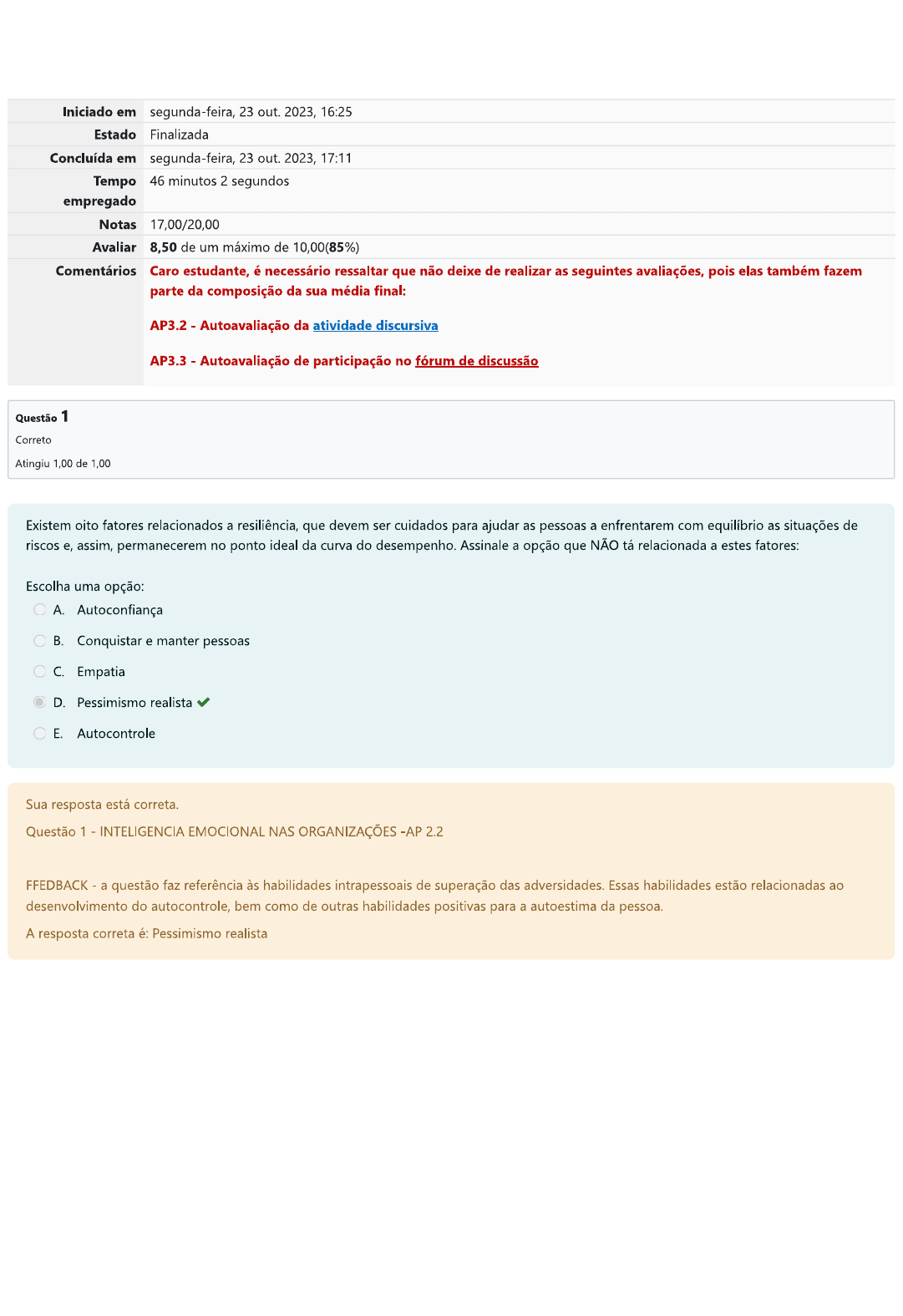 <p>Iniciado em segunda-feira, 23 out. 2023, 11:09</p><p>Estado Finalizada</p><p>Concluída em segunda-feira, 23 out. 2023, 12:05</p><p>Tempo</p><p>empregado</p><p>56 minutos 33 segundos</p><p>Notas 19,00/20,00</p><p>Avaliar 9,50 de um máximo de 10,00(95%)</p><p>Questão 1</p><p>Correto</p><p>Atingiu 1,00 de 1,00</p><p>A passividade, a manipulação e a agressividade são ingredientes típicos de mecanismos de defesa. Nosso processo de mecanismo de defesa é</p><p>composto por:</p><p>Escolha uma opção:</p><p>A. Simpatia + comunicação = aptidões sociais.</p><p>B. Autoconhecimento + motivação = comunicação.</p><p>C. Simpatia + Inteligencia = Motivação.</p><p>D. Creça + Estratégia Comportamental = Resultado. </p><p>E. Medo + Ravia = Tensão.</p><p>Sua resposta está correta.</p><p>Questão 7 - INTELIGENCIA EMOCIONAL NAS ORGANIZAÇÕES -AP 1.1</p><p>FEEDBACK: Exemplo de mecanismo de defesa: não fiz o trabalho (sou incompetente) + porque você não me deu as orientações adequadas</p><p>(coloco a culpa no outro e me livro da responsabilidade) = portanto, sou competente, porque não sou responsável pelo erro.</p><p>A resposta correta é: Creça + Estratégia Comportamental = Resultado.</p><p>Questão 2</p><p>Correto</p><p>Atingiu 1,00 de 1,00</p><p>Questão 3</p><p>Correto</p><p>Atingiu 1,00 de 1,00</p><p>Sobre liderança, assinale a alternativa INCORRETA.</p><p>Escolha uma opção:</p><p>A. A liderança é capaz de promover autonomia e relacionamentos saudáveis.</p><p>B. Liderança é um processo complexo que compreende diversas atividades e competências dos administradores como coordenação,</p><p>direção, motivação e participação.</p><p>C. A capacidade de liderar é importante em todos os tipos de organizações.</p><p>D. Os limites da liderança não definem a área de influência do líder. </p><p>E. Liderança é a realização de metas por meio da direção de colaboradores.</p><p>Sua resposta está correta.</p><p>Questão 7 - INTELIGENCIA EMOCIONAL NAS ORGANIZAÇÕES -AP 2.2</p><p>FEEDBACK - A liderança deve promover a abertura, mesmo que ele posicione os líderes em uma posição de maior vulnerabilidade e esse</p><p>tenha que arcar com consequências de desvios e resultados não tão favoráveis. Para os autores, apenas uma liderança aspiradora é capaz de</p><p>promover autonomia, autoestima e relacionamentos saudáveis em uma organização.</p><p>A resposta correta é: Os limites da liderança não definem a área de influência do líder.</p><p>Assinale a alternativa que não representa uma das principais caracteristica das emoções:</p><p>Escolha uma opção:</p><p>A. Ela nos avisa das intenções do nosso interlocutor por meio da expressão corporal proveniente de sinais fisiológicos próprios da</p><p>emoção.</p><p>B. Quando uma pessoa sorri, você entende a situação como positiva, porém, se a pessoa se expressa com tom de voz alta, você entende</p><p>a situação como negativa.</p><p>C. É algo que permite a mente comprovar a realidade como ela é. </p><p>D. É uma ferramenta importante da comunicação humana.</p><p>E. É uma forma de prevenção, correção e defesa da nossa sobrevivência, pois, conforme o seu próprio significado, a emoção é uma</p><p>energia que nos prepara e nos leva a agir.</p><p>Sua resposta está correta.</p><p>Questão 13 - INTELIGENCIA EMOCIONAL NAS ORGANIZAÇÕES -AP 1.2</p><p>FEEDBACK -A emoção funciona como um controle em nossas relações sociais, porque é por meio dela que avaliamos uma situação e</p><p>regulamos nosso comportamento. Um exemplo: quando sentimos raiva, precisamos processá-la adequadamente para não causar prejuízos a</p><p>nós e aos outros. Assim, o que sentimos funciona como um filtro para lidarmos com os estímulos internos e externos.</p><p>A resposta correta é: É algo que permite a mente comprovar a realidade como ela é.</p><p>Questão 4</p><p>Correto</p><p>Atingiu 1,00 de 1,00</p><p>Questão 5</p><p>Correto</p><p>Atingiu 1,00 de 1,00</p><p>Como o líder não deve usar a inteligência emocional:</p><p>Escolha uma opção:</p><p>A. Se alguma consequência pessoal for aplicável pelas políticas da empresa, o cumprimento das normas pode ser uma parte essencial</p><p>do processo, mas o principal foco de atenção deve ser o que pode ser aprendido para evitar que surjam problemas similares no</p><p>futuro.</p><p>B. A solução de um problema deve levar a uma análise dos fatos ocorridos (olhar para trás) de forma a identificar as causas e modos de</p><p>falha.</p><p>C. A inteligência emocional deve atuar na qualidade dos relacionamentos, no equilíbrio emocional e na capacidade da pessoa ao</p><p>lidar com os conflitos, sempre procurando evitá- los para não decepcionar os outros membros da empresa.</p><p></p><p>D. O líder deve assumir a responsabilidade pessoal pela implementação de soluções de ação, envolvendo níveis superiores em caso de</p><p>garantir a autoridade necessária para implantação das soluções;</p><p>E. O líder deve assumir a responsabilidade pessoal por encontrar e propor soluções em vez de procurar transferir essa responsabilidade</p><p>para superiores ou para subordinados.</p><p>Sua resposta está correta.</p><p>Questão 10 - INTELIGENCIA EMOCIONAL NAS ORGANIZAÇÕES -AP 2.2</p><p>FEEDBACK - capacidade de ajudar os outros e a sua própria inteligência, unidos ajudam a criar uma organização emocionalmente, reduzindo o</p><p>stress, aumentando a sua satisfação, eficiência e competitividade.</p><p>A resposta correta é: A inteligência emocional deve atuar na qualidade dos relacionamentos, no equilíbrio emocional e na capacidade da</p><p>pessoa ao lidar com os conflitos, sempre procurando evitá- los para não decepcionar os outros membros da empresa.</p><p>Assinale a opção que descreve os quatro tipos de estágios de maturidade, que tem influência na liderança situacional nas organizações.</p><p>Escolha uma opção:</p><p>A. Determin