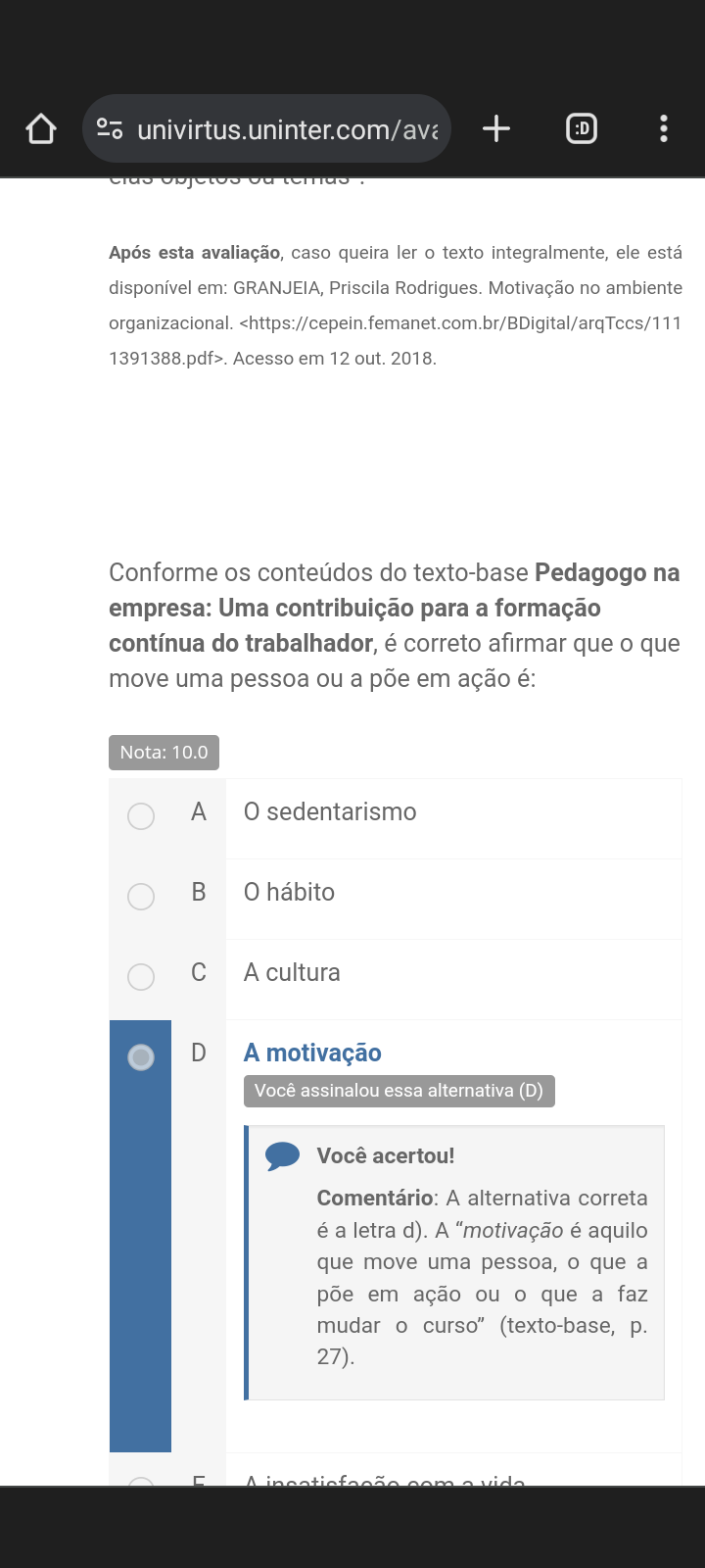 <p>univirtus.uninter.com/ava + :D Após esta avaliação, caso queira ler o texto integralmente, ele está disponível em: GRANJEIA, Priscila Rodrigues. Motivação no ambiente organizacional. <https://cepein.femanet.com.br/BDigital/arqTccs/111 1391388.pdf>. Acesso em 12 out. 2018. Conforme os conteúdos do texto-base Pedagogo na empresa: Uma contribuição para a formação contínua do trabalhador, é correto afirmar que o que move uma pessoa ou a em ação é: Nota: 10.0 A sedentarismo B hábito C A cultura D A motivação Você assinalou essa alternativa (D) Você acertou! Comentário: A alternativa correta é a letra d). A "motivação é aquilo que move uma pessoa, o que a em ação ou o que a faz mudar o curso" (texto-base, p. 27). vida</p>