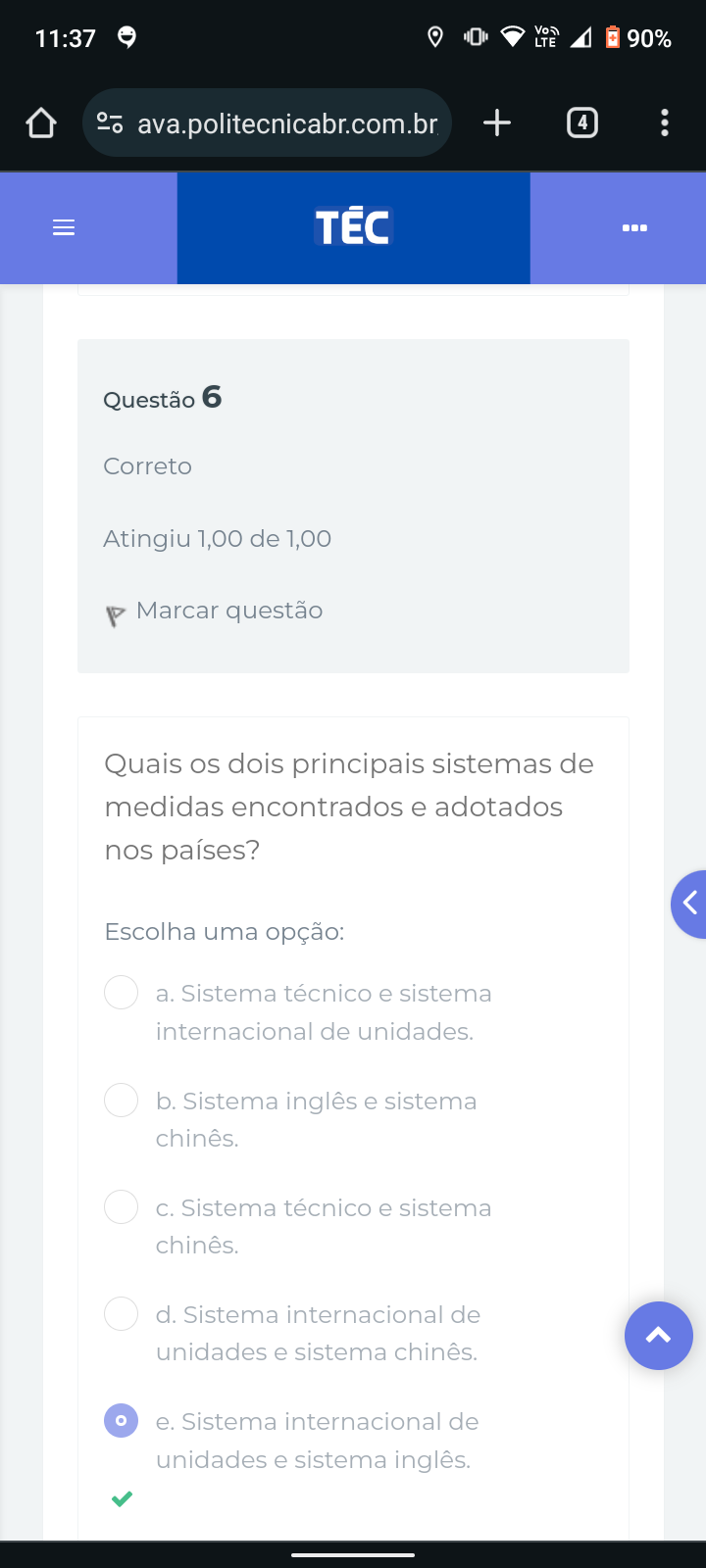 <p>11:37 LTE 90% + 4 ⑉ Questão 6 Correto Atingiu 1,00 de 1,00 Marcar questão Quais os dois principais sistemas de medidas encontrados e adotados nos países? < Escolha uma opção: a. Sistema técnico e sistema internacional de unidades. b. Sistema inglês e sistema chinês. C. Sistema técnico e sistema d. Sistema internacional de unidades e sistema chinês. e. Sistema internacional de unidades e sistema inglês.</p>