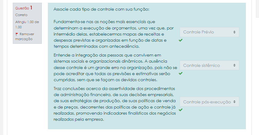 <p>Questão 1 Associe cada tipo de controle com sua função: Correto Atingiu 1,00 de Fundamenta-se nas as noções mais essenciais que 1,00 determinam a execução de orçamentos, uma vez que, por Controle Prévio Remover intermédio delas, estabelecermos mapas de receitas e marcação despesas previstas e organizadas em função de datas e tempos determinados com Entende a integração das pessoas que convivem em sistemas sociais e organizacionais dinâmicos. A ausência Controle sistêmico desse controle é um grande erro na organização, pois não se pode acreditar que todas as previsões e estimativas serão cumpridas, sem que se façam devidos controles. Traz conclusões acerco da assertividade dos procedimentos de administração financeira, de suas decisões de suas estratégias de produção, de suas políticas de venda Controle pós-execução e de preços, decorrentes das políticas de ação e controle já realizadas, promovendo indicadores finalísticos dos negócios realizados pela empresa.</p>
