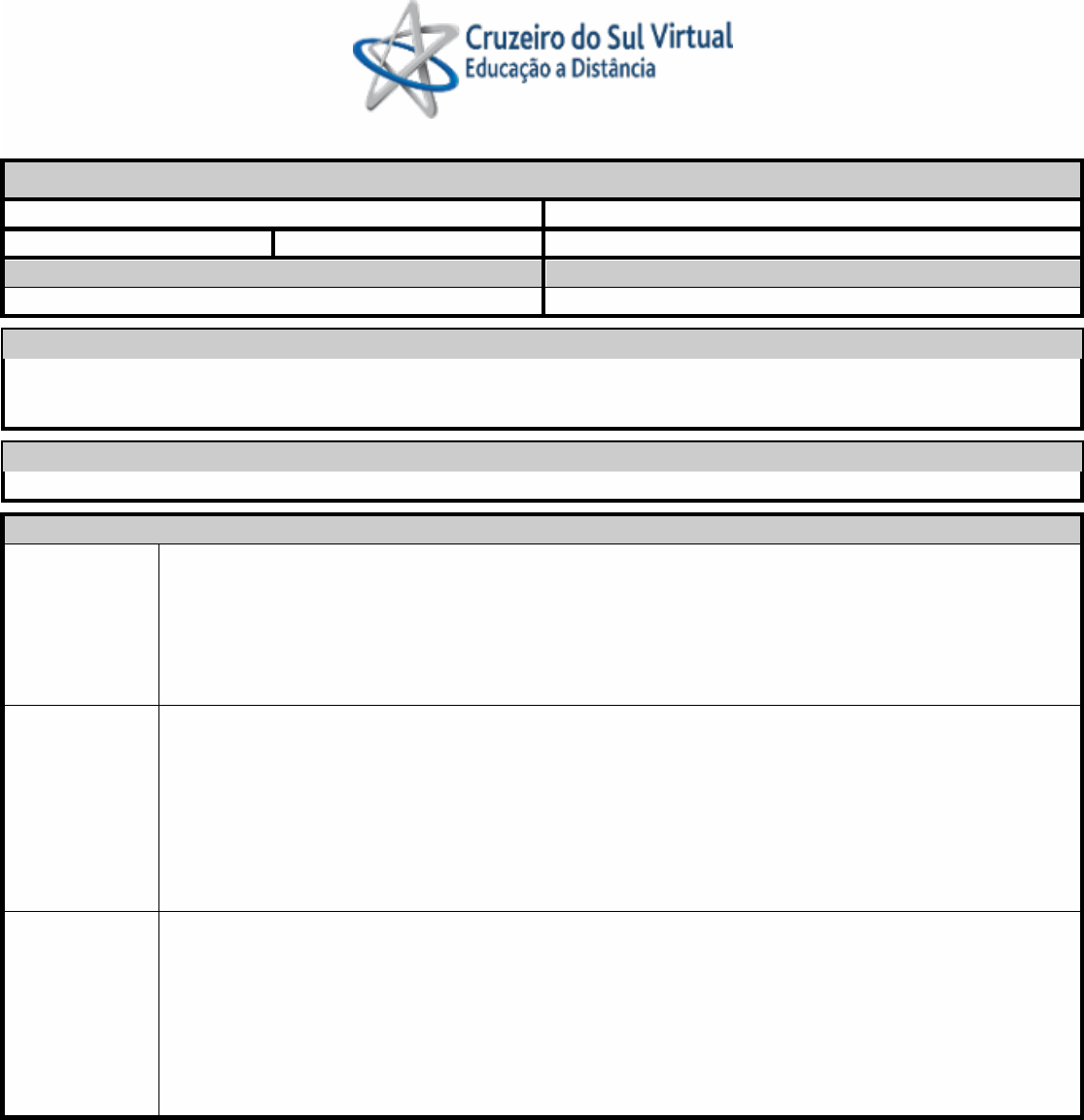 <p>GRADUAÇÃO EAD (UCS/UNC/UNF)</p><p>Não há pré-requisitos.</p><p>REQUISITOS</p><p>Estudo dos procedimentos práticos, teóricos e analíticos do processo de modelagem e fundição, enfatizando as técnicas e</p><p>os conteúdos formais, espaciais, criativos e expressivos de obras artísticas. Fruição, apreciação significativa, leitura e</p><p>crítica.</p><p>EMENTA</p><p>PLANO DE ENSINO - 2024 / 2º SEMESTRE</p><p>Curso: Artes Visuais (Licenciatura) Disciplina: Modelagem e Escultura</p><p>--- Online C/H Semestral: 80</p><p>PROFESSOR RESPONSÁVEL PROFESSOR EXECUTOR</p><p>Alexandre Ferreira da Silva</p><p>OBJETIVOS</p><p>Cognitivos</p><p>a. Conhecer, contextualizar e analisar diferentes tendências estilos e movimentos artísticos e estéticos.</p><p>b. Compreender a análise dos diferentes meios de expressão e linguagens artísticas e reconhecer seus</p><p>elementos fundamentais. c. Conhecer diferentes procedimentos, técnicas e materiais das artes visuais. d.</p><p>Conhecer os diferentes meios de expressão e linguagens artísticas. e) Conhecer aspectos da história do</p><p>ensino de arte e suas diferentes linguagens artísticas e fundamentos; f) Conhecer os procedimentos de</p><p>pesquisas, possibilidades de abordagem e elaboração de projetos.</p><p>Habilidades</p><p>a. Reconhecer a arte como um sistema simbólico relacionado ao contexto e elaborar opiniões referentes</p><p>a produção artística e histórica. b. Apreciar, ler e analisar os fundamentos da produção artística em</p><p>diferentes contextos históricos, sociais e culturais. c. Identificar diferentes procedimentos, técnicas e</p><p>materiais das artes visuais desenvolver, pesquisar e manipular materiais expressivos. d) Apreciar e</p><p>analisar significativamente, ler e criticar manifestações históricas e estéticas de diferentes meios de</p><p>expressão e linguagens artísticas. e) Desenvolver pesquisas a partir da história do ensino da arte e seus</p><p>principais fundamentos. f) Desenvolver pesquisas que envolvam o conhecimento, a reflexão crítica a</p><p>respeito da produção e da criação em arte.</p><p>Atitudes</p><p>a. Valorizar a arte como conhecimento e desenvolver o senso critico na análise de produções artísticas,</p><p>avaliar as diferentes tendências artísticas, escolas e movimentos. b. Ter autonomia e independência de</p><p>análise e posicionamento crítico. c. Valorizar as praticas artísticas e contribuir para a difusão de seu</p><p>ensino, ter senso critico ter a pesquisa pratica como base do ensino. d. Valorizar e reconhecer a arte</p><p>como conhecimento e suas potencialidades em seus diferentes meios e formas de expressão. e. Ter</p><p>autonomia e valorizar a história do ensino da arte. f. Valorizar a pesquisa, a reflexão e o pensar</p><p>constante para a atualização e auto-formarão e ter autonomia e independência de pesquisa,</p><p>interpretação, análise e critica.</p><p>UNID. C/H CONTEÚDO</p><p>I</p><p>16</p><p>HISTÓRIA DA ESCULTURA</p><p>Escultura nas civilizações antigas: Egito, Grécia e Roma. A construção escultórica a serviço da fé. O</p><p>resgate da estética da Antiguidade. A escultura Moderna.</p><p>II</p><p>14</p><p>A LINGUAGEM TRIDIMENSIONAL</p><p>A Tridimensionalidade. Os processos aditivo e subtrativo. Introdução às técnicas de modelagem,</p><p>cinzelamento e fundição. A história da modelagem e da cerâmica. O Fazer artístico. O ateliê, as</p><p>ferramentas e os materiais. Artistas em Destaque.</p><p>III</p><p>14</p><p>A MODELAGEM E A CERÂMICA - ESTUDOS E TÉCNICAS</p><p>A modelagem da argila: a compra e o armazenamento; o trabalho e as técnicas. Artistas em Destaque.</p><p>IV</p><p>12</p><p>A ESCULTURA E O PROCESSO DE ESCULPIR</p><p>A escultura: a retirada de matéria do bloco. Conceitos, materiais, ferramentas e técnicas. Artistas em</p><p>Destaque.</p><p>V</p><p>12</p><p>CONSTRUÇÃO DE MOLDES, FUNDIÇÃO E CÓPIA</p><p>Nomenclaturas e normas. História do processo de fundição. Moldes e fundição. Materiais e técnicas.</p><p>Artistas em Destaque. Aplicações Pedagógicas.</p><p>VI 12</p><p>A ESCULTURA E A EXPANSÃO DO CONCEITO DE ESCULPIR</p><p>A escultura Contemporânea e seu conceito expandido.</p><p>BIBLIOGRAFIA BÁSICA BIBLIOGRAFIA COMPLEMENTAR</p><p>CARNEIRO, Ivane Angélica. Artes visuais: práticas</p><p>tridimensionais. Curitiba: InterSaberes, 2017. (e-book)</p><p>GUINSKI, Rodrigo Stromberg; RODAS, Janina. Poéticas</p><p>híbridas nas artes visuais. Curitiba: InterSaberes, 2021. (e-</p><p>book).</p><p>LOURENÇO, Clediane. Entre cores, formas e labirintos: arte</p><p>tridimensional. InterSaberes, 2017. (e-book)</p><p>KRAUSS, Rosalind. A escultura no campo ampliado. Revista</p><p>G áv e a , P U C - R i o , 1 9 8 4 . D i s p o n í v e l em :</p><p>http://monoskop.org/images/b/bc/Krauss_Rosalind_1979_20</p><p>08_A_escultura_no_campo_ampliado.pdf>. Acesso em:</p><p>01 fev. 2018.</p><p>LIMA, CC. Francisco Brennand: aspectos da construção de</p><p>uma obra em escultura cerâmica. São Paulo: Editora</p><p>UNESP; São Paulo: Cultura Acadêmica, 2009. 200 p.</p><p>disponível em: http://books.scielo.org/id/jvjh7. Acesso em 04</p><p>de março de 2021.</p><p>PEREIRA, Katia Helena. Como usar artes visuais na sala de</p><p>aula. São Paulo: Contexto, (e-book).</p><p>SULZBACH, Ândrea. Artes integradas. Curi tiba:</p><p>Intersaberes, 2017 (ebook).</p><p>VIEIRA, João Guimarães. Amilcar de Castro, escultura</p><p>também é cosa mentale Estudo Avançados, São Paulo, v.10,</p><p>n . 2 6 , 1 9 9 6 . D i s p o n í v e l e m : & l t ;</p><p>http://www.scielo.br/pdf/ea/v10n26/v10n26a28.pdf>.</p><p>Acesso em: 01 fev. 2018.</p><p>Como estratégia de ensino são utilizados: - Materiais digitais produzidos e desenvolvidos para facilitar a aprendizagem</p><p>(videoaula, material teórico de referência, apresentação narrada). - Orientação inicial (síntese, mapas conceituais). -</p><p>Atividades online realizadas por me
