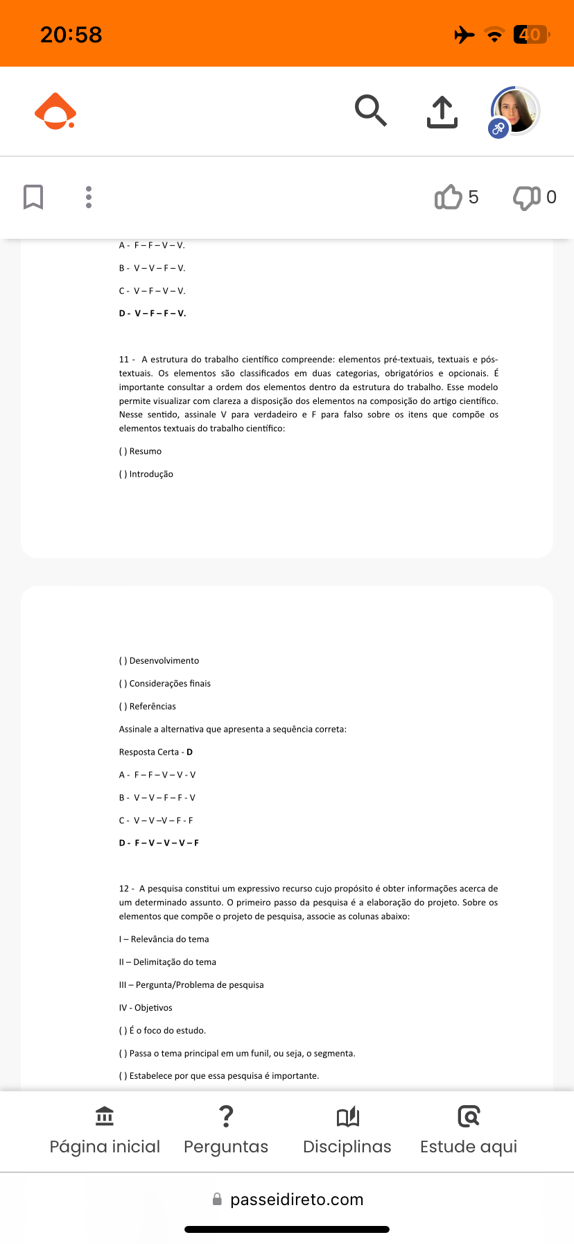 <p>20:58 40 5 0 11 - A estrutura do trabalho compreende: elementos pré-textuais, textuais e pós- textuais. Os elementos são classificados em duas categorias, obrigatórios e opcionais. É importante consultar a ordem dos elementos dentro da estrutura do trabalho. Esse modelo permite visualizar com clareza a disposição dos elementos na composição do artigo Nesse sentido, assinale para verdadeiro e F para falso sobre os itens que compõe os elementos textuais do trabalho cientifico: Resumo Introdução Desenvolvimento () Considerações finais Referências Assinale a alternativa que apresenta a sequência correta: Resposta Certa D A-F-F-V-V-V C-V-V-V-F-F 12 A pesquisa constitui um expressivo recurso cujo propósito é obter informações acerca de um determinado assunto. o primeiro passo da pesquisa é a elaboração do projeto. Sobre os elementos que compõe o projeto de pesquisa, associe as colunas abaixo: I - Relevância do tema II Delimitação do tema III - Pergunta/Problema de pesquisa IV Objetivos É o foco do estudo. Passa tema principal em um funil, ou seja, o Estabelece por que essa pesquisa é importante. ? Q Página inicial Perguntas Disciplinas Estude aqui passeidireto.com</p>