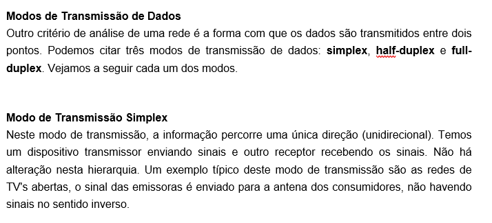 <p>Modos de Transmissão de Dados Outro critério de análise de uma rede é a forma com que os dados são transmitidos entre dois pontos. Podemos citar três modos de transmissão de dados: simplex, half-duplex e full- duplex. Vejamos a seguir cada um dos modos. Modo de Transmissão Simplex Neste modo de transmissão, a informação percorre uma única direção (unidirecional). Temos um dispositivo transmissor enviando sinais e outro receptor recebendo os sinais. Não há alteração nesta hierarquia. Um exemplo típico deste modo de transmissão são as redes de TV's abertas, o sinal das emissoras é enviado para a antena dos consumidores, não havendo sinais no sentido inverso.</p>
