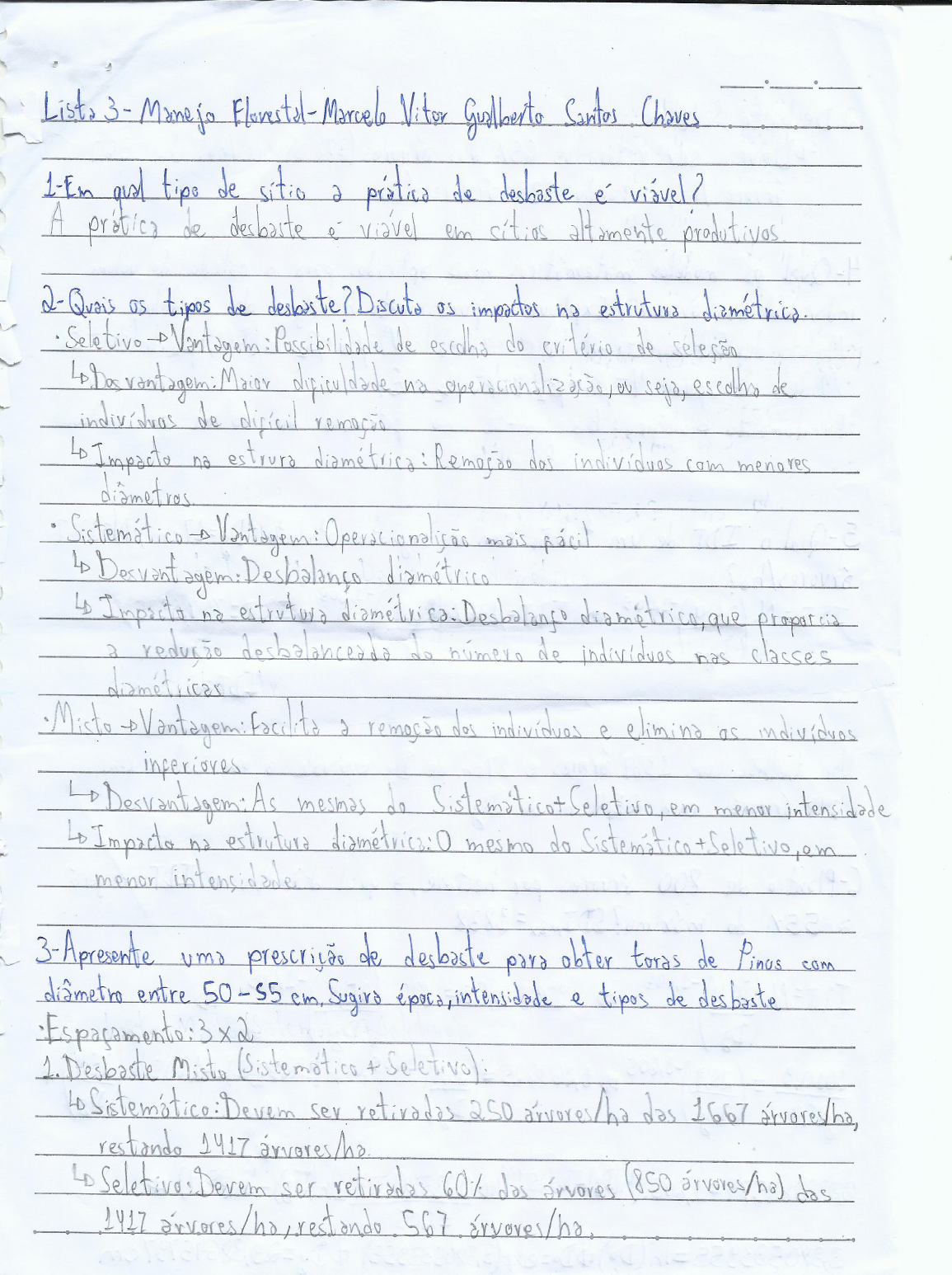 <p>3 - Vitor Santos 1- Em de sitio a de desbaste A de desbaste e viavel em sitios altamente 2- - Quais tipos de Discuts impactos estrutura Seletivo : Possibilidade de escdha do de Maior na de de Impacto na estrura : dos com menores diametros Sistematico mais diamétrico Impacto no que proporcia a desbalanceada do numero de has classes Misto dos individues e elimina as As mesmas do Sistematicot em menor intensidade Impacto estrutura do +Seletivo em menor intensidade Apresente umo de desbaste para obter toras de Pinus com diametro entre 50-55 Sugiro intensidade e tipos de Espagamento x2 1. Desbaste Misto Sistematico: Devem Sev retirados 250 das 1667 restando 1417 Devem ser retiradas 60% (850 arvores/ha) das 1417 restando 567</p><p>2. Devem ser 65% das (378 das 567 arvores /ha, restando 199 4-Qual as modelos mais aplicados para calculo do volume individual Explique dos Modelo de Schumacher (linearizado) In Modelo de + Ei Fundamento Baseiam-se nd formula do volume do cilindro. 5-Qurl IDT de com as seguintes atributos: N=1367 IDT= N. = 17 IDT=717,597502 IDT=718 Um com 1367 e 17cm de Dg equivale a um com 718 25,4cm de Dg de 800 arvores por a qual diametro IDT chegar 55% do maximo? 1838 IDT=N. Dg 25,4 2020,9 800 - Dg 1,263625 # Dg 1,605</p><p>7- anterior, considere desbaste a do atingir Dg do IDT a arvores remover para chegar a 35% do -1,605 1,605 25,4 Dg N= 643,3 FD 509,0909095 510 individuos em 35% do IDT 1,263624999 de 800-520 = 290 Deve-se remover 290 individuos para chegar a 35% do 8- de regimes de e quais as que as definem? Pulp Wood/Energy Utility Menor densidade, Desrama. Intensivo: espacamento densidade, Desbastes Programas de desrama Sistemas variado de acordo com objetivo (Culturas anuris e Sistemas e Arvores de Sistemas 9 Quris as do das de desbaste e desrama? de de maior de fustes mais uniformes da entre 10-Com base has dados a 3 do pels de Markov para 0 ano de 2027?</p><p>DAP 2018 DAP2022 7,8 7,9 8,4 10,1 9,5 11,5 - 6,8 13,5 14,5 14,5 15,8 12,8 17 7,4 8,9 G.Yo+I CLS2022 Montar motriz de G 7,5 7,5 T2018 7,5 12,5 7,5 12,5 17,5 Ingresso 7,5 12,5 7,5 2 0 0 1 - 12,5 2 2 22,5 12,5 17,5 0 1 0 12,5 17,5 Morte 0 1 22,5 12,5 S 17,5 G = 2/4 De 2018 ate 2027: 7,5 7,5 2/4 2 1/3 = a = 2/4 4 3/2 2/4 3 + Lo 1 V3 0 V3</p><p>11- limitacio do Cadeia de Markov. A de dos has classes depende do estado do floresta e dos eventos que estado atual, sendo umo matriz estacionaria 12-0 que e um sistema silvicultural e qual tres elementos que definem Sistema Sistema e tratado, substituido Corte seletive Regeneragoo: Natural; Artificial Trotamento Corte de 13- Explique e mostre que E floresta no qual de arvores has classes de tamanho decrescem geometrica denominoda 9 (Quociente de Liocurt) Floresta - Grafico N 920 1,4297 CLS65 648 = 648 1,9756 CLS75 328 55 CLS Floresta balanceada N 800 9CLSSS = 800 2 400 CLS65 400 400 2 CLS75 200</p><p>14 Explique que e 0 metado E um sistemo silvicultural corte seletivo de baseado em: Diametro mínimo de corte B: Area basal (G) Quociente de Liocurt 15- Cite e descress et elementares de um de manejo - do Manejo Elaborador, dr Tipo de da Titulo de do Florestal Justificativas e socio do (Meio Meio florestal e cubagem do metodo de amostragem, de parcelas, intensidade mensuradas; do processo de amostragem; Analise Relatorios de 7-Manejo Florestal de total; Silvicultural e niveis de de j dos Provaveis e has parcelos silviculturais; 10° de documentos - Quais as principios do florestal sustentsvel? Conservação dos recursos naturais do biodiversidade do floresta e suas fungoes do Quais sistemas silviculturais mais manejo do Cerrado e do do sistema em alternadas: Deixa-se vma de 100m de largura e retira-se a Sistema de talhodia composta</p><p>Sistema em frixas alternadas 18- Quris sistemas indicados pold no Intensidade (Ate (Corte Pleno (Ate e de 25 posse dos dados de UT de 125 responds 00 1 27 00 8 00 3</p><p>Simule em + 5% e Plano 50% de do com do de 9 de Informatoes importantes: a) a Complete 1, 6129 tabela i% 2 de valor inicial= S% i 459 de G</p><p>Modelo de Meyer Passo ajuste pelo Metado DD B1= In Gemanescente Both + Passo - Utilizar modelo Meyer e estimar frequencis DBQ CLS FOBS FEREMANESCENTE Modelo de Meyer Ss 324 242,03 = In 65 267 242,92 75 231 84,39 85 92 49,83 95 68 105 38 17,38 115 24 10,26 125 29 6,06 235 7 3,58 - Calcular as individues removidos CLS FOBS FEREMOVIDO = 55 242,03 81,97 324-242,03 65 267 142,92</p><p>231 84,39 146,61 85 92 49,83 42,27 95 68 29,43 38,57 105 38 27,38 20,62 115 24 10,26 13,74 125 19 6,06 12,94 235 7 3,58 3,42 Passo 4 Calcular Basal Remonescente e Removids CLS FEREMANESCENTE FEREMOVIDO GOBS GREMANESCENTE GREMOVIDO 242,03 81,97 76,97687 57,50 19,47 65 142,92 88,5988 41,17 75 84,39 146,61 102,0527 37,28 64,77 85 49,83 42,17 52,20542 28,28 23,93 95 38,57 20,86 27,34 105 17,38 20,62 32,90426 15,05 17,86 115 20,26 13,74 24,92854 10,66 14,27 125 6,06 12,94 23,31651 15,88 135 3,58 3,42 5,12 4,90 GREMANESCENTE = 242,03 FD 57,50 40000 40000 = Passo 5 - Calcular Volume Remanescente e Removido CLS FEREMANESCENTE FEREMOVIDO VOBS VREMANESCENTE VREMOVIDO SS 242,03 82,97 987,455905 737,64 249,82 65 242,92 124,08 1135,98004 608,05 527,93 84,39 478,19 830,74</p><p>85 49,83 675,99884 366,26 . 309,84 95 29,43 38,57 635,840562 275,14 360,70 17,38 20,62 196,37 233,09 115 10,26 13,74 335,063123 143,24 191,82 6,06 12,94 100,80 215,31 135 3,58 3,42 126,905002 64,86 62,05 Tabela 2- Dados Volume do Fuste/arv +0,638055. 2 CLS VF/arv HF 55 3,0477 13,9 65 4,2546 14,13 75 5,6663 L4,28 V=3,0477m3/arv 85 7,3478 14,53 cente = 3,0477.242,03 95 9,3505 14,9 = 14,77 LLS 13,9609 15,29 125 16,6373 135 18,1292 24,37 b) Quantos de Anacardium ex Engl passiveis de no classe de 65 cm Explique Passo 1- densidade 200 ha para a 3 - 100hr = Como densidadade 100 ha do especie menor que e proibido pels brasileira a de individuos da especie nessa c) Quantos individuos de Vahl 530 de na classe de - densidade em 100 ha para a espécie 135 125 ho = ha 100 hs</p><p>Passo 2 - (Mogno, = Mogno Passo 3