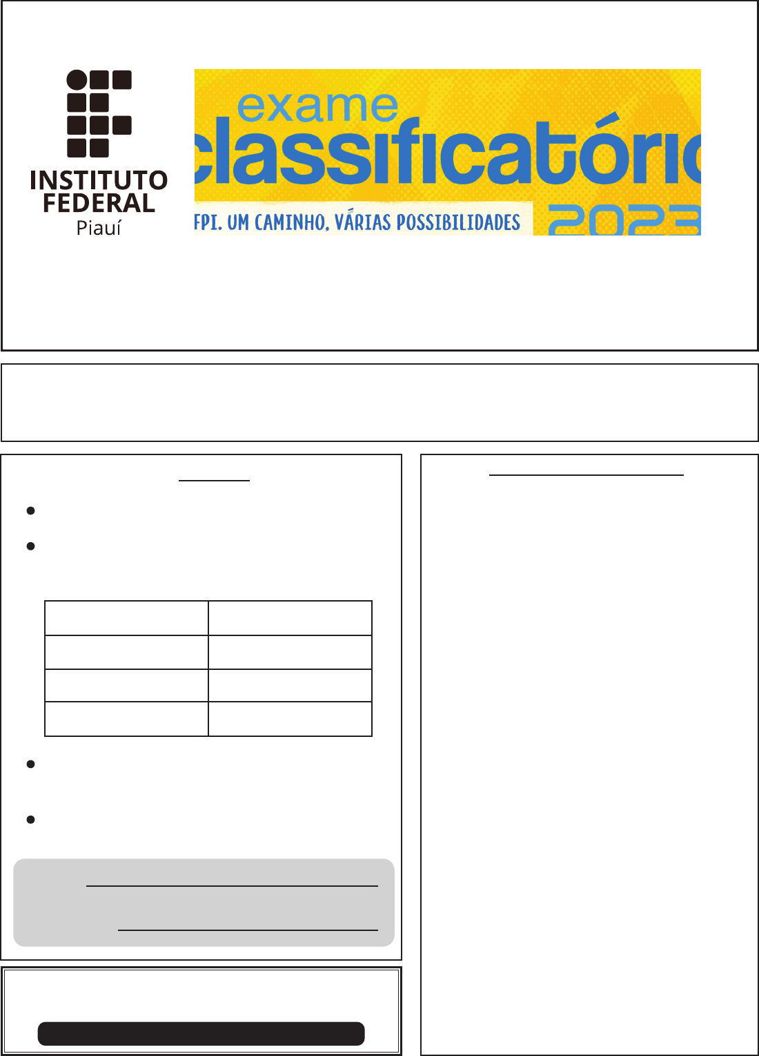 <p>CADERNO DE QUESTÕES</p><p>ENSINO TÉCNICO INTEGRADO AO ENSINO MÉDIO</p><p>LEIA AS INSTRUÇÕES ABAIXO</p><p>• Após identificado e instalado na sala, você não</p><p>poderá consultar qualquer material, enquanto</p><p>aguarda o horário de início da prova.</p><p>• Siga, atentamente, a forma correta de</p><p>preenchimento do Cartão de Repostas, conforme</p><p>estabelecido no mesmo.</p><p>• Não haverá substituição do Cartão de Respostas</p><p>por erro do candidato.</p><p>• Ao terminar a prova, é de sua responsabilidade</p><p>entregar ao fiscal o Cartão de Respostas</p><p>assinado. Não se esqueça dos seus pertences.</p><p>• Os três últimos candidatos deverão permanecer</p><p>na sala até que o último candidato entregue o</p><p>Cartão de Respostas.</p><p>• O fiscal de sala não está autorizado a alterar</p><p>nenhuma dessas instruções. Em caso de dúvida,</p><p>solicite a presença do coordenador local.</p><p>Por motivo de segurança:</p><p>• O candidato só poderá retirar-se definitivamente</p><p>da sala após 1 (uma) hora do início efetivo da</p><p>prova;</p><p>• Somente faltando 1 (uma) hora para o término</p><p>da prova, o candidato poderá retirar-se levando o</p><p>seu Caderno de Questões;</p><p>• O candidato que optar por retirar-se sem levar</p><p>o seu Caderno de Questões, não poderá</p><p>copiar suas respostas por qualquer meio. O</p><p>descumprimento dessa determinação será</p><p>registrado em ata e acarretará a eliminação do</p><p>candidato;</p><p>• Ao terminar a prova, o candidato deverá retirar-</p><p>se imediatamente do local, não sendo possível</p><p>nem mesmo a utilização dos banheiros e/ou</p><p>bebedouros.</p><p>ATENÇÃO</p><p>DURAÇÃO DA PROVA: 4 HORAS</p><p>PROVA DE MÚLTIPLA ESCOLHA, CADA UMA COM 5</p><p>(CINCO) ALTERNATIVAS DE RESPOSTA - A, B, C, D e E -</p><p>CONFORME DISPOSIÇÃO ABAIXO</p><p>VERIFIQUE SE ESTE MATERIAL ESTÁ EM ORDEM, CASO</p><p>CONTRÁRIO, NOTIFIQUE IMEDIATAMENTE O FISCAL</p><p>RESERVE OS 30 (TRINTA) MINUTOS FINAIS PARA</p><p>MARCAR SEU CARTÃO DE RESPOSTAS.</p><p>Disciplinas Quantidade de questões</p><p>Língua Portuguesa 30</p><p>Matemática 30</p><p>Total 60</p><p>BOA PROVA!</p><p>www.ifpi.edu.br</p><p>Nome:</p><p>Inscrição:</p><p>EDITAL 32/2022 - PROEN/REI/IFPI, de 12 de setembro de 2022.</p><p>02</p><p>PORTUGUÊS</p><p>Leia o texto seguinte, de Luís Fernando Veríssimo,</p><p>para responder às questões de 1 a 5.</p><p>O Homem Trocado</p><p>O homem acorda da anestesia e olha em volta. Ainda</p><p>está na sala de recuperação. Há uma enfermeira</p><p>do seu lado. Ele pergunta se foi tudo bem.</p><p>– Tudo perfeito – diz a enfermeira, sorrindo.</p><p>– Eu estava com medo desta operação...</p><p>– Por quê? Não havia risco nenhum.</p><p>– Comigo, sempre há risco. Minha vida tem sido</p><p>uma série de enganos... E conta que os enganos</p><p>começaram com seu nascimento.</p><p>Houve uma troca de bebês no berçário e ele foi</p><p>criado até os dez anos por um casal de orientais,</p><p>que nunca entenderam o fato de terem um filho</p><p>claro com olhos redondos. Descoberto o erro, ele</p><p>fora viver com seus verdadeiros pais. Ou com sua</p><p>verdadeira mãe, pois o pai abandonara a mulher</p><p>depois que esta não soubera explicar o nascimento</p><p>de um bebê chinês.</p><p>– E o meu nome? Outro engano.</p><p>– Seu nome não é Lírio?</p><p>– Era para ser Lauro. Se enganaram no cartório e...</p><p>Os enganos se sucediam.</p><p>Na escola, vivia recebendo castigo pelo que não</p><p>fazia. Fizera o vestibular com sucesso, mas não</p><p>conseguira entrar na universidade. O computador</p><p>se enganara, seu nome não apareceu na lista.</p><p>– Há anos que a minha conta do telefone vem com</p><p>cifras incríveis. No mês passado tive que pagar</p><p>mais de R$ 3 mil.</p><p>– O senhor não faz chamadas interurbanas?</p><p>– Eu não tenho telefone!</p><p>Conhecera sua mulher por engano. Ela o confundira</p><p>com outro. Não foram felizes.</p><p>– Por quê?</p><p>– Ela me enganava.</p><p>Fora preso por engano. Várias vezes. Recebia</p><p>intimações para pagar dívidas que não fazia. Até</p><p>tivera uma breve, louca alegria, quando ouvira o</p><p>médico dizer: - O senhor está desenganado. Mas</p><p>também fora um engano do médico. Não era tão</p><p>grave assim. Uma simples apendicite.</p><p>– Se você diz que a operação foi bem...</p><p>A enfermeira parou de sorrir.</p><p>– Apendicite? - perguntou, hesitante.</p><p>– É. A operação era para tirar o apêndice.</p><p>– Não era para trocar de sexo?</p><p>Fonte: https://www.culturagenial.com/cronicas-engracadas-de-</p><p>-luis-fernando-verissimo-comentadas/</p><p>1. Considerando o título do texto e a história</p><p>de vida do protagonista, é válido afirmar que o</p><p>desfecho</p><p>a) destoa da expectativa gerada pelo título.</p><p>b) reforça a expectativa gerada pelo título.</p><p>c) é incoerente com o título.</p><p>d) confirma o diagnóstico do médico.</p><p>e) rompe com a série de enganos vivenciados</p><p>pelo protagonista.</p><p>2. Esse texto caracteriza-se por abordar fatos</p><p>cotidianos, em uma narrativa curta, com poucos</p><p>personagens, utilizando linguagem simples e com</p><p>toque de humor e ironia. Indique a alternativa cujo</p><p>gênero textual corresponde a essa descrição.</p><p>a) Romance</p><p>b) Auto</p><p>c) Epopeia</p><p>d) Soneto</p><p>e) Crônica</p><p>3. A palavra “hesitante”, no contexto do texto,</p><p>pode ser substituída sem comprometer o sentido</p><p>pretendido por</p><p>a) vacilante</p><p>b) resoluta</p><p>c) categórica</p><p>d) convicta</p><p>e) confiante</p><p>03</p><p>4. A oração “[...] mas não conseguira entrar na</p><p>universidade [...]”, grifada no texto, classifica-se</p><p>como:</p><p>a) Subordinada adverbial causal</p><p>b) Subordinada substantiva objetiva direta</p><p>c) Coordenada sindética expli