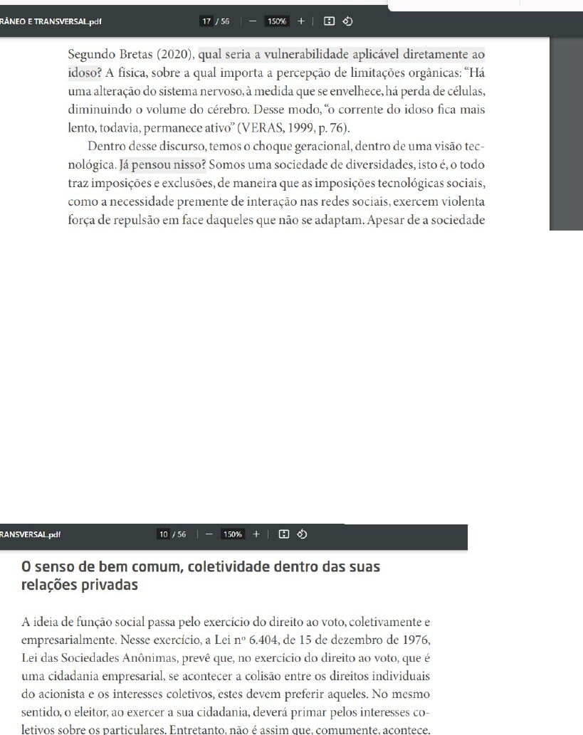 <p>ESTUDO CONTEMPORÂNEO E TRANSVERSAL: AUTONOMIA INTELECTUAL, RELAÇÃO DE CONSUMO E SUSTENTABILIDADE</p><p>QUESTÃO 1</p><p>O envelhecimento populacional brasileiro traz a necessidade de repensar a inclusão social dos idosos. Apesar dos avanços legais, ainda persistem vulnerabilidades e desafios. Uma das principais vulnerabilidades é a condição física dos idosos, com limitações motoras, sensoriais e cognitivas que impactam sua autonomia. Isso requer atenção especial para garantir acesso a serviços de saúde e assistência adequados. Além disso, o texto destaca o choque geracional devido ao avanço tecnológico, que pode gerar exclusão digital e tecnofobia entre os idosos. Nesse sentido, políticas públicas de letramento digital são primordiais para integrar essa população aos novos padrões de sociabilidade.</p><p>Segundo o texto, qual seria a principal vulnerabilidade aplicável diretamente ao idoso?</p><p>Alternativa 4: A vulnerabilidade física, sobre a qual importa a percepção de limitações orgânicas.</p><p>QUESTÃO 2</p><p>Sabemos da importância da democracia como sistema fundamental para a manutenção do todo social. Nesse sentido, afirma-se que a cidadania e a participação ativa dos cidadãos no exercício do direito ao voto, seja no âmbito empresarial ou político, devem ser pautadas pela prevalência dos interesses coletivos sobre os individuais. Isso porque a soberania popular, manifestada nas urnas, é o principal mecanismo de equilíbrio e preservação do bem comum na realidade constitucionalista brasileira.</p><p>Segundo o texto, qual é a principal característica da cidadania e participação dos cidadãos perante o todo na realidade constitucionalista brasileira?</p><p>Alternativa 4: A primazia dos interesses coletivos sobre os individuais no exercício do direito ao voto.</p><p>QUESTÃO 3</p><p>Sabemos da importância da historicidade dos direitos fundamentais, especialmente no âmbito da igualdade racial. Afirma que os direitos fundamentais são conquistas históricas que devem ser protegidas, sob pena de retrocesso. Destaca que a questão é complexa, pois a cidadania e o altruísmo são alcançados através do reconhecimento das singularidades e de fatores históricos, havendo uma base forte de equidade.</p><p>Sobre a principal característica da historicidade dos direitos fundamentais, analise as seguintes afirmativas:</p><p>I) Os direitos fundamentais são conquistas históricas que devem ser protegidas, sob pena de retrocesso.</p><p>II) Os direitos fundamentais são flexíveis e adaptáveis a cada momento histórico.</p><p>III) A historicidade dos direitos fundamentais está relacionada apenas com o processo de colonização.</p><p>Alternativa 1: I, apenas.</p><p>QUESTÃO 4</p><p>A cidadania é um direito de participação popular, com larga convergência aos parâmetros da democracia. Além disso, é um sentimento de pertencimento, com inevitáveis renúncias, não comprometedoras da individualidade, tendo em vista a salubridade do todo social. Portanto, a relação entre o todo (a sociedade/comunidade) e as partes (os indivíduos) é crucial para a efetivação da cidadania e da democracia.</p><p>Conforme o texto apresentado, qual a importância da relação entre o todo e as partes para a efetivação da cidadania e da democracia?</p><p>Alternativa 5: A relação entre o todo e as partes é fundamental, pois a cidadania é um direito de participação popular amparado pelos princípios democráticos, exigindo equilíbrio entre as necessidades individuais e coletivas.</p><p>QUESTÃO 5</p><p>Na Administração Pública, o princípio da supremacia dos interesses públicos sobre os interesses privados é básico e tem caráter imperativo, como ocorre nas desapropriações. Ou seja, mesmo que o cidadão tenha adquirido um imóvel para sua moradia, se o Estado entender que esse imóvel é necessário para a utilidade pública, os interesses coletivos prevalecerão sobre os interesses privados.</p><p>Considerando o texto apresentado, qual é a relação entre os interesses públicos e os interesses privados na Administração Pública?</p><p>Alternativa 5: Os interesses públicos têm caráter imperativo sobre os interesses privados, podendo gerar, inclusive, desapropriações.</p><p>QUESTÃO 6</p><p>Devemos pensar em uma cidadania forçosa ou voluntária? Igualmente complexa a questão, o que nos exige também pensar na cultura normativista e imperativa da ciência do Direito e dos aparatos estatais.</p><p>Com base no texto apresentado sobre a força coercitiva do todo e as limitações e finitudes existenciais das partes, assinale a alternativa que melhor expressa a relação entre o todo e as partes.</p><p>Alternativa 5: Há uma relação de complementariedade e interdependência entre o todo e as partes, de modo que a solidez do todo depende da solidez das partes e vice-versa.</p><p>QUESTÃO 7</p><p>A Constituição Federal estabelece que é obrigação da família, comunidade, sociedade e Poder Público assegurar aos idosos a efetivação de diversos direitos, como à vida, saúde, educação, cidadania e dignidade. Além disso, o Estatuto da Pessoa com Deficiência visa o acolhimento e reconhecimento de pessoas com deficiências físicas ou psíquicas, inclusive no âmbito do casamento, reforçando a premissa da cidadania.</p><p>Conforme o texto, qual a principal vulnerabilidade do idoso desprovi de conhecimentos tecnológicos?</p><p>Alternativa 4: A vulnerabilidade tecnológica, por dificuldade de lidar com inovações.</p><p>QUESTÃO 8</p><p>O desenvolvimento de um "sólido diálogo entre o Direito e outras ciências transcendentes" é emergente, reconhecendo a limitação do Direito em lidar sozinho com as questões emocionais. Assim, a principal dificuldade do Direito parece estar na falta de integração com outras áreas do conhecimento.</p><p>No contexto do principal desafio do Direito em relação aos problemas emocionais, an