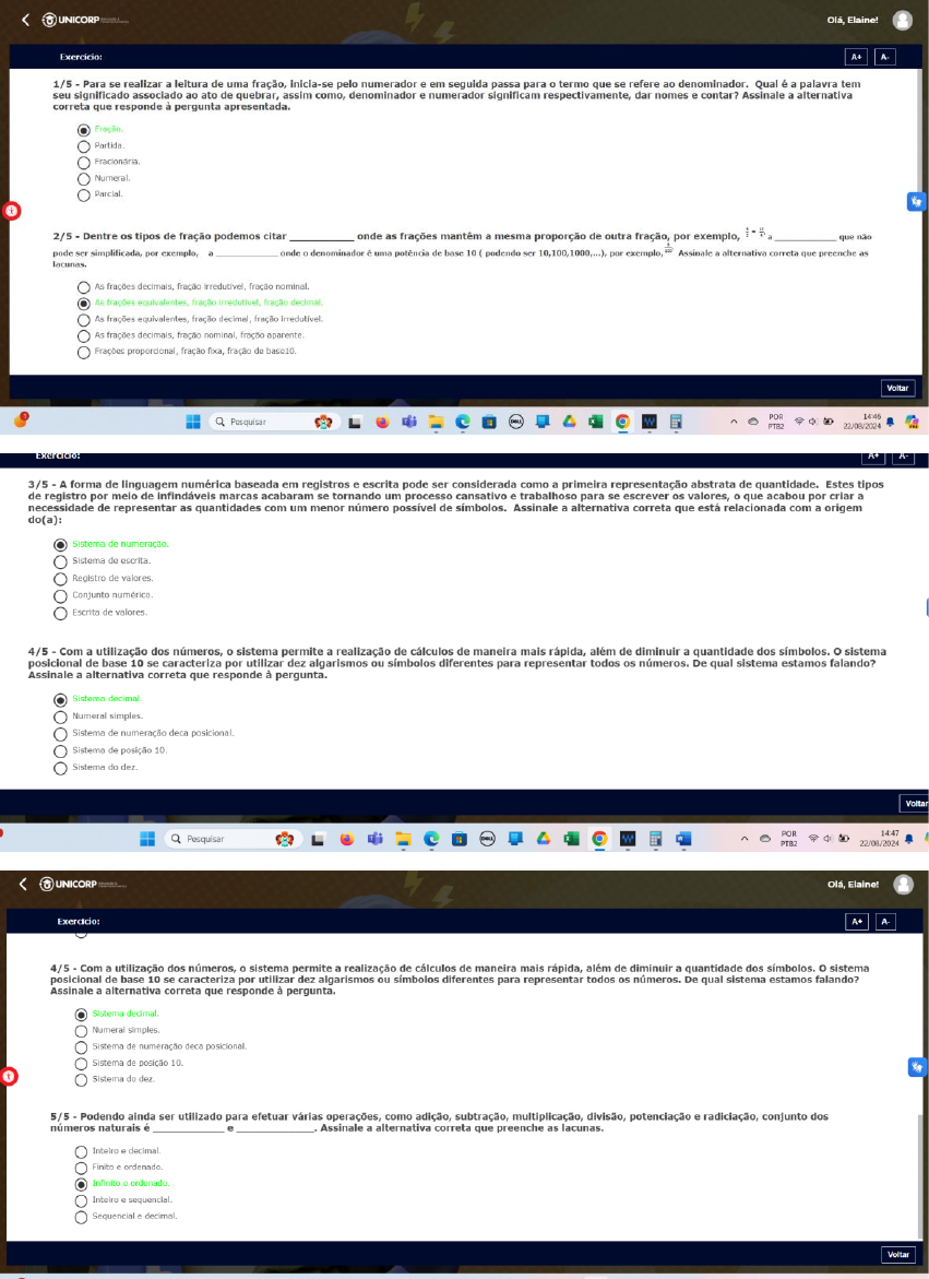 <p>UNICORP Elaine! Exercício: A+ 1/5 Para se realizar a leitura de uma fração, inicia-se pelo numerador e em seguida passa para termo que se refere ao denominador. Qual é a palavra tem seu significado associado ao ato de quebrar, assim como, denominador e numerador significam respectivamente, dar nomes e contar? Assinale a alternativa correta que responde à pergunta apresentada. 2/5 Dentre os tipos de fração podemos citar onde as frações mantêm a mesma proporção de outra fração, por exemplo, que não pode ser simplificada, por exemplo, a onde o denominador uma potência de base 10 podendo ser por exemplo, Assinale a alternativa correta que preenche as As frações decimais, fração fração As frações fração fração As frações equivalentes, fração fração As frações fração fração aparente. Frações fração fixa, fração de POR 14:46 Pesquisar di PTB2 22/08/2024 3/5 A forma de linguagem numérica baseada em registros e escrita pode ser considerada como a primeira representação abstrata de quantidade. Estes tipos de registro por meio de infindáveis marcas acabaram se tornando um processo cansativo e trabalhoso para se escrever os valores, que acabou por a necessidade de representar as quantidades com um menor número possível de Assinale a alternativa correta que está relacionada com a origem do(a): Sistema de Sistema de escrita. Registro de Conjunto Escrita de 4/5 Com a utilização dos numeros, o sistema permite a realização de cálculos de maneira mais rápida, além de diminuir a quantidade dos sistema posicional de base 10 se caracteriza por utilizar dez algarismos ou símbolos diferentes para representar todos os De qual sistema estamos falando? Assinale a alternativa correta que responde à pergunta. Sistema decimal Numeral simples. Sistema de numeração deca Sistema de posição 10. Sistema do POR 14:47 Q Pesquisar e to 22/08/2024 < UNICORP Olá, Elaine! Exercício: A+ A 4/5 Com a utilização dos numeros, sistema permite a realização de cálculos de maneira mais rápida, além de diminuir a quantidade dos sistema posicional de base 10 se caracteriza por utilizar dez algarismos ou diferentes para representar todos os De qual sistema estamos falando? Assinale a alternativa correta que responde à pergunta. Sistema Numeral Sistema de numeração deca Sistema de posição 10. Sistema do dez. 5/5 Podendo ainda ser utilizado para efetuar várias operações, como adição, subtração, multiplicação, divisão, potenciação e radiciação, conjunto dos numeros naturais é e Assinale a alternativa correta que preenche as lacunas. Inteiro decimal Finito Infinito Inteiro Sequencial decimal</p>