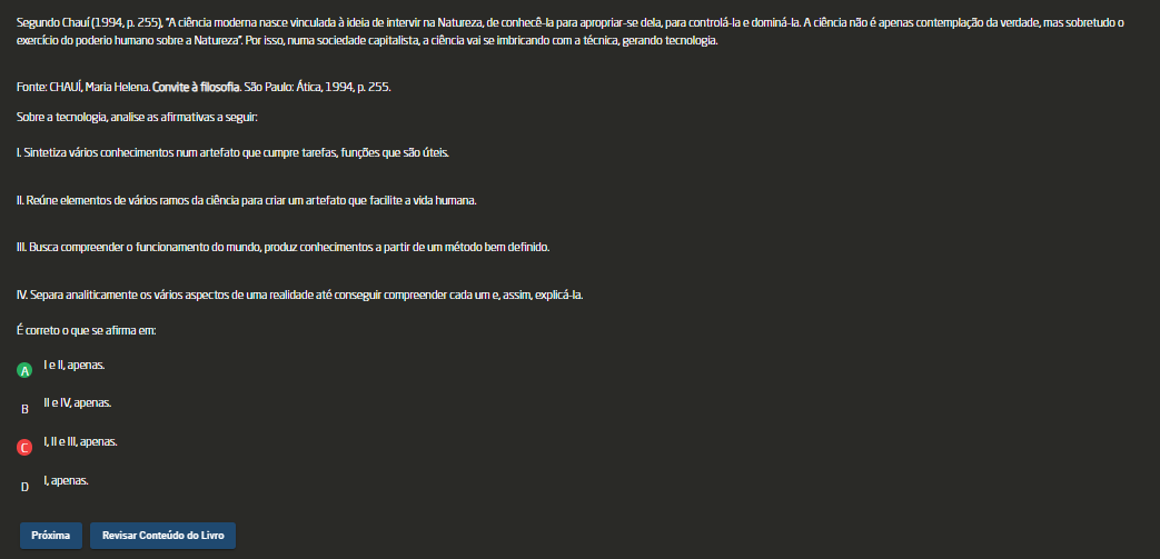 <p>Segundo "A ciência moderna vinculada à ideia de intervir na Natureza, de conhecê-la para apropriar -se dela para la e dominá-la A ciência não é apenas contemplação da verdade, mas sobretudo exercício do poderio humano sobre a Por isso, numa sociedade capitalista, a ciência vai se imbricando com a técnica, gerando tecnologia Fonte: Maria Helena Convite à filosofia São Ática, 1994, p. 255 Sobre a tecnologia, analise as afirmativas a seguir: Sintetiza vários conhecimentos num artefato que cumpre tarefas, funções que são IL Reune elementos de vários ramos da para criar um artefato que facilite a vida humana III. Busca compreender funcionamento do mundo, produz conhecimentos a partir de um método bem definido. IV. Separa analiticamente vários aspectos de uma realidade até conseguir compreender cada um e assim, la É correto que se em le II apenas III. apenas D I. apenas Próxima Revisar Conteudo do Livro</p>