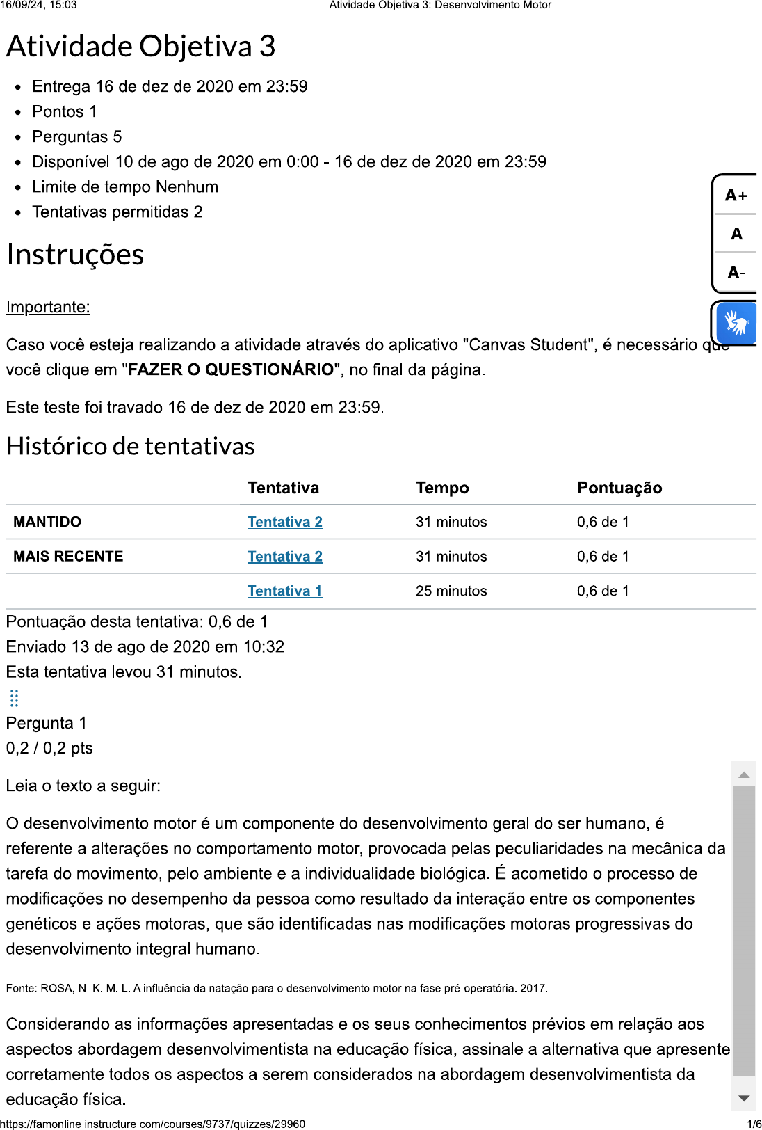<p>16/09/24, 15:03 Atividade Objetiva 3: Desenvolvimento Motor Atividade Objetiva 3 Entrega 16 de dez de 2020 em 23:59 Pontos 1 Perguntas 5 Disponível 10 de ago de 2020 em 0:00 16 de dez de 2020 em 23:59 Limite de tempo Nenhum A+ Tentativas permitidas 2 A Instruções A- Importante: Caso você esteja realizando a atividade através do aplicativo "Canvas Student", é necessário que você clique em "FAZER o QUESTIONÁRIO", no final da página. Este teste foi travado 16 de dez de 2020 em 23:59. Histórico de tentativas Tentativa Tempo Pontuação MANTIDO Tentativa 2 31 minutos 0,6 de 1 MAIS RECENTE Tentativa 2 31 minutos 0,6 de 1 Tentativa 1 25 minutos 0,6 de 1 Pontuação desta tentativa: 0,6 de 1 Enviado 13 de ago de 2020 em 10:32 Esta tentativa levou 31 minutos. Pergunta 1 0,2 / 0,2 pts Leia o texto a seguir: O desenvolvimento motor é um componente do desenvolvimento geral do ser humano, é referente a alterações no comportamento motor, provocada pelas peculiaridades na mecânica da tarefa do movimento, pelo ambiente e a individualidade biológica. É acometido o processo de modificações no desempenho da pessoa como resultado da interação entre os componentes genéticos e ações motoras, que são identificadas nas modificações motoras progressivas do desenvolvimento integral humano. Fonte: ROSA, N. K. M. L. A influência da natação para o desenvolvimento motor na fase pré-operatória. 2017. Considerando as informações apresentadas e os seus conhecimentos prévios em relação aos aspectos abordagem desenvolvimentista na educação física, assinale a alternativa que apresente corretamente todos os aspectos a serem considerados na abordagem desenvolvimentista da educação física. https://famonline.instructure.com/courses/9737/quizzes/29960 1/6</p><p>16/09/24, 15:03 Atividade Objetiva 3: Desenvolvimento Motor Correto! Processo das modificações motoras, nas características de individualidade biológica, no ambiente e na tarefa propriamente dita. A alternativa correta, pois é a única que contempla corretamente todos os aspectos abordagem desenvolvimentista Na abordagem desenvolvimentista são considerados os aspectos do desenvolvimento humano A+ processo das modificações motoras, nas características de individualidade biológica, no ambier A na tarefa propriamente dita. A- Processo das modificações motoras, nas características de individualidade biológica, na capacidade adaptat na tarefa propriamente dita. Processo das modificações motoras, nas características de individualidade biológica, no ambiente. Processo das modificações motoras, nas características de individualidade biológica, na capacidade adaptativa, no ambiente e na tarefa propriamente dita. Processo das modificações motoras, nas características de individualidade biológica e na tarefa propriamente dita. Pergunta 2 0 / 0,2 pts Leia a situação hipotética abaixo: Um professor te convidou para uma atividade extracurricular, nessa atividade, será elaborada uma intervenção para idosos baseada nas teorias de desenvolvimento humano. Considerando esta situação, verifique as afirmações abaixo sobre as possíveis teorias abordadas para essa atividade: I. Considerando a teoria de Erikson, as atividades físicas deverão se basear nas inteirações psicossexuais. II. Considerando a teoria de Wallon, expressão de afetividade ocorrerá nas aulas através do movimento humano. III. Considerando a teoria de domínios do comportamento, os jogos devem ser utilizados para a promoção de construção de conhecimento. É correto o que se afirma em: I, apenas. Você respondeu II, apenas. https://famonline.instructure.com/courses/9737/quizzes/29960 2/6</p><p>16/09/24, 15:03 Atividade Objetiva 3: Desenvolvimento Motor A alternativa está incorreta, pois apenas as afirmações e são verdadeiras. É correto abordar na atividade, as teorias das (Erikson): estudo de desenvolvimento com base em interações psicossociais ao longo da vida. E a teoria de desenvolvimento afetivo de Wallon é pautada no conceito que há inteiração dos seres humanos ocorre inicialmente por afetividade, que as alterações nas dimensões do comportamento não são determinantes de alteração nos outros domínios, o aspecto diferencial desta teoria em relação ao movimento humano é a concepção que há expressão de afetividade ocorre por meio do mesmo. A+ A afirmação é falsa, pois apresenta conceitos da teoria de Piaget ao invés de apresentar os A conceitos da teoria de domínios do comportamento. Resposta correta A- e II, apenas. I e III, apenas. Il e III apenas. Pergunta 3 pts Leia o texto abaixo: Um grupo de pesquisa internacional investiga a aplicabilidade da teoria de Havighurst na educação Física, para isso, eles estão recrutando profissionais para uma pesquisa multicêntrica com o intuito de comparar o comportamento de adultos brasileiros com outras regiões no mundo. Segundo a teoria de Havighurst as tarefas desenvolvimentistas promovem um direcionamento para um processo de desenvolvimento dependente do aprendizado no próprio caminho, que prioritariamente é influenciado por três aspectos. Que são eles? Crescimento, pressões da cultura e da sociedade, individualidade. Desenvolvimento, pressões familiares, individualidade. Correto! Maturação física, pressões da cultura e da sociedade, individualidade. A alternativa está correta, pois os aspectos corretos segunda a teoria de Havighust são: maturação física, pressões da cultura e da sociedade e individualidade. Na maturação física há uma concepção de dependência da maturação física, tendo em vista que a base de todas as ações de inteiração entre indivíduos possui origem em um processo maturacional (exemplo: caminhar, falar). As pressões da cultura e da sociedade pressupõe que o processo desenvolvimentista é pautado nas pressões culturais determinadas pela sociedade (exemplo: aprender a ler, ter responsabilidade com os pares)
