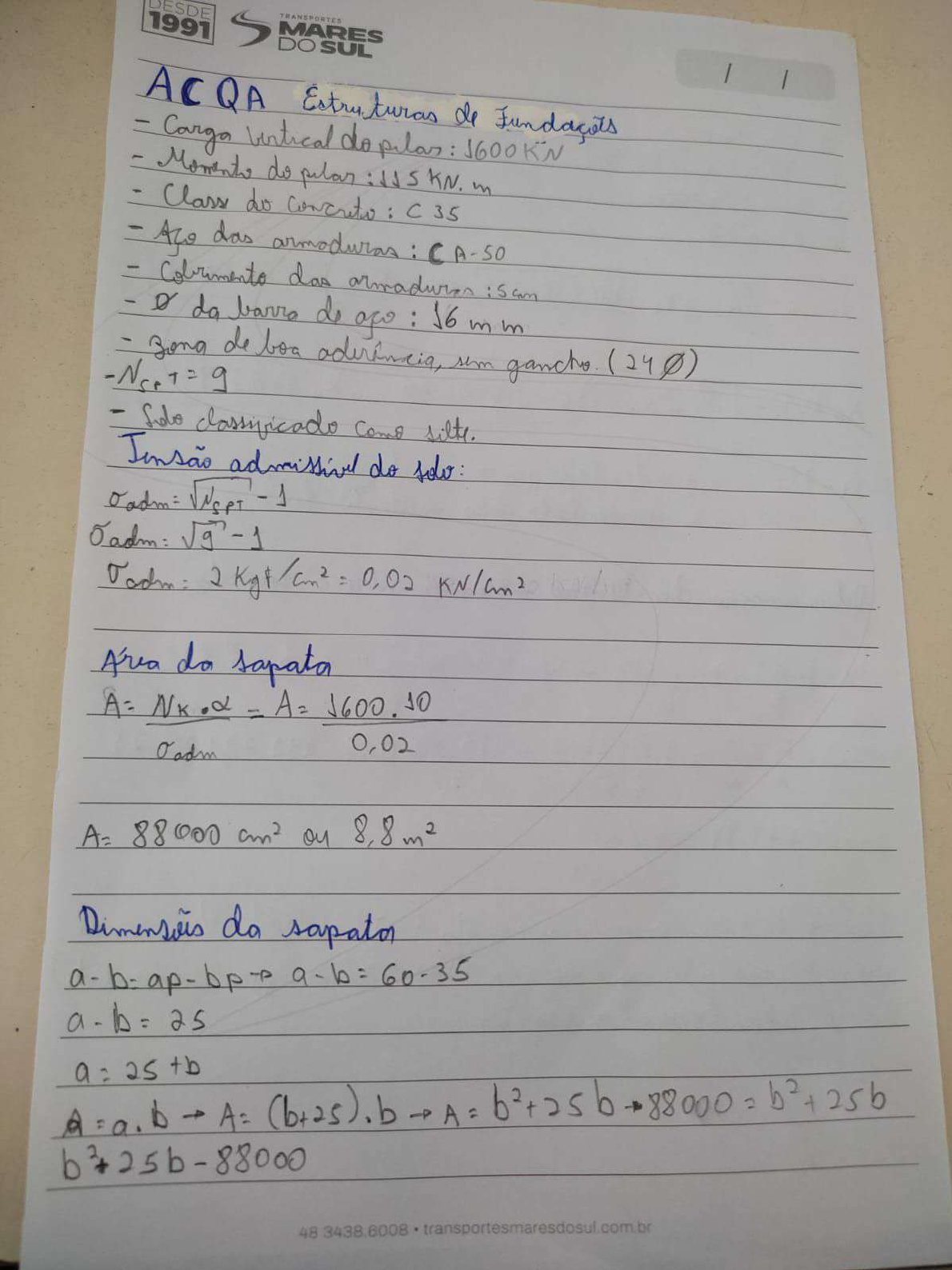 <p>TRANSPORTES 1991 MARES DOSUL / / ACQA Estruturas de - vertical do 1600 KN - do KN. in Class do C 35 das - das is - da barra : 16 mm - de boa shm (240) - Nset = 9 - classificado Jensas do NSPT - 1 adm: Jg -1 2 0,02 Area do = A= 1600.10 0,02 Oadm A= 88000 on da sapata a-b-ap-bp- A= (b+25). b A = 88000 48 3438.6008</p><p>/ MARES DESDE DOSUL 1991 352625 352625 = 2a 2 = -25 309,4 2a 2 : 285 para multiple 310 ( da a sapata b.a2 W = in 2 3 6 6 = = + A 8,835 4.56 224,41 KN/m2 A maxima sapata (224,41 i que a admissional do solo (200 a sapata</p><p>DESDE 1991 MARES DOSUL / / = A= 5,53 6 Omax 1,10.1600 10,065 5,53 Omax = 195,6 Novas medidas da a = 330 3005 an Determinar a= +2x = 1,375 m b= bp+2y y= 2.70 = 1,35 in da I que as multiples 5. as medidas para as sois da sapata a: b= 3,10 m. da sapata (h) Sapata (a-ap) (3,40-0,6) = in 3 3 h > 0,91 in 91cm 3 3</p><p>/ TRANSPORTES / MARES DESDE DOSUL 1991 h 2 lot h= 43,4 = ancoragem - vista dades N derar valor encontrado para a are- donda - de 5 a h= 95 balanco = 1,40 in on J 40 Cm das a: in 340 Cm 3,10 on 310 altura (h) 0,95 on Name: Andreas RA:</p>