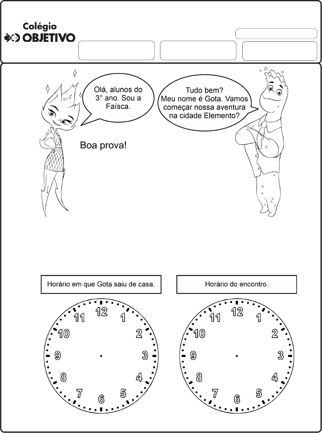 <p>Nome: __________________________________________________________ Nº: __________________</p><p>Data: ____/____/2023</p><p>Ano: 3º Bimestre: 3º</p><p>NOTA:Prova:</p><p>BIMESTRAL</p><p>Disciplina:</p><p>MATEMÁTICA</p><p>Ensino Fundamental</p><p>MATEMÁTICA - BIMESTRAL - 3º ANO - 1</p><p>Disponível em: https://www.morningkids.ne/coloring-pages-id-47088-elemental-wade-ember.html. Acesso em: 30 jul. 2023.</p><p>1) Gota marcou um encontro com a Faísca, para assistirem a um filme e combinaram de</p><p>se encontrar às 3h da tarde, na frente do cinema. Para não se atrasar, Gota saiu de casa</p><p>30 minutos antes do encontro.</p><p>Registre, nos relógios abaixo, a hora exata em que Gota saiu de sua casa e a hora exata</p><p>marcada para o encontro com Faísca.</p><p>Disponível em: http://tarefinhasdecasa.blogspot.com/2017/07/como-olhar-hora-no-relogio-analogico.html.</p><p>MATEMÁTICA - BIMESTRAL - 3º ANO - 2</p><p>2) Na bilheteria do cinema, Gota foi comprar os ingressos para ele e para a Faísca. Cada</p><p>ingresso custou 42 reais.</p><p>a) Qual foi o valor pago na compra dos dois ingressos?</p><p>b) Gota pagou os ingressos com uma nota de 100 reais. Quanto ele recebeu de troco?</p><p>Resposta:________________________________________________________</p><p>Resposta:________________________________________________________</p><p>MATEMÁTICA - BIMESTRAL - 3º ANO - 3</p><p>3) Após o término do filme, Faísca voltou para a loja de seu pai, que se chama Brasa. Brasa</p><p>pediu que Faísca contasse o estoque dos potes de geleia de uva e também os de geleia</p><p>de laranja. Veja como os potes de geleia estavam organizados:</p><p>Disponível em: https://pt.vecteezy.com/arte-vetorial/7743678-conjunto-de-vidros-de-diferentes-compotas-caseiras.</p><p>Acesso em: 30 jul. 2023.</p><p>Registre, com a escrita matemática, a quantidade total de potes de geleia.</p><p>Qual é o total de potes?________________________________________________</p><p>MATEMÁTICA - BIMESTRAL - 3º ANO - 4</p><p>4) No dia seguinte, Faísca entregou à Gota um desafio, para que ele resolvesse.</p><p>Se ele conseguisse acertar todo o desafio, ela compraria ingressos do jogo de basquete do</p><p>time “Windbreaker”, do qual ele é fã. Para acertar, Gota precisa pintar as nuvens conforme</p><p>as orientações escritas a seguir. Ajude-o a resolver o desafio.</p><p>• O dobro de 35. (Pinte de azul.)</p><p>• 25 ÷ 5 (Pinte de vermelho.)</p><p>• 6 x 4 (Pinte de verde.)</p><p>• O triplo de 7. (Pinte de amarelo.)</p><p>Cálculos:</p><p>MATEMÁTICA - BIMESTRAL - 3º ANO - 5</p><p>5) Na loja de conveniência de seu pai, Faísca também está organizando o estoque de</p><p>pedaços de carvão. Nessa loja há 48 pedaços de carvão e Faísca quer distribuí-los em</p><p>pacotes de 6 em 6.</p><p>Se todos os pacotes receberão a mesma quantidade de pedaços de carvão, então, quantos</p><p>pacotes poderão ser formados?</p><p>Mostre seu esquema de resolução ou o seu cálculo.</p><p>Resposta:________________________________________________________</p><p>6) Gota, Faísca e Turrão estão em pontos diferentes da cidade Elemento. Descubra qual é a</p><p>localização de cada um deles.</p><p>Disponível em: https://www.morningkids.net/desenhos-para-colorir-2307-pt-elemental.html. Acesso em: 30 jul. 2023.</p><p>MATEMÁTICA - BIMESTRAL - 3º ANO - 6</p><p>Observe a tabela de localização de cada elemento.</p><p>Para o lado</p><p>→</p><p>Para cima</p><p>↑</p><p>Nome Cor do ponto que</p><p>representa sua</p><p>localização</p><p>5 2 Gota Azul</p><p>8 9 Faísca Vermelho</p><p>11 5 Turrão Marrom</p><p>No quadriculado, a seguir, indique, com os pontos coloridos as localizações dos três</p><p>personagens.</p><p>MATEMÁTICA - BIMESTRAL - 3º ANO - 7</p><p>7) Faísca lembrou que Gota a convidou para almoçarem em um restaurante que ele conhece.</p><p>Nesse restaurante há várias opções de pratos e bebidas disponíveis.</p><p>Mas, às quartas-feiras, cada pessoa, se escolhe apenas um prato quente, e apenas uma</p><p>bebida, do cardápio do Chefe de Cozinha, o preço, a pagar, fica menor.</p><p>Observe o cardápio, abaixo:</p><p>Pratos Quentes Bebidas</p><p>Macarrão à bolonhesa Água</p><p>Risoto de queijo Suco de laranja</p><p>Salada mista de legumes cozidos Suco de morango</p><p>Batata recheada Limonada</p><p>Lasanha</p><p>Pizza</p><p>Cada pessoa, ao escolher, combinando sempre um prato quente e uma bebida, quantas</p><p>possibilidades diferentes ela tem?</p><p>Mostre seu esquema de resolução ou o seu cálculo.</p><p>Resposta:_____________________________________________________</p>