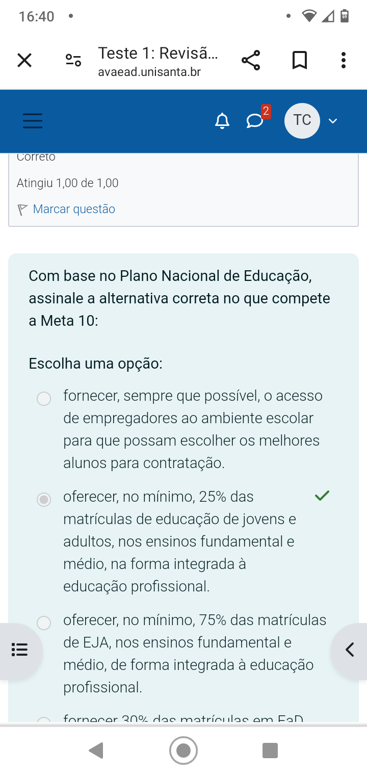 <p>16:40 Teste 1: Revisã... X avaead.unisanta.br 2 TC V correto Atingiu 1,00 de 1,00 Marcar questão Com base no Plano Nacional de Educação, assinale a alternativa correta no que compete a Meta 10: Escolha uma opção: fornecer, sempre que possível, acesso de empregadores ao ambiente escolar para que possam escolher os melhores alunos para contratação. oferecer, no mínimo, 25% das matrículas de educação de jovens e adultos, nos ensinos fundamental e médio, na forma integrada à educação profissional. oferecer, no mínimo, 75% das matrículas de EJA, nos ensinos fundamental e < médio, de forma integrada à educação profissional. das matrículas</p>