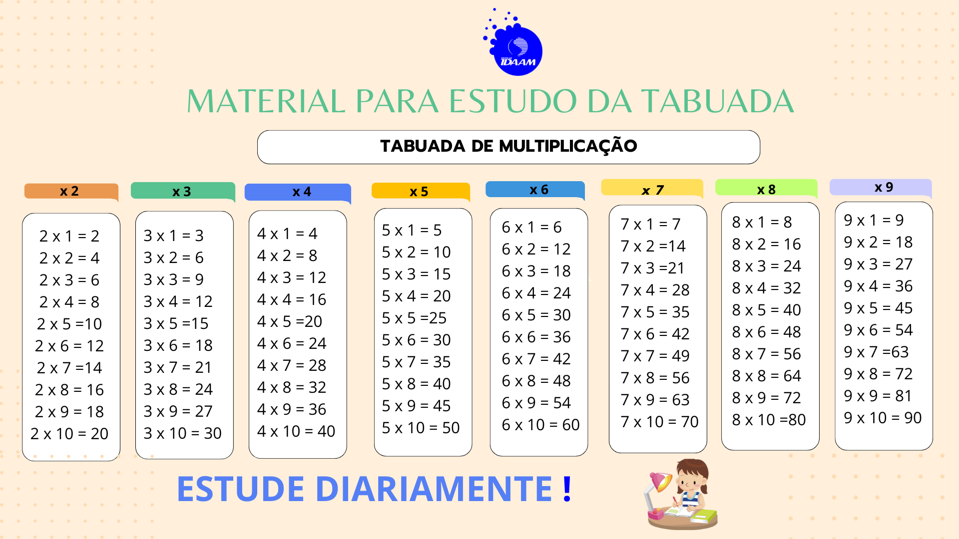 <p>IDAAM MATERIAL PARA ESTUDO DA TABUADA TABUADA DE MULTIPLICAÇÃO x8 4 x 1 = 4 = 6 =7 5 x 2 = 10 = 12 8 x 2 = 16 9 x 2 = 18 = 18 = 24 3x3=9 = 24 32 35 8 x 5 = 40 45 = 30 2 x 6 = 12 3 x 6 = 18 = 36 42 = 48 9 x 6 = 54 = 42 8 x 7 = 56 = 48 = 64 = 32 = 36 45 = 54 63 = 72 9 x 9 = 81 = 40 = 60 = 90 = 50 ESTUDE DIARIAMENTE !</p>