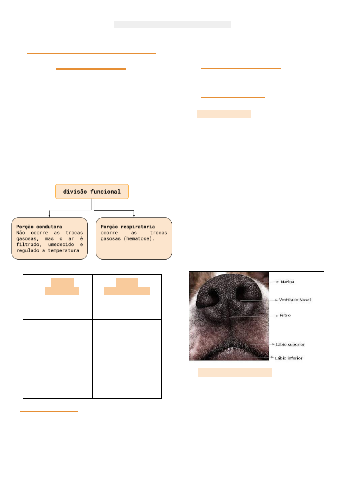 <p>Resumo Histologia especial - Maria Jose Soliz</p><p>Histologia do sistema</p><p>respiratório</p><p>O sistema respiratório é responsável</p><p>pela respiração do organismo, pois</p><p>ocorre o processo da hematose (troca</p><p>gasosa). Na qual, o ar tem todo um</p><p>trajeto até chegar a porção</p><p>respiratória. Onde primeiro o ar é</p><p>filtrado, umedecido e aquecido. Assim,</p><p>como esse sistema elimina substâncias</p><p>que sejam nocivas para o organismo,</p><p>emitir sons e captar odores no</p><p>ambiente.</p><p>Cavidade nasal:</p><p>A cavidade nasal pode ser dividida em</p><p>três regiões:</p><p>- região cutânea compostas pelo</p><p>vestíbulo nasal</p><p>- região respiratória compostas</p><p>pelas conchas dorsal, média e</p><p>ventral</p><p>- região olfatória composta pela</p><p>concha etmoidal</p><p>Na região cutânea é a área da entrada</p><p>do ar pelas narinas do animal. Sendo</p><p>assim, o vestíbulo nasal a princípio</p><p>é revestido por epitélio</p><p>estratificado pavimentoso</p><p>queratinizado, e a medida que se</p><p>adentra mais na região interna da</p><p>cavidade nasal se torna epitélio</p><p>epitélio estratificado não</p><p>queratinizado. Na qual, se apoia</p><p>sobre uma lâmina própria de tecido</p><p>conjuntivo denso.</p><p>Nessa região encontram-se vibrissas e</p><p>glândulas (sebáceas e sudoríparas)</p><p>que protegem essa entrada, como uma</p><p>barreira natural.</p><p>Na região respiratória é a área que</p><p>se encontram as conchas nasais, que</p><p>são os ossos turbinados, que aumentam</p><p>a superfície da área respiratória por</p><p>onde o ar passa. Assim, são divididas</p><p>em 3 partes: concha dorsal, concha</p><p>média e concha ventral. Logo, é</p><p>revestido por tecido epitelial</p><p>Porção</p><p>condutora</p><p>Porção</p><p>respiratória</p><p>Cavidade nasal Bronquíolos</p><p>respiratórios</p><p>Faringe Ductos alveolares</p><p>Laringe Sacos alveolares</p><p>Traqueia Alvéolos</p><p>pulmonares</p><p>Brônquios</p><p>Bronquíolos</p><p>Resumo Histologia especial - Maria Jose Soliz</p><p>pseudoestratificado ciliado com</p><p>células caliciformes ou epitélio</p><p>respiratório.</p><p>Na região olfatória se encontra</p><p>presente a concha etmoidal que é</p><p>responsável pela captação de odores,</p><p>pois está em contato com o nervo</p><p>olfatório. Dependendo da espécie</p><p>quanto maior, maior é assim consegue</p><p>captar melhor os odores. Essa área é</p><p>revestida pelo epitélio olfatório, que</p><p>contém os quimiorreceptores da</p><p>olfação. O epitélio olfatório é um</p><p>neuro epitélio pseudoestratificado.</p><p>Células do epitélio respiratório:</p><p>Células ciliadas: Ajudam no mecanismo</p><p>de limpeza e são as mais abundantes.É</p><p>rica em mitocôndrias para dar energia</p><p>à movimentação dos cílios.</p><p>Células caliciformes: São secretoras</p><p>de muco rico em polissacarídeos,</p><p>atuando como uma barreira de proteção.</p><p>Células em escova: Tem cílios menores</p><p>e tornam a superfície do trato</p><p>respiratório irregular. Aprisionam</p><p>melhor as partículas.</p><p>Célula granular: Secreta hormônios</p><p>peptídicos: serotonina, calcitonina e</p><p>entre outros. Por isso, é considerado</p><p>uma célula que pertence ao sistema</p><p>neuroendócrino.</p><p>Célula basal: É uma célula que está</p><p>em constante reposição quando outras</p><p>células morrem.</p><p>Células do epitélio olfatório</p><p>etmoidal:</p><p>-Células basais</p><p>-Células colunares com</p><p>microvilosidades.</p><p>-Células olfatórias que são neurônios</p><p>bipolares que levam a informação ao</p><p>sistema nervoso central.</p><p>Resumo Histologia especial - Maria Jose Soliz</p><p>- Também há glândulas que ajudam na</p><p>captação de odor e também levam a</p><p>informação ao SNC, mas não é a</p><p>principal via.</p><p>Faringe/Laringe:</p><p>A faringe é o órgão que une o sistema</p><p>respiratório e digestório, dividido</p><p>pelo palato mole.</p><p>nasofaringe (dorsalmente ao palato</p><p>mole)</p><p>orofaringe (ventralmente ao palato</p><p>mole)</p><p>Laringofaringe (caudalmente ao palato</p><p>mole.</p><p>Em si, a primeira porção da faringe é</p><p>revestida pelo epitélio respiratório.</p><p>Já na orofaringe é revestida pelo</p><p>epitélio pavimentoso estratificado.</p><p>E por fim a última porção é uma área</p><p>da área de transição também é</p><p>composta por epitélio estratificado</p><p>pavimentoso, para a proteção em caso</p><p>de atrito.</p><p>Laringe:</p><p>É o órgão que une a faringe à</p><p>traqueia. Composto por cartilagens,</p><p>que ajudam na fonação, condutor da</p><p>respiração e age para que no momento</p><p>da deglutição do animal, para que o</p><p>alimento não vá para o sistema</p><p>respiratório.</p><p>Este tubo não tem revestimento</p><p>epitelial uniforme, podendo ser</p><p>revestido por epitélio estratificado</p><p>pavimentoso e nas demais regiões por</p><p>epitélio de revestimento do tipo</p><p>respiratório.</p><p>Resumo Histologia especial - Maria Jose Soliz</p><p>Traqueia:</p><p>Une a laringe aos brônquios, é</p><p>formada por cartilagens em forma de</p><p>aneis incompletos. Se encontra caudal</p><p>à laringe, terminando em uma</p><p>bifurcação de brônquios que adentram</p><p>aos pulmões. Logo, é dividido em duas</p><p>regiões: porção cervical e porção</p><p>torácica.</p><p>Este órgão é composto por 4 túnicas:</p><p>- mucosa (interna - principal,</p><p>pois é ela que desempenha a</p><p>principal função da traqueia).</p><p>- submucosa (composta por tecido</p><p>conjuntivo que vasculariza o</p><p>epitélio)</p><p>- múscular musculo liso, na</p><p>traqueia, na maior parte, se</p><p>encontra a cartilagem.</p><p>- adventícia tecido conjuntivo</p><p>que liga o órgãos aos tecidos</p><p>vizinhos.</p><p>A parte interna da traqueia 