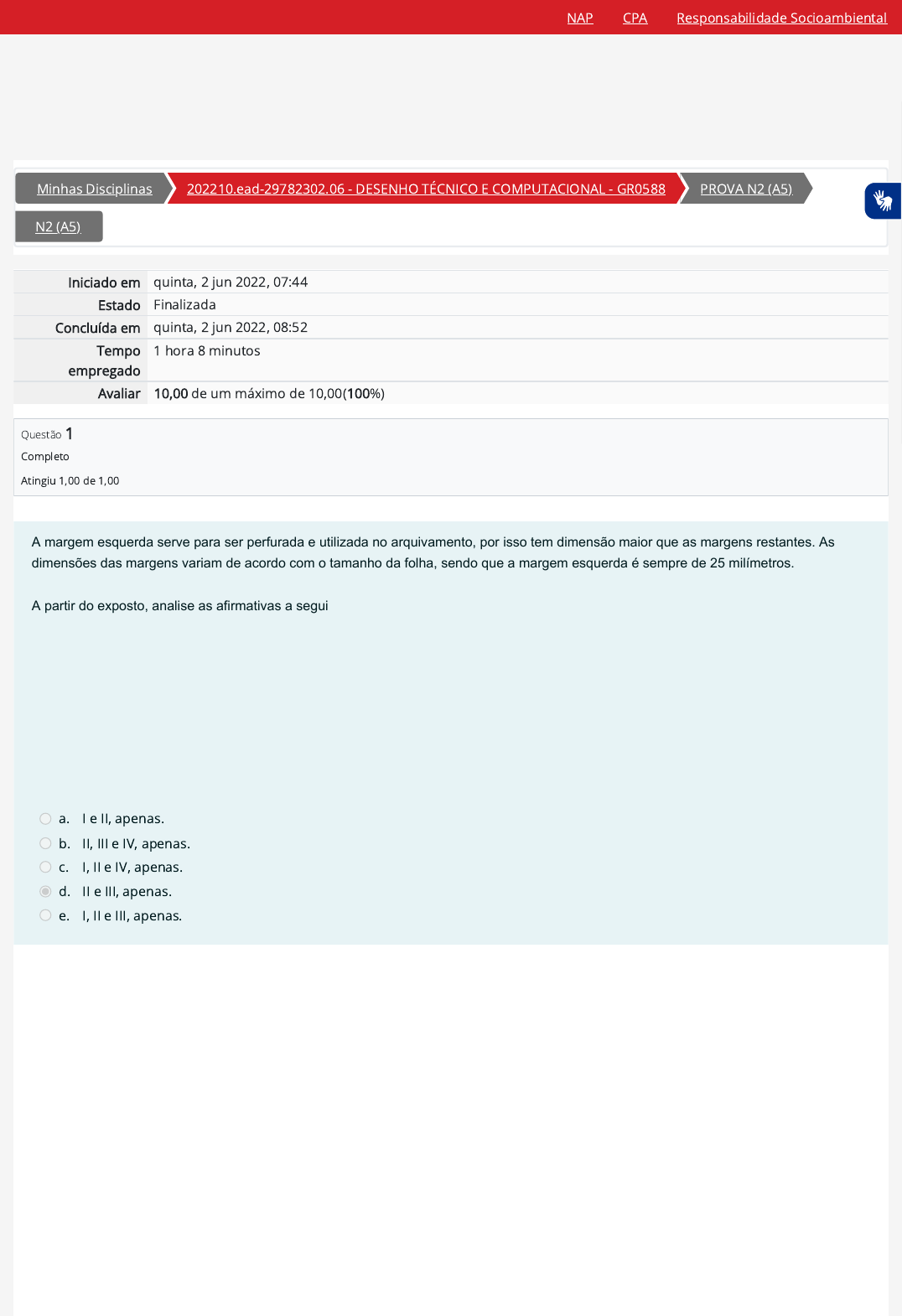 <p>Minhas Disciplinas 202210.ead-29782302.06 - DESENHO TÉCNICO E COMPUTACIONAL - GR0588 PROVA N2 (A5)</p><p>N2 (A5)</p><p>Iniciado em quinta, 2 jun 2022, 07:44</p><p>Estado Finalizada</p><p>Concluída em quinta, 2 jun 2022, 08:52</p><p>Tempo</p><p>empregado</p><p>1 hora 8 minutos</p><p>Avaliar 10,00 de um máximo de 10,00(100%)</p><p>Questão 1</p><p>Completo</p><p>Atingiu 1,00 de 1,00</p><p>A margem esquerda serve para ser perfurada e utilizada no arquivamento, por isso tem dimensão maior que as margens restantes. As</p><p>dimensões das margens variam de acordo com o tamanho da folha, sendo que a margem esquerda é sempre de 25 milímetros.</p><p>A partir do exposto, analise as afirmativas a seguir:</p><p>I. As margens, além da esquerda de 25 mm, possuem distância de 10mm em todos os formatos.</p><p>II. As margens dos formatos A0 e A1 possuem distância (superior, inferior e direita) de 10 mm.</p><p>III. As margens dos formatos A2 e A3 possuem distância (superior, inferior e direita) de 7 mm.</p><p>IV. Os formatos A4 e A5 podem possuir margens à esquerda com distância de 20 mm.</p><p>Está correto o que se afirma em:</p><p>a. I e II, apenas.</p><p>b. II, III e IV, apenas.</p><p>c. I, II e IV, apenas.</p><p>d. II e III, apenas.</p><p>e. I, II e III, apenas.</p><p>NAP CPA Responsabilidade Socioambiental</p><p>https://ambienteacademico.com.br/my/</p><p>https://ambienteacademico.com.br/course/view.php?id=6102</p><p>https://ambienteacademico.com.br/course/view.php?id=6102§ion=7</p><p>https://ambienteacademico.com.br/mod/quiz/view.php?id=156443</p><p>https://codely-fmu-content.s3.amazonaws.com/Moodle/NAP/inicial/nap/fmu/index.html</p><p>https://codely-fmu-content.s3.amazonaws.com/Moodle/CPA/landing_CPA/index.html</p><p>https://portal.fmu.br/sustentabilidade</p><p>Questão 2</p><p>Completo</p><p>Atingiu 1,00 de 1,00</p><p>Questão 3</p><p>Completo</p><p>Atingiu 1,00 de 1,00</p><p>Entre os tipos de escala, está a Escala Gráfica, que tem como definição ser uma escala de representação da relação entre tamanhos</p><p>representativos de imagens, como fotografias, imagens sem cotas e mapas geográficos, e o seu tamanho real, criando, assim, uma</p><p>proporção entre a escala e a imagem, que não será perdida, mesmo que a escala e a imagem sejam redimensionadas.</p><p>A respeito da definição de Escala Gráfica, analise as afirmativas a seguir e assinale V para a(s) Verdadeira(s) e F para a(s) Falsa(s).</p><p>I. ( ) O uso da escala gráfica é adequado para que os mapas e as imagens tenham uma proporção exata com o mundo real.</p><p>II. ( ) A escala indica a proporção em que um mapa foi traçado em relação ao objeto real.</p><p>III. ( ) Nas escalas gráficas, lê-se a dimensão do objeto em relação ao desenho, por exemplo: 1/20.</p><p>IV. ( ) A escala gráfica é muito útil para manter a proporção da imagem, garantindo a correta leitura das medidas, mesmo com possíveis</p><p>ampliações ou reduções.</p><p>Assinale a alternativa que apresenta a sequência correta.</p><p>a. V, V, F, F.</p><p>b. V, V, V, V.</p><p>c. F, F, F, F.</p><p>d. V, V, F, V.</p><p>e. F, V, F, V.</p><p>Os programas ou softwares CAD evoluíram bastante desde sua origem na década de 50, e esta evolução está diretamente ligada à</p><p>evolução dos hardwares. Com computadores mais potentes, surgiram programas mais complexos que se tornaram populares pelas</p><p>facilidades e vantagens que ofereciam. Em relação ao assunto, assinale a alternativa correta:</p><p>a. O AutoCAD, que foi criado em 1982 pela Autodesk, que veio revolucionar o desenho em CAD, por ser o primeiro programa 2D</p><p>para PCs.</p><p>b. O CATIA foi criado na década de 80 pela Autodesk, e veio revolucionar o desenho em CAD, sendo o primeiro programa grá�co</p><p>2D.</p><p>c. O Pro/Engineer foi o primeiro programa grá�co de CAD 3D, criado pela Dassault Systemes em 1981, estando em uso até hoje.</p><p>d. O AutoCAD é conhecido por sua facilidade de uso e in�nitas possibilidades de execução de desenhos 3D, além de ser</p><p>programa de CAE e de CAM.</p><p>e. O Solidworks foi primeiro programa CAD paramétrico (o modelo é de�nido por parâmetros, ao mudar uma informação, ou</p><p>parâmetro, altera-se todo o modelo por igual).</p><p>NAP CPA Responsabilidade Socioambiental</p><p>https://codely-fmu-content.s3.amazonaws.com/Moodle/NAP/inicial/nap/fmu/index.html</p><p>https://codely-fmu-content.s3.amazonaws.com/Moodle/CPA/landing_CPA/index.html</p><p>https://portal.fmu.br/sustentabilidade</p><p>Questão 4</p><p>Completo</p><p>Atingiu 1,00 de 1,00</p><p>Questão 5</p><p>Completo</p><p>Atingiu 1,00 de 1,00</p><p>Para executar um desenho no AutoCAD precisamos recorrer a Guia HOME no Painel DRAW (Desenhar), onde teremos as ferramentas</p><p>necessárias para iniciarmos nosso projeto. Estas ferramentas complementadas pelo Painel MODIFY (Modificar) são as responsáveis por</p><p>quase totalidade dos desenhos.</p><p>a. O comando Line (linha) é utilizado para o desenho da entidade linha. Criando linhas separadas uma das outras.</p><p>b. O comando Circle (círculo) é um comando idêntico ao Line só com a diferença que as linhas são unidas, como uma linha</p><p>única.</p><p>c. A entidade Elipse é um comando para criar elipses retas ou inclinadas, pela área ou por distância.</p><p>d. O comando Arc (arco) é para desenhar círculos no ponto central (Raio), círculos com três pontos (3P), dois pontos (2P) ou</p><p>tangente (Ttr).</p><p>e. O comando Polyline (polilinha) serve para criar Arcos, com três pontos (padrão) ou pelo centro, como no comando círculo.</p><p>Leonardo da Vinci foi um grande pintor, escultor e um inventor muito a frente do seu tempo. Ele criou mecanismos que, até hoje, intrigam</p><p>muitos historiadores e cientistas. Por exemplo, o “aeroplano” foi mais um dos projetos extremamente inovadores de Leonardo da Vinci. Esse</p><p>projeto foi desenhado em 1485. Na verdade, essa máquina de voar