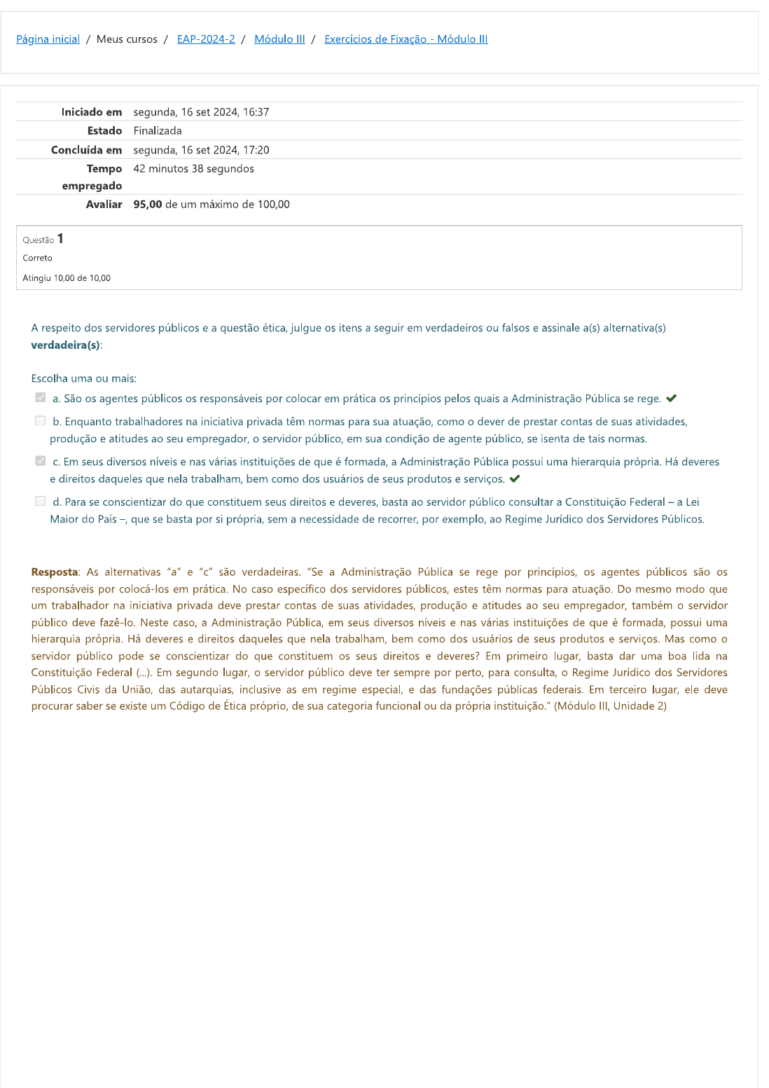 <p>Página inicial / Meus cursos / EAP-2024-2 / Módulo III / Exercícios de Fixação Módulo III Iniciado em segunda, 16 set 2024, 16:37 Estado Finalizada Concluída em segunda, 16 set 2024, 17:20 Tempo 42 minutos 38 segundos empregado Avaliar 95,00 de um máximo de 100,00 Questão 1 Correto Atingiu 10,00 de 10,00 A respeito dos servidores públicos e a questão ética, julgue os itens a seguir em verdadeiros ou falsos e assinale a(s) alternativa(s) verdadeira(s): Escolha uma ou mais: a. São os agentes públicos os responsáveis por colocar em prática os princípios pelos quais a Administração Pública se rege. b. Enquanto trabalhadores na iniciativa privada têm normas para sua atuação, como o dever de prestar contas de suas atividades, produção e atitudes ao seu empregador, o servidor público, em sua condição de agente público, se isenta de tais normas. C. Em seus diversos níveis e nas várias instituições de que é formada, a Administração Pública possui uma hierarquia própria. Há deveres e direitos daqueles que nela trabalham, bem como dos usuários de seus produtos e serviços. d. Para se conscientizar do que constituem seus direitos e deveres, basta ao servidor público consultar a Constituição Federal a Lei Maior do País que se basta por si própria, sem a necessidade de recorrer, por exemplo, ao Regime Jurídico dos Servidores Públicos. Resposta: As alternativas "a" e são verdadeiras. "Se a Administração Pública se rege por princípios, os agentes públicos são os responsáveis por colocá-los em prática. No caso específico dos servidores públicos, estes têm normas para atuação. Do mesmo modo que um trabalhador na iniciativa privada deve prestar contas de suas atividades, produção e atitudes ao seu empregador, também o servidor público deve fazê-lo. Neste caso, a Administração Pública, em seus diversos níveis e nas várias instituições de que é formada, possui uma hierarquia própria. Há deveres e direitos daqueles que nela trabalham, bem como dos usuários de seus produtos e serviços. Mas como o servidor público pode se conscientizar do que constituem os seus direitos e deveres? Em primeiro lugar, basta dar uma boa lida na Constituição Federal (...). Em segundo lugar, o servidor público deve ter sempre por perto, para consulta, o Regime Jurídico dos Servidores Públicos Civis da União, das autarquias, inclusive as em regime especial, e das fundações públicas federais. Em terceiro lugar, ele deve procurar saber se existe um Código de Ética próprio, de sua categoria funcional ou da própria instituição." (Módulo III, Unidade 2)</p><p>Questão 2 Correto Atingiu 10,00 de 10,00 Considere os princípios citados a seguir: Moralidade Legalidade III Publicidade IV Veracidade V - Impessoalidade VI Impunidade VII - Eficiência São corretos Princípios da Administração Pública: Escolha uma opção: a. Apenas I, II, III, V e VII. b. Apenas II, III, IV, VI e VII. C. Apenas I, II, V, VI e VII. d. Apenas III, IV, VI e VII. e. Apenas I, II, III, IV e V. Resposta: A letra "a" está correta. (Ver "Princípios da Administração Módulo III, Unidade 2) Questão 3 Parcialmente correto Atingiu 5,00 de 10,00 Vimos em nosso curso que a Administração Pública é composta em sua grande maioria pelos agentes administrativos e que estes, por sua vez, possuem suas próprias divisões. A respeito de tais subdivisões, julgue os itens que se seguem e marque a(s) correta(s): Escolha uma ou mais: a. São denominados Servidores públicos os que ocupam cargos públicos pertencentes à Administração direta, às autarquias ou às fundações públicas. b. Militares são aqueles pertencentes aos quadros das Forças Armadas. C. Dá-se o nome de Agentes Temporários àqueles contratados por período limitado de tempo. d. Aqueles contratados pelo regime da Consolidação das Leis do Trabalho (CLT) denominam-se Empregados públicos. Resposta: Todas as alternativas estão corretas. "Vamos nos deter um pouco mais sobre os agentes administrativos, que compõem a grande maioria da Administração Pública brasileira. Os agentes administrativos dividem-se em: Agentes Temporários: contratados por período limitado de tempo; Empregados públicos: contratados pelo regime da Consolidação das Leis do Trabalho (CLT); Militares: os pertencentes aos quadros das Forças Armadas; Servidores públicos: contratados pelo regime estatuário ocupam cargos públicos pertencentes à Administração direta, às autarquias ou às fundações (Módulo III, Unidade 1)</p><p>Questão 4 Correto Atingiu 10,00 de 10,00 Acerca dos Princípios da Administração Pública, analise as definições abaixo e, em seguida, assinale a alternativa que corresponde aos princípios em questão. - Assegura que os atos administrativos são de responsabilidade da Administração Pública e não de um servidor público específico. II Estipula que não basta os atos públicos serem legais, impessoais, de acordo com a moral e amplamente divulgados: eles devem também buscar o atendimento real dos objetivos a que se sempre em nome da sociedade, da população, que os III Assegura que a Administração Pública só pode agir em nome da lei e respaldada por ela. IV - Popularmente conhecido como transparência; significa que deve ser dada ampla divulgação aos atos administrativos, pelo seu caráter público, de modo que os cidadãos possam acompanhar e avaliar tais atividades. As definições correspondem, respectivamente, aos princípios da: Escolha uma opção: a. Eficiência; Moralidade; Impessoalidade; Publicidade. b. Impessoalidade; Eficiência; Legalidade; Publicidade. C. Impessoalidade; Moralidade; Eficiência; Legalidade; Publicidade. d. Impessoalidade; Eficiência; Legalidade; Moralidade. Resposta: A letra "b" é a correta. (Ver "Princípios da Administração Pública", Módulo III, Unidade 2) Questão 5 Correto Atingiu 10,00 de 10,00 Caracteriza-se pelas funções próprias do Estad