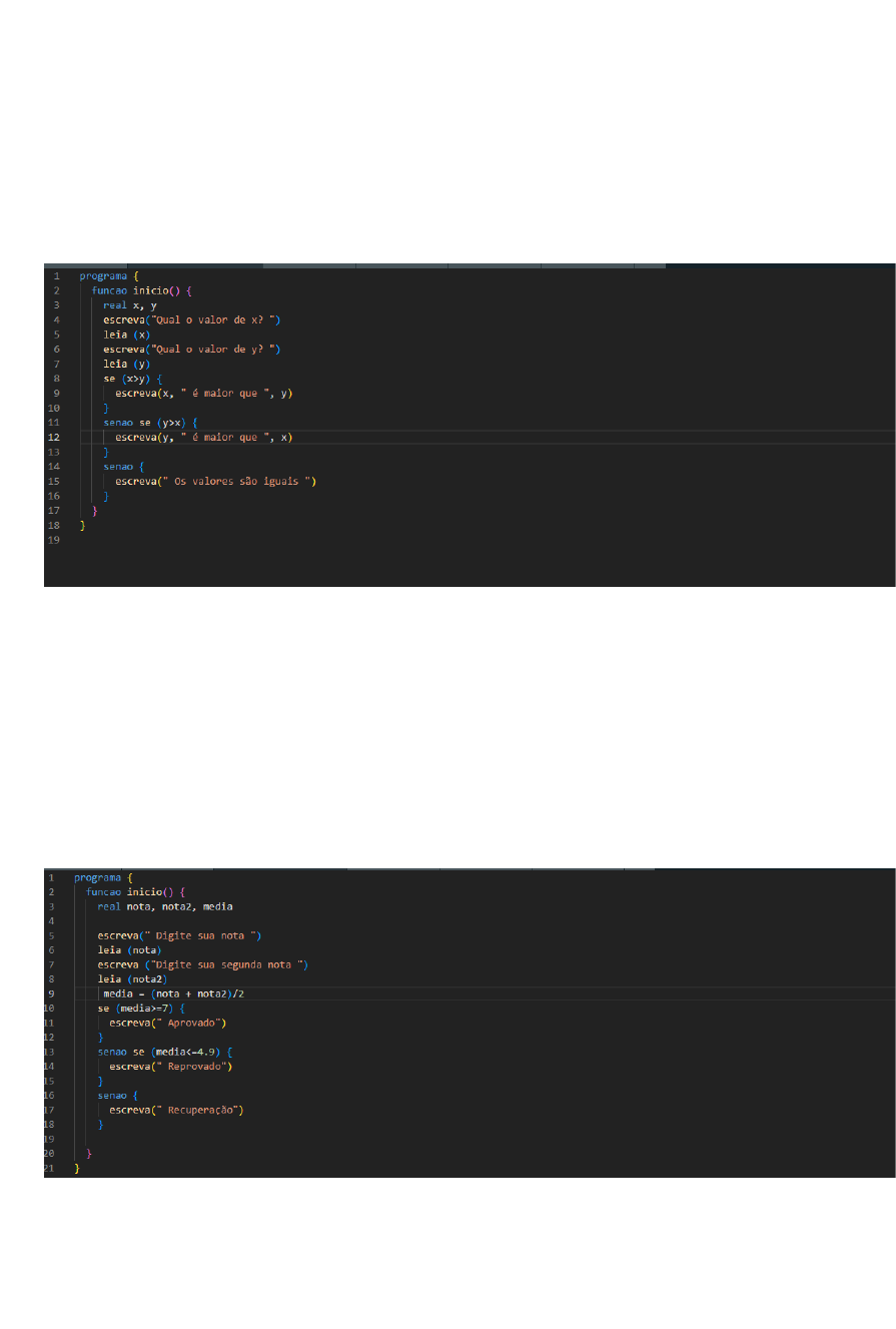 <p>a) Escreva um algoritmo que leia dois números inteiros e compare-os, mostrando na tela uma das mensagens abaixo:</p><p>-O primeiro valor é o maior</p><p>-O segundo valor é o maior</p><p>-Não existe valor maior, os dois são iguais</p><p>b) Escreva um algoritmo que leia duas notas de um aluno e calcule a sua média, mostrando uma mensagem no final, de acordo com a média atingida:</p><p>-Média até 4.9: REPROVADO</p><p>-Média entre 5.0 e 6.9: RECUPERAÇÃO</p><p>-Média 7.0 ou superior: APROVADO</p><p>c) Elabore um algoritmo que que leia a largura e o comprimento de um terreno retangular, calculando e mostrando a sua área em m² (l * c) e o seu perímetro (1l + 2c) . O programa também deve mostrar a classificação desse terreno, de acordo com a lista abaixo:</p><p>-Área abaixo de 100m² = TERRENO POPULAR</p><p>-Área entre 100m² e 500m² = TERRENO MASTER</p><p>-Área acima de 500m² = TERRENO VIP</p><p>O programa deverá mostrar também o perímetro do terreno e uma indicação de que ele é COMERCIAL caso a sua largura é maior do que 10m.</p><p>d)Elabore um Algoritmo que leia o nome de um funcionário, seu salário, quantos anos ele trabalha na empresa , se ele é operacional( O) ou administrativo (A) mostre quanto será o seu recebimento mensal, considerando que :</p><p>•Seu novo salário, reajustado de acordo com a tabela a seguir:</p><p>•Até 3 anos de empresa: aumento de 3%</p><p>•entre 3 e 10 anos: aumento de 12.5%</p><p>•10 anos ou mais: aumento de 20%</p><p>•Se ele for operacional, receberá ainda mais 5% do salário a título de adicional de insalubridade.</p><p>e)Elabore um Algoritmo que leia 4 números e mostre qual o maior produto doís a a dois, entre eles.</p><p>f)Elabore um Algoritmos que leia 4 números, faça a divisão entre os dois primeiros e a divisão entre os dois últimos.</p><p>•Caso a divisão entre os dois primeiros seja maior que 3, mostre o valor desse resultado.</p><p>•Caso tal divisão seja menor ou igual a 3, verifique se a divisão dos dois últimos é maior que 3 e se for mostre o valor desse resultado.</p><p>•Caso as duas divisões forem maior do que 3 mostre a mensagem “Produtos maiores do que 3”. Caso contrário mostre a seguinte mensagem “Pelo menos um dos produtos é menor do que 3”.</p><p>image5.png</p><p>image6.png</p><p>image1.png</p><p>image2.png</p><p>image3.png</p><p>image4.png</p>