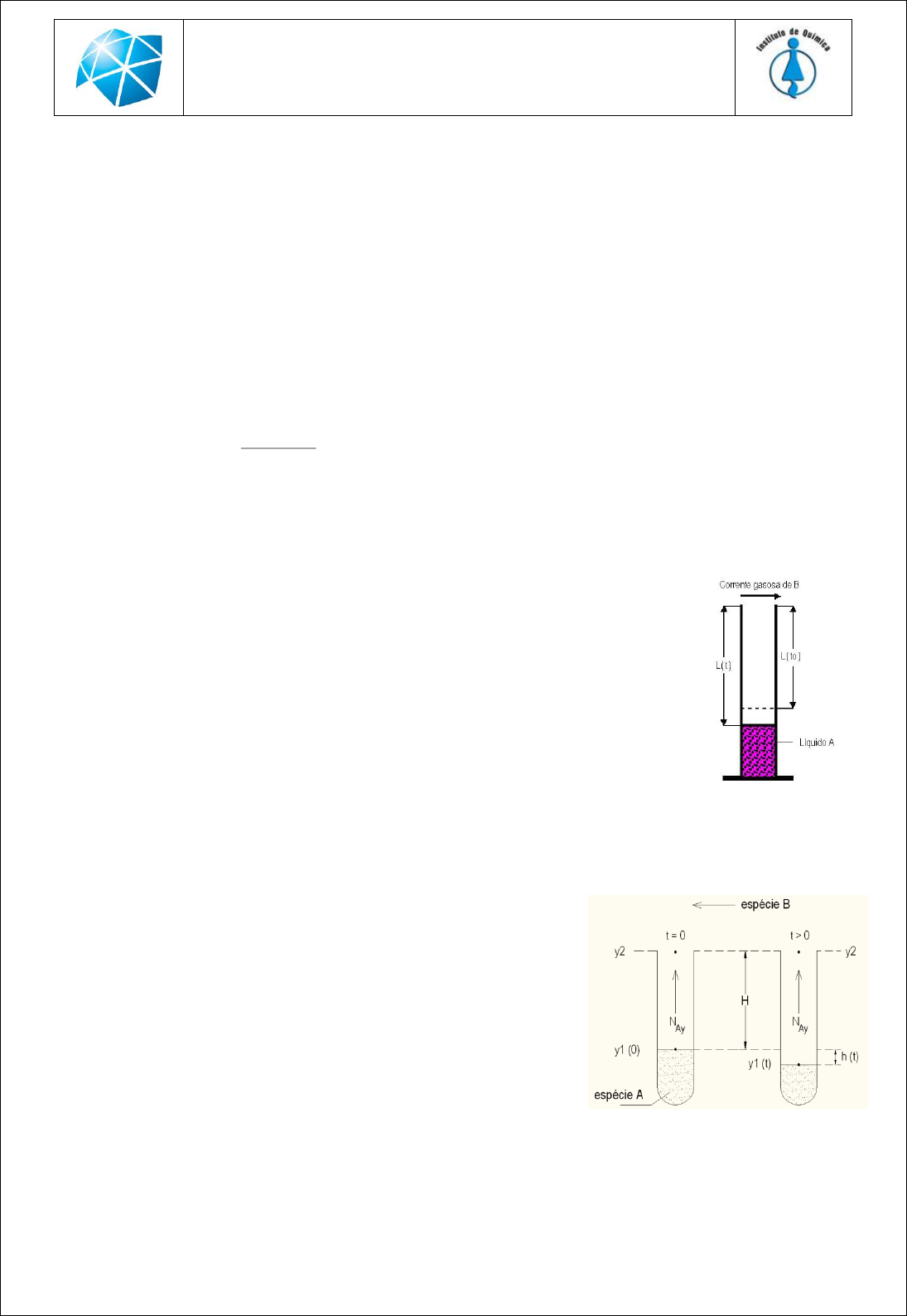 <p>UNIVERSIDADE ESTADUAL PAULISTA “JÚLIO DE MESQUITA FILHO”</p><p>INSTITUTO DE QUÍMICA – ARARAQUARA</p><p>DEPARTAMENTO DE ENGENHARIA, FÍSICA E MATEMÁTICA</p><p>FENÔMENOS DE TRANSPORTE III</p><p>Profa. Dra. Geisa Albini</p><p>Coeficiente de Difusão em gases - transferência de massa através de área constante</p><p>(Célula de Stefan)</p><p>1) INTRODUÇÃO</p><p>1.1) Objetivo</p><p>Determinar experimentalmente o coeficiente de difusão DAB de uma mistura binária de gases em processo</p><p>difusivo em regime quasi-estacionário. Na mistura binária investigada, um dos constituintes gasosos provém</p><p>de uma substância líquida pura em processo de evaporação.</p><p>1.2) Método</p><p>Medidas da variação de altura da coluna de uma substância líquida que evapora no interior de um tubo cilíndrico</p><p>de vidro com alta razão</p><p>diâmetro</p><p>ocompriment . O método é baseado na experiência de Stefan (Sherwood et al., 1975,</p><p>Mass Transfer, McGraw-Hill Inc., EUA).</p><p>2) DESCRIÇÃO DO EQUIPAMENTO</p><p>Célula de Stefan utilizada no experimento</p><p>Tubo de vidro com o fundo fechado, de diâmetro interno D 4 mm e</p><p>comprimento Ltotal 30 cm, fixado verticalmente a um suporte contendo uma</p><p>escala graduada para a leitura de L(t).</p><p>Outros materiais necessários:</p><p>termômetro, barômetro e a substância líquida A (acetona, metanol, éter dietílico,</p><p>clorofórmio, dicloroetano, etc).</p><p>Figura 1 – Célula de Stefan</p><p>3) FUNDAMENTOS TEÓRICOS</p><p>3.1) Considerações gerais</p><p>I) O sistema é binário - somente as duas substâncias, A e B, são</p><p>relevantes no processo de transferência de massa.</p><p>II) Não há reações no sistema - A e B não são consumidos ou</p><p>formados.</p><p>III) O gás B (ar) mantém-se estagnado no interior do tubo e não</p><p>se difunde em A.</p><p>IV) A densidade e as propriedades da mistura são uniformes - c</p><p>constante (A e B comportam-se como gases ideais) e DAB é</p><p>constante (vide Equação 1).</p><p>V) O processo ocorre em estado pseudo-estacionário - o nível de</p><p>líquido (A) diminui tão lentamente que a difusão de A através do</p><p>gás B ocorre em regime quasi-estacionário durante um longo</p><p>intervalo de tempo ∆t = tf – t0.</p><p>t0 = 0 t = t</p><p>Figura 2 – Evaporação de A com difusão em regime quasi-</p><p>estacionário: a interface líquido-gás desloca-se muito</p><p>lentamente (para baixo) durante a evaporação, enquanto</p><p>a mistura gasosa de composição xA2 sai pelo topo aberto</p><p>do tubo.</p><p>UNIVERSIDADE ESTADUAL PAULISTA “JÚLIO DE MESQUITA FILHO”</p><p>INSTITUTO DE QUÍMICA – ARARAQUARA</p><p>DEPARTAMENTO DE ENGENHARIA, FÍSICA E MATEMÁTICA</p><p>FENÔMENOS DE TRANSPORTE III</p><p>Profa. Dra. Geisa Albini</p><p>3.2) Equacionamento do processo</p><p>O fluxo de uma propriedade (momento, calor ou massa) é o produto de sua concentração e a velocidade com</p><p>a qual a quantidade da propriedade se movimenta no sentido do equilíbrio. Desta forma, o fluxo molar total de</p><p>A na direção de y pode ser expresso por:</p><p>*vc vc vc yAAdyAAyA += (1)</p><p>Onde vAy = velocidade global de A, vAdy = velocidade de difusão de A através de B e vy* = velocidade molar</p><p>média da mistura.</p><p>Sendo</p><p>AyAyA N vc = fluxo molar total de A</p><p>*Jvc AyAdyA = fluxo de difusão molar de A através de B</p><p>e *vc yA fluxo molar associado ao movimento do fluido,</p><p>temos que</p><p>*vc*JN yAAyAy += (2)</p><p>O fluxo de difusão molar de A através de B, na direção de y, é representado pela LEI DE FICK como:</p><p>dy</p><p>dc</p><p>D*J A</p><p>ABAy −= (3)</p><p>Considerando-se que a concentração molar total, c, é constante e a difusividade de A em B, DAB, é praticamente</p><p>independente de c, a LEI DE FICK, pode ser reexpressa por:</p><p>dy</p><p>dx</p><p>Dc*J A</p><p>ABAy −= (4)</p><p>onde</p><p>c</p><p>c</p><p>x A</p><p>A = é a fração molar de A.</p><p>Em unidades do Sistema Internacional, JAy* [=] mols de A/(m2s)</p><p>A velocidade molar média é dada por</p><p>c</p><p>vcvc</p><p>*v</p><p>ByBAyA</p><p>y</p><p>+</p><p>= (5)</p><p>e pode ser reescrita por</p><p>c</p><p>NN</p><p>*v</p><p>ByAy</p><p>y</p><p>+</p><p>= (6)</p><p>onde ByByB Nvc = é o fluxo molar de B</p><p>Combinando e rearranjando as equações (2), (4) e (6), obtém-se uma expressão para o fluxo unidimensional</p><p>(na direção de y) de A no sistema binário:</p><p>)NN(x</p><p>dy</p><p>dx</p><p>DcN ByAyA</p><p>A</p><p>ABAy ++−= (7)</p><p>UNIVERSIDADE ESTADUAL PAULISTA “JÚLIO DE MESQUITA FILHO”</p><p>INSTITUTO DE QUÍMICA – ARARAQUARA</p><p>DEPARTAMENTO DE ENGENHARIA, FÍSICA E MATEMÁTICA</p><p>FENÔMENOS DE TRANSPORTE III</p><p>Profa. Dra. Geisa Albini</p><p>Como a espécie B mantém-se estagnada no interior do tubo NBy = 0 e, assim, a equação (7) pode ser</p><p>simplificada e rearranjada para:</p><p>dy</p><p>dx</p><p>)x1(</p><p>1</p><p>DcN A</p><p>A</p><p>ABAy</p><p>−</p><p>−= (8)</p><p>Para uma mistura gasosa ideal a T e p constantes,</p><p>RT</p><p>p</p><p>c = e, sendo</p><p>p</p><p>p</p><p>x A</p><p>A = , a equação (8) pode ser reescrita</p><p>por</p><p>( ) dy</p><p>dp</p><p>pp1</p><p>1</p><p>RT</p><p>D</p><p>N A</p><p>A</p><p>AB</p><p>Ay</p><p>−</p><p>−= (9)</p><p>sendo, como mencionado anteriormente, DAB constante e praticamente independente da densidade molar do</p><p>sistema, c.</p><p>3.2.1) Passo de difusão constante</p><p>Assumindo que o passo de difusão é constante, a posição da interface líquido-gás (y1) permanece inalterada</p><p>durante todo o processo, ou seja, y1 independe de t. Assim, a integração da equação (9) entre y1 e y2 e entre</p><p>pA1 e pA2 (pressões parciais da substância A em y1 e y2, respectivamente) resulta em:</p><p>( ) </p><p></p><p></p><p></p><p></p><p></p><p>−</p><p>−</p><p></p><p>−</p><p>=</p><p>1A</p><p>2A</p><p>12</p><p>AB</p><p>Ay</p><p>pp</p><p>pp</