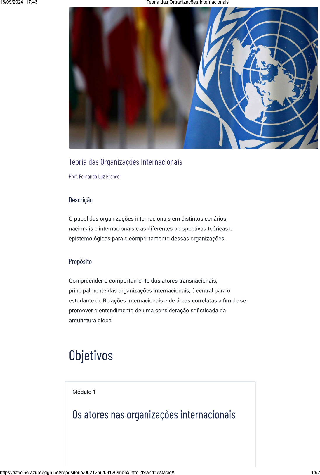 <p>16/09/2024, 17:43 Teoria das Organizações Internacionais Teoria das Organizações Internacionais Prof. Fernando Luz Brancoli Descrição papel das organizações internacionais em distintos cenários nacionais e internacionais e as diferentes perspectivas teóricas e epistemológicas para o comportamento dessas organizações. Propósito Compreender o comportamento dos atores transnacionais, principalmente das organizações internacionais, é central para o estudante de Relações Internacionais e de áreas correlatas a fim de se promover o entendimento de uma consideração sofisticada da arquitetura global. Objetivos Módulo 1 Os atores nas organizações internacionais</p><p>16/09/2024, 17:43 Teoria das Organizações Internacionais Reconhecer as organizações internacionais e os principais atores envolvidos nessas atividades. Módulo 2 Organizações internacionais: cenários e perspectivas Identificar os elementos das organizações internacionais e suas consequências nos cenários doméstico e internacional. Módulo 3 Negociações internacionais: Estados e instituições Definir o papel dos Estados e das instituições internacionais nas negociações diplomáticas. Módulo 4 Temas sensíveis e narrativas sobre as organizações internacionais Distinguir narrativas sobre as organizações internacionais e o papel delas em temas sensíveis. Introdução Neste conteúdo, debateremos a resolução dos problemas internacionais com a criação e a sofisticação das organizações internacionais Não se trata, contudo, de indicar uma linha contínua de desenvolvimento entre antigas coligações, e sim a lógica existente na exploração de temas, estratégias e elementos 2/62</p><p>16/09/2024, 17:43 Teoria das Organizações Internacionais que permeiam as reflexões sobre as Ols a partir de uma melhor compreensão das conexões históricas. A literatura tradicional em Relações Internacionais é centralizada na análise dos Estados. Mesmo assim, as Ols atraem cada vez mais atenção, principalmente pela capacidade de lidar com desafios transnacionais cada vez mais complexos. Neste conteúdo, faremos uma reflexão crítica sobre o estudo das Ols no campo das Relações Os elementos que debateremos nas próximas páginas tentarão responder às seguintes questões: as Ols importam? Quais são seus efeitos nas Relações Internacionais? Onde elas se encaixam na literatura de estudos transnacionais? Como devemos estudá-las? Teorizar sobre as Ols é entender um conjunto vital de novas dinâmicas das quais passaremos a tratar. 1 - - Os atores nas organizações internacionais Ao final deste módulo, você será capaz de reconhecer as organizações internacionais e os principais atores envolvidos nessas atividades. Origens das organizações internacionais 3/62</p><p>16/09/2024, 17:43 Teoria das Organizações Internacionais Formação dos Estados contemporâneos Assista agora a um vídeo em que são apresentadas informações sobre a origem das organizações internacionais. Para assistir a um vídeo sobre o assunto, acesse a versão online deste conteúdo. -0- Contextualização Ratificação do Paz de na cidade de Münster, atual alemanha, em 1648. Pintura de Gerard ter Borch. Os estudiosos das Relações Internacionais datam o sistema estatal contemporâneo como um processo iniciado em 1648, quando o Tratado de Westfália encerrou a Guerra dos Trinta Anos. Embora a maioria dos artigos do tratado cite a alocação dos despojos de guerra, outras disposições revelaram-se pioneiras. Os artigos 64, 65 e 67 do referido tratado, por exemplo, estabeleceram vários princípios-chave de um novo sistema de Estado: a soberania territorial; o direito do Estado de escolher sua religião; e a proibição da interferência de autoridades supranacionais, como a Igreja Católica ou o Sacro Império Romano. tratado marcou o fim do governo das autoridades religiosas na Europa e o surgimento de Estados seculares. 4/62</p><p>16/09/2024, 17:43 Teoria das Organizações Internacionais Negociações dos termos da Paz de Vestfália. Pintura de Fritz Grotemeyer (1902). Com a autoridade secular, veio o princípio da integridade territorial dos Estados juridicamente iguais e participantes soberanos do sistema internacional. A soberania era o conceito central nesse sistema, como afirmou o filósofo francês Jean Bodin (1530-1596). Segundo Bodin, ela é entendida como "a marca distintiva de que o soberano não pode, de forma alguma, estar sujeito aos comandos de outro, pois é ele quem faz a lei para o sujeito, revoga a lei já feita e altera a lei obsoleta" (1992, p. 25). o filósofo também reforça que que a soberania pode ser limitada pela lei divina ou pela lei natural, assim como pelo tipo de regime ou até mesmo por promessas ao povo. A natureza do sistema estatal contemporâneo e da soberania do Estado é uma questão controversa entre os teóricos das Relações Internacionais (RI). Ainda assim, as fraquezas desse sistema tornaram-se cada vez mais aparentes durante século XIX com o crescimento do comércio internacional, a migração, a democratização, a inovação tecnológica e outros desenvolvimentos que aumentaram a interdependência e destacaram as limitações impostas pela soberania dos Estados. Essas mudanças deram origem ao processo de organização internacional, processo histórico que, para Claude (1964, p. 405), "representa uma tendência secular para o desenvolvimento sistemático de uma busca empreendedora por meios políticos de tornar o mundo seguro para a habitação humana". As manifestações concretas desse processo, que continua até hoje, foram a criação de organismos internacionais e, em particular, de organismos intergovernamentais. Esse processo de organização 5/62</p><p>16/09/2024, 17:43 Teoria das Organizações Internacionais internacional foi impulsionado e moldado não apenas pelas fraquezas do sistema estatal, mas também por grandes guerras, mudanças tecn