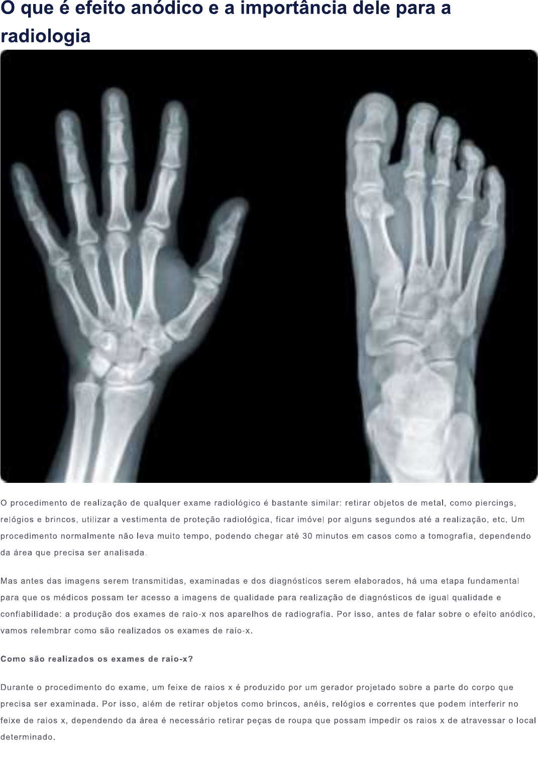 <p>o que é efeito anódico e a importância dele para a radiologia procedimento de realização de qualquer exame radiológico é bastante similar: retirar objetos de metal, como piercings, relógios e utilizar a vestimenta de proteção radiológica, ficar imóvel por alguns segundos até a realização, etc. Um procedimento normalmente não leva muito tempo, podendo chegar até 30 minutos em casos como a tomografia, dependendo da área que precisa ser analisada. Mas antes das imagens serem transmitidas, examinadas e dos diagnósticos serem elaborados, há uma etapa fundamental para que os médicos possam ter acesso a imagens de qualidade para realização de diagnósticos de igual qualidade e confiabilidade: a produção dos exames de raio-x nos aparelhos de radiografia. Por isso, antes de falar sobre o efeito anódico, vamos relembrar como são realizados os exames de raio-x. Como são realizados os exames de raio-x? Durante o procedimento do exame, um feixe de raios X é produzido por um gerador projetado sobre a parte do corpo que precisa ser examinada. Por isso, além de retirar objetos como brincos, anéis, relógios e correntes que podem interferir no feixe de raios X, dependendo da área é necessário retirar peças de roupa que possam impedir os raios X de atravessar o local determinado.</p><p>E não são somente objetos externos que influenciam na qualidade da imagem. Os raios-x que atravessam a área do corpo são capturados por um detector em filme fotográfico ou digital, para assim gerar a imagem que pode ser analisada. Mas isso não é igual para todas as áreas do corpo, pois a composição e a densidade de cada área também determina a quantidade de raios X que será absorvida. E aí que o efeito anódico se torna importante. Se as imagens de raio-x estão escuras e com qualidade ruim, pode haver um problema na execução do efeito anódico durante o procedimento. Então, vamos falar sobre ele! o que é e como se forma o efeito anódico? efeito anódico é um processo que ocorre no tubo de raio-x durante a realização do procedimento, sendo que o tubo de raio- X possui dois pólos: o pólo negativo, chamado catodo e o polo positivo, chamado anodo - no qual ocorre o efeito anódico. Durante a realização do procedimento de raio-x, os feixes de raio-x saem do tubo de raio-x pelo pólo catodo e anodo (cada um localizado em uma extremidade) com energias diferentes, sendo que o pólo anodo diminui a quantidade de radiação que sai dos feixes de raio-x naquele lado. Dessa forma, para que o efeito anódico ocorra, necessariamente antes precisa ocorrer a produção do raio-x. Essa variação provocada pelo efeito anódico resulta também na variação da densidade óptica da imagem que será formada no filme radiográfico. Ou seja, o efeito anódico tem responsabilidade direta na qualidade das imagens. Qual a importância do efeito anódico nas imagens de radiologia? Logo ali em cima no texto nós explicamos como a composição e a densidade da área do corpo podem influenciar na absorção do raio-x. Nesse sentido, cabe ao técnico de radiologia direcionar o lado do pólo anodo para a área menos espessa do corpo e o polo catodo para a área mais espessa e densa. Quer um exemplo? Imagine que você vai realizar um raio-x do pé. pé começa na região próxima ao tornozelo e termina na ponta dos dedos, dessa forma, o pólo anodo deve ser posicionado no lado correspondente aos dedos do pé, já que o tornozelo é uma área mais espessa e densa. Retomando a explicação até aqui de forma resumida: o pólo anodo diminui a quantidade de radiação emitida pelo tubo de raio-x, dessa forma, deve ser direcionado a área menos espessa do corpo. Na prática, quando acontece de uma imagem de raio-x sair com um lado mais escuro que o outro, pode ser consequência do técnico ter se equivocado quanto a aplicação do efeito anódico - direcionando-o para o lado errado. Isso faz com que menos radiação vá para a área espessa, dificultando a visualização de algo que já é naturalmente denso. Ou seja, o efeito anódico favorece a realização de uma imagem de boa qualidade e favorece que médicos tenham uma imagem segura para o diagnóstico.</p>
