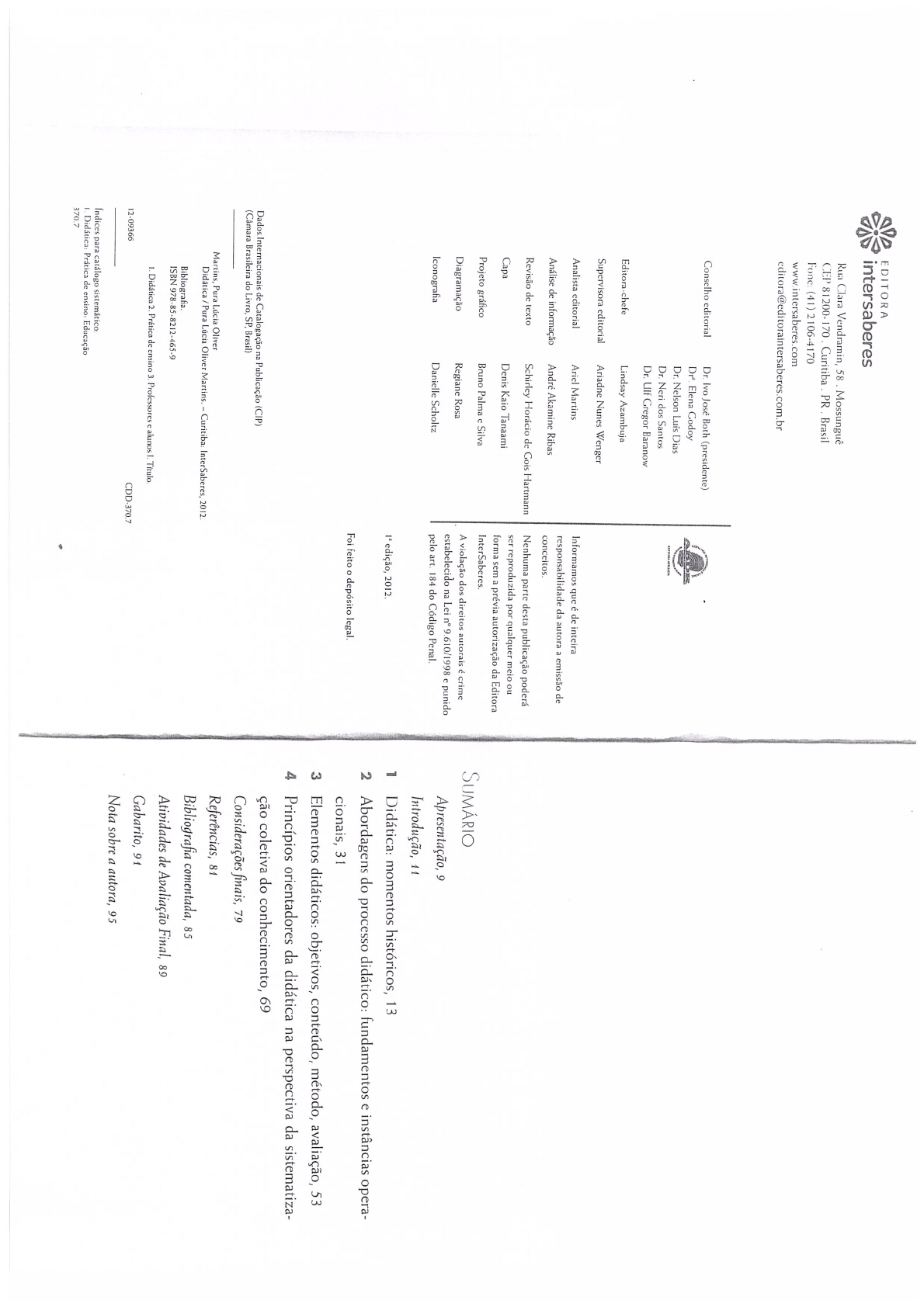 <p>EDITORA intersaberes Rua Clara 58 Mossunguê CEP 81200-170 Curitiba PR Brasil Fone: (41) 2106-4170 www.intersaberes.com Conselho editorial Dr. Ivo José Both (presidente) Dr. Elena Godoy Dr. Nelson Dias Dr. Neri dos Santos Dr. Gregor Baranow Editora-chefe Lindsay Azambuja Supervisora editorial Ariadne Nunes Wenger Analista editorial Ariel Martins Informamos que é de inteira responsabilidade da autora a emissão de Análise de informação Andre Akamine Ribas conceitos. Revisão de texto Schirley Horácio de Gois Hartmann Nenhuma parte desta publicação poderá ser reproduzida por qualquer meio ou Capa Denis Kaio Tanaami forma sem a prévia autorização da Editora Projeto gráfico Bruno Palma e Silva SUMÁRIO Diagramação Regiane Rosa A violação dos direitos autorais é crime estabelecido na Lei n° 9.610/1998 e punido Iconografia Apresentação, 9 Danielle Scholtz pelo art. 184 do Código Penal. Introdução, 11 edição, 2012. 1 Didática: momentos históricos, 13 2 Abordagens do processo didático: fundamentos e instâncias opera- Foi feito depósito legal. cionais, 31 3 Elementos objetivos, conteúdo, método, avaliação, 53 4 Princípios orientadores da didática na perspectiva da sistematiza- Dados Internacionais de Catalogação na Publicação (CIP) ção coletiva do conhecimento, 69 (Câmara Brasileira do Livro, SP, Brasil) Considerações finais, 79 Martins, Pura Lúcia Oliver Referências, 81 Didática / Pura Lúcia Oliver Martins. - InterSaberes, 2012. Bibliografia. Bibliografia comentada, 85 ISBN 978-85-8212-465-9 Atividades de Avaliação Final, 89 1. Didática 2. Prática de ensino 3. Professores e alunos I. Título. Gabarito, 91 12-09366 Nota sobre a autora, 95 Índices para catálogo Didática: Prática de Educação 370.7</p><p>Como se caracteriza a educação na década de 1970, quando se DIDÁTICA: MOMENTOS realiza o I Encontro Nacional de Professores de Didática (1972)? HISTÓRICOS O ensino exige a apreensão da realidade. Não 1.1 se pensa ensino desconectado de um contexto O ENCONTRO NACIONAL DE PROFESSORES social mais amplo. DE DIDÁTICA (1972) Veiga, 2004 I Encontro Nacional de Professores de Didática é realizado no Tratar do processo didático focalizando as for- período pós-1964, momento histórico caracterizado pelo esforço do Estado em racionalizar processo produtivo, tendo em vista a reto- mas e as práticas de interação entre professores mada do crescimento econômico e do desenvolvimento industrial. O e alunos como uma das dimensões da didática planejamento educacional é considerado "área prioritária", integrado implica resgatar o percurso da área situando-a ao Plano Nacional de Nesse período histórico, a nos diferentes momentos históricos. educação passa a ser vista como fator de desenvolvimento e, portanto, Um olhar sobre a história recente da didá- como investimento individual e social. tica no Brasil mostra que, nos últimos 35 anos, A orientação básica para modelo educacional que vai funda- esta tem sido questionada, sobretudo na déca- mentar as reformas do ensino superior e do ensino de 1° e 2° graus* da de 1980, quanto à sua função na formação centra-se na racionalização, na eficiência e na eficácia do processo. Há de educadores e à sua especificidade como área de conhecimento, buscando-se sua identidade. uma centralização normativa separando planejamento e execução. O trabalhador passa a ser estimulado individualmente por meio de dife- Nesse período histórico, há pelo menos dois renciação de salários, gratificações e é controlado pelos gestores** na marcos fundamentais. O I Encontro Nacional hierarquia da organização, os quais lhe transmitem as ordens numa de Professores de Didática, realizado em 1972 relação unilateral, de cima para baixo. na Universidade de Brasília, e I Seminário A As questões fundamentais colocadas nesse momento histórico são Didática em Questão, realizado na Pontifícia Universidade Católica do Rio de Janeiro, dez captadas pelos intelectuais que, em consonância com o contexto polí- tico-econômico e educacional do período, discutem a necessidade de anos depois.* formarum "novo professor", tecnicamente competente e comprometido Na atual legislação, o ensino de 1° e 2° graus é denominado respectivamente de ensino fundamental e ensino médio. Para mais informações, consultar Martins, 2003a, Gestores: classe intermediária entre capitalista e trabalhadores, que tem o papel p. 25-43. fiscalizador e controlador do processo de trabalho.</p><p>com O programa político-econômico do país. O documento final do As medidas de racionalização do processo de trabalho, tendo encontro destaca a "necessidade da integração dos professores de di- como central controle do tempo, implicam a centralização do dática no processo de expansão e atualização do ensino brasileiro" e processo produtivo em uma instância superior, externa ao trabalhador. ainda, como exigência, a formação "de um novo professor, cuja prepa- planejamento cuidadoso de todas as tarefas que deverão ser executa- ração didática seja embasada em conhecimento científico e vinculada das pelos trabalhadores passa a ser a questão central. Esse modelo fica às contingências nacionais" (Primeiro 1973, p. 153). expresso na didática do período, quando o planejamento passa a ocupar lugar de destaque nos seus manuais e programas de en- Como se caracteriza a formação do professor nesse período? O A racionalização do processo aparece como necessidade básica que é ser professor competente nesse momento histórico? para alcance dos objetivos do ensino. Com efeito, nessa fase, a formação do professor passa a fazer-se que acontecia no cenário político brasileiro quando se realizou por meio de treinamentos, nos quais são transmitidos os instrumentos I Seminário A Didática em Questão (1982)? Qual perfil do técnicos necessários à aplicação do conhecimento científico, fundado n