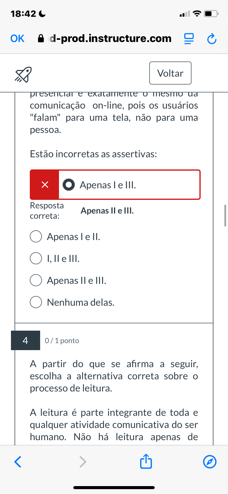<p>18:42 OK d-prod.instructure.com Voltar pr esencial e O mesmo comunicação on-line, pois os usuários "falam" para uma tela, não para uma pessoa. Estão incorretas as assertivas: X O Apenas e III. Resposta Apenas e III. correta: Apenas e II. I, e III. Apenas II e III. Nenhuma delas. 4 0/1 ponto A partir do que se afirma a seguir, escolha a alternativa correta sobre o processo de leitura. A leitura é parte integrante de toda e qualquer atividade comunicativa do ser humano. Não há leitura apenas de</p>