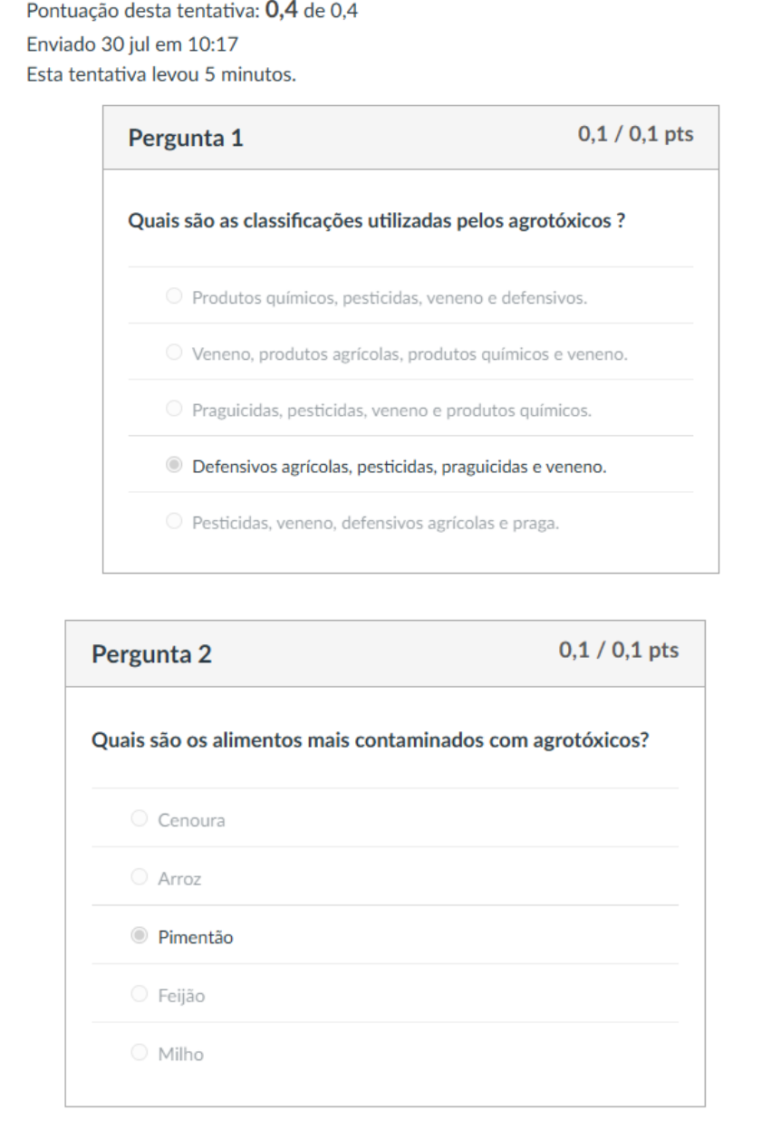 <p>Pontuação desta tentativa: 0,4 de 0,4 Enviado 30 jul em 10:17 Esta tentativa levou 5 minutos. Pergunta 1 0,1 / 0,1 pts Quais são as classificações utilizadas pelos agrotóxicos ? Produtos químicos, pesticidas, veneno e defensivos. Veneno, produtos agrícolas, produtos químicos e veneno. Praguicidas, pesticidas, veneno e produtos químicos. Defensivos agrícolas, pesticidas, praguicidas e veneno. Pesticidas, veneno, defensivos agrícolas e praga. Pergunta 2 0,1 / 0,1 pts Quais são os alimentos mais contaminados com agrotóxicos? Cenoura Arroz Pimentão Feijão Milho</p><p>Pergunta 3 0,1 / 0,1 pts Quais são os contaminantes inorgânicos? Chumbo, Flúor, Cálcio e Acetona Mercúrio, Chumbo, Arsênio e Cádmio Cálcio, Chumbo, Arsênio e Cádmio Fluoreto, Chumbo, Arsênio e Acetona Acetileno, Chumbo, Flúor e Acetato</p><p>Pergunta 4 0,1 / 0,1 pts A exposição humana sobre o cádmio ocorre através de quais alimentos? Moluscos e Crustáceos Verduras e legumes Carne bovina e peixe Verduras e Frutas Frutas e Verduras Pontuação do teste: 0,4 de 0,4 Próximo</p>