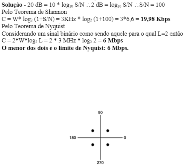 <p>1º Semestre de 2021</p><p>Redes 1</p><p>2º Lista de Exercícios – referente ao capítulo 2</p><p>1) Se um sinal binário for enviado sobre um canal de 3 kHz cuja relação</p><p>sinal/ruído é de 20 dB, qual será a taxa máxima de dados que poderá ser</p><p>alcançada?</p><p>Uma relação sinal/ruído igual a 20 dB significa S/N=100. Tendo em vista que</p><p>log2 101 é aproximadamente igual a 6,658, o limite de Shannon é cerca de</p><p>19.975 kbps. O limite de Nyquist é de 6 Kbps. Portanto, o gargalo é o limite de</p><p>Nyquist, que resulta em uma capacidade máxima de canal de 6 kbps.</p><p>2) Um diagrama de constelação de modems semelhante ao da Figura 1 tem</p><p>quatro pontos de dados nas seguintes coordenadas: (1,1), (1,-1), (-1,1) e (-1,-</p><p>1). Quantos bps um modem com esses parâmetros pode alcançar a uma</p><p>taxa de transmissão de 1.200 bauds?</p><p>Figura 1: Constelação</p><p>3) Dez sinais, cada um exigindo 4000 Hz, são multiplexados em um único canal</p><p>utilizando FDM. Qual é a largura de banda mínima exigida para o canal</p><p>multiplexado? Suponha que as bandas de proteção tenham 400 Hz de</p><p>largura.</p><p>4) Sejam as opções de componentes e os respectivos custos conforme a figura</p><p>2. Assuma que a rede em questão é Gigabit Ethernet (1G bps).</p><p>Figura 2: Planilha</p><p>Considerando em primeiro lugar a viabilidade técnica e em segundo lugar a</p><p>redução de custos, indique a melhor opção para conexão de acordo com o comprimento</p><p>do trecho.</p><p>a) Trecho de 50 metros.</p><p>O cabo UTP Cat5e pode transmitir até 1Gbps e apresenta melhor custo-benefício para</p><p>este caso, logo:</p><p>Cabo UTP Cat5e (R$230) + [2*(Conector UTP Cat5e (R$1,50))] = 230 + 3 = R$233</p><p>Porém o rolo possui 305m e serão usados somente 50m, que equivalem a 16,4% do</p><p>comprimento do rolo. Sendo assim: (230*0,164) + 3 = R$40,70.</p><p>b) Trecho de 1000 metros.</p><p>Embora o uso do cabo UTP Cat5e seja mais em conta, para este projeto o único modo</p><p>viável utilizar a fibra ótica. Entre as opções multimodo e monomodo, a monomodo se</p><p>apresenta mais barata.</p><p>Fibra monomodo + 2 conectores + 2 conversores opto-elétrico monomodo (Laser).</p><p>Sendo assim: R$1300 + 2*R$7,00 + 2*R$320 = R$1954</p><p>Foram desprezados os custos com as emendas das fibras (4 emendas) e mão de obra.</p><p>5) Com relação ao item (a) da questão 1 (isto é, para um trecho de 50 metros),</p><p>a opção escolhida por você irá representar uma economia de quantos % em</p><p>comparação à opção mais custosa. Demonstre como você chegou a esse</p><p>valor.</p><p>6) O layout real de células raramente e tão regular quanto o da Figura 3.</p><p>Mesmo as formas de células individuais em geral são irregulares. Apresente</p><p>uma razão possível para isso.</p><p>Figura 3: Layout da célula no sistema de comunicações celular</p><p>O layout real da propagação de sinal é esférico, para que não haja espaços sem</p><p>cobertura de sinal, há uma aproximação dos núcleos, para que a sobreposição de</p><p>sinal cubra os “gaps” que seriam formados. Dessa forma, usam-se layouts para</p><p>exemplificar a cobertura sem exibir a sobreposição, onde as linhas são as</p><p>fronteiras de melhor servidor. O padrão hexagonal é usado para macro-células e</p><p>o padrão de quadrados é usado para micro-células.</p><p>7) Seja o seguinte modelo sistêmico para cálculo de link budget ótico.</p><p>Figura 4: modelo sistêmico para cálculo de link budget ótico</p><p>E sejam os parâmetros a seguir:</p><p>Comprimento do cabo ótico: 2,0 km.</p><p>Atenuação na fibra: 1,0 dB/km (fibra multimodo operando a = 1,3m).</p><p>Perdas em conectores: 0,5 dB por conexão.</p><p>Perdas por emenda (splice): 0,2 dB por emenda.</p><p>Potência do transmissor: 18 dBm.</p><p>Sensibilidade do receptor: -31 dBm.</p><p>a) Para que o sistema funcione, qual é a máxima perda admissível no caminho de</p><p>transmissão?</p><p>b) Considere os parâmetros apresentados, e adicione uma margem de segurança de 3 dB</p><p>ao valor calculado no item (a). Qual é a folga (link lossmargin) que o sistema</p><p>apresentado oferece?</p><p>8) Um satélite geoestacionário transmite uma potência de 2 W por meio de</p><p>uma antena, com ganho de 17 dB, em relação à antena isotrópica.</p><p>Considere a antena transmissora do satélite e a receptora na superfície</p><p>terrestre perfeitamente alinhadas. As perdas envolvidas nesse enlace, são de</p><p>210 dB, e o ganho da antena receptora, em relação à antena isotrópica, é de</p><p>52 dB. A potência recebida, em dBW, é?</p>